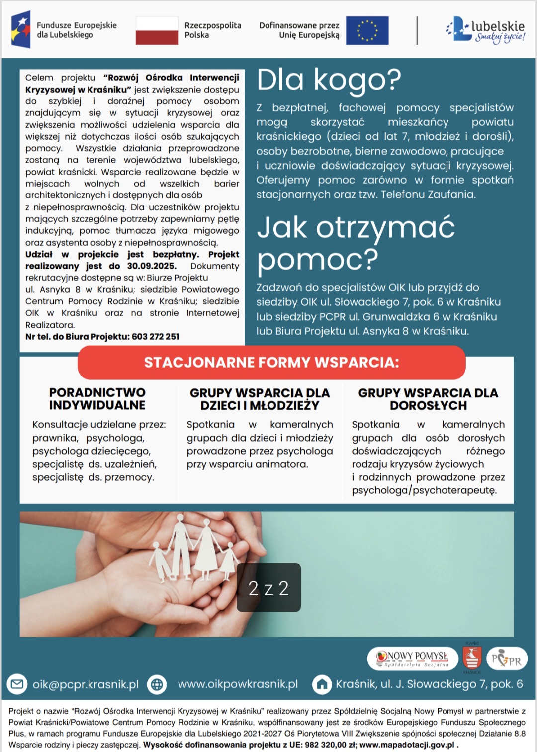 Więcej informacji można uzyskać w biurze projektu przy ulicy Adama Asnyka 8, 23-204 Kraśnik, w Powiatowym Centrum Pomocy Rodzinie w Kraśniku, na stronie internetowej www.pcpr.krasnik.pl oraz pod numerem telefonu 603 272 251.