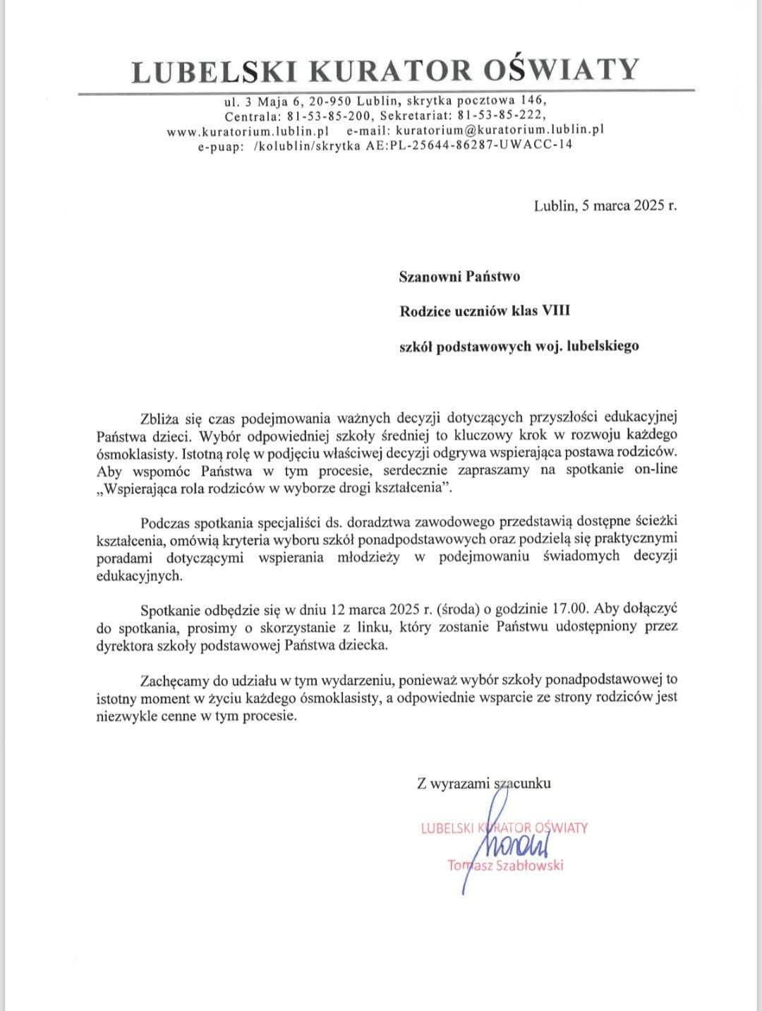 Uprzejmie informujemy, że w Lubelski Kurator Oświaty po raz kolejny podejmuje działanie służące wsparciu rodziców uczniów klas VIII w zakresie decyzji dotyczących przyszłości edukacyjnej ich dzieci, to jest wyboru szkoły średniej i procesu rekrutacji.