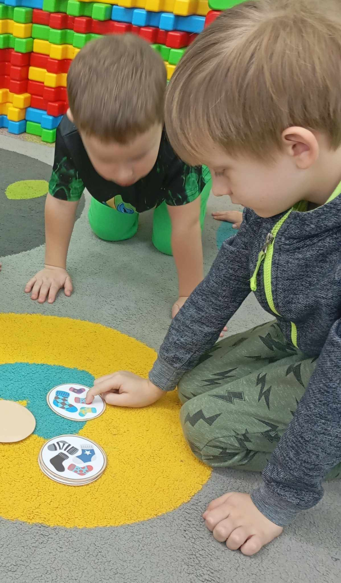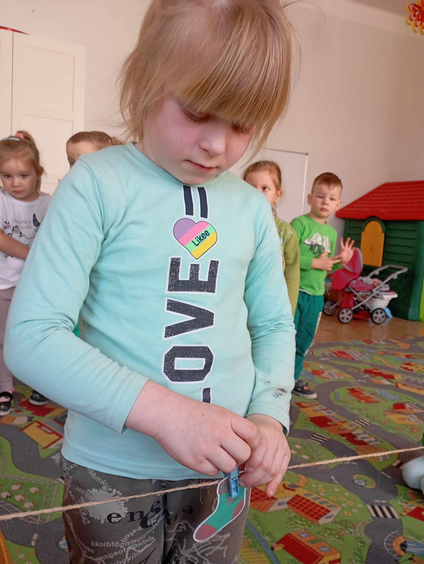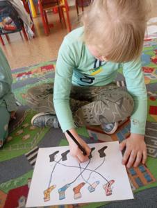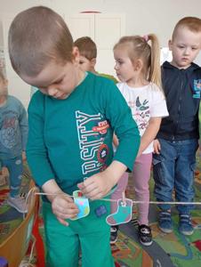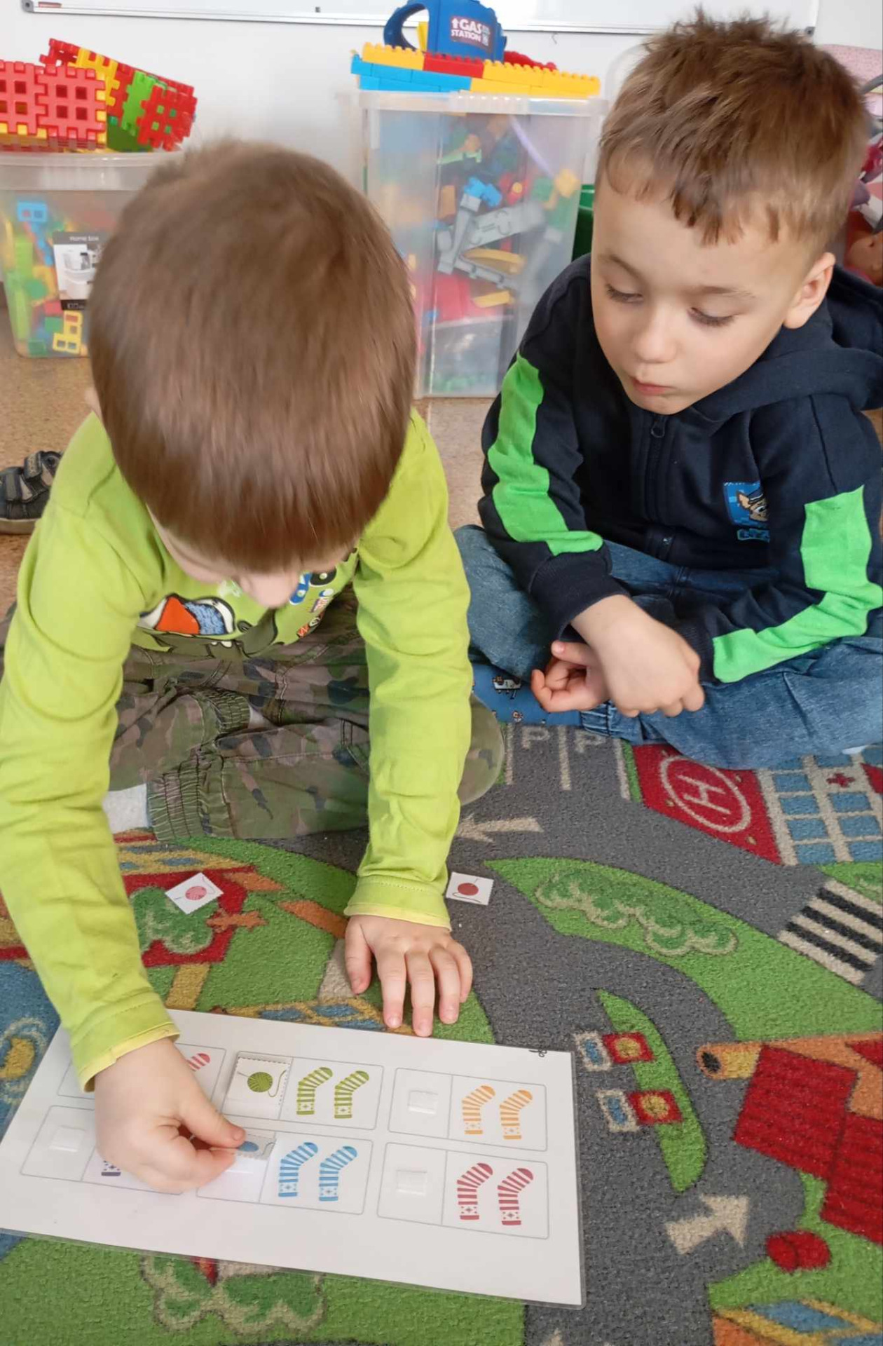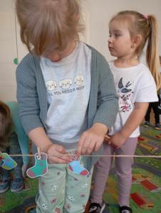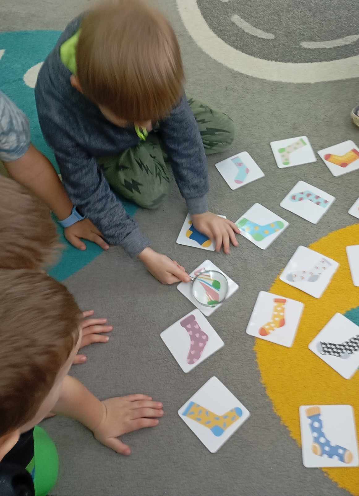 Dzieci z wielkim zaangażowaniem uczestniczyły również w zabawach, które uczyły współpracy, wzajemnego zrozumienia oraz wzmacnianie relacji w grupie. Zmierzyły się z dobieraniem i łączeniem w pary, szukaniem cienia skarpetek, poprawianiem po śladzie. Rozwieszały również „skarpetkowe” pranie, grały dobble i jak prawdziwi detektywi, wyszukiwały skarpetek po opisie.
