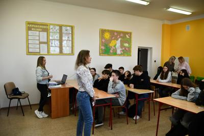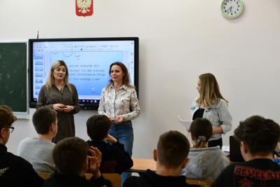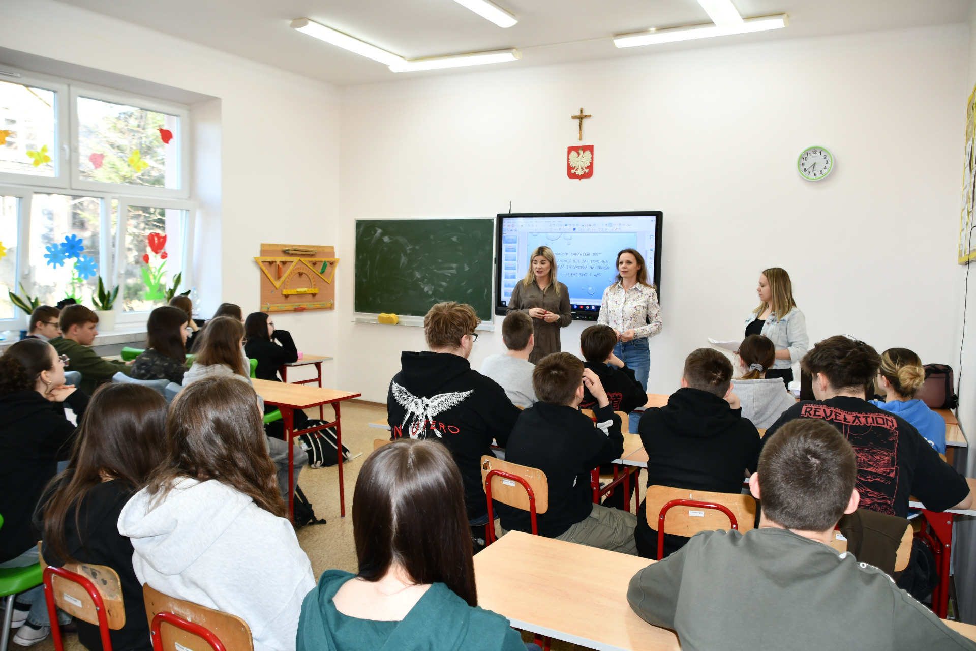 Dnia 3 kwietnia 2025 roku uczniowie klas VII i VIII uczestniczyli w spotkaniu z Panią Katarzyną Kapicą – doradcą zawodowym oraz pośrednikiem pracy - Panią Agatą Kośniewską z Młodzieżowego Centrum Kariery OHP w Kraśniku.