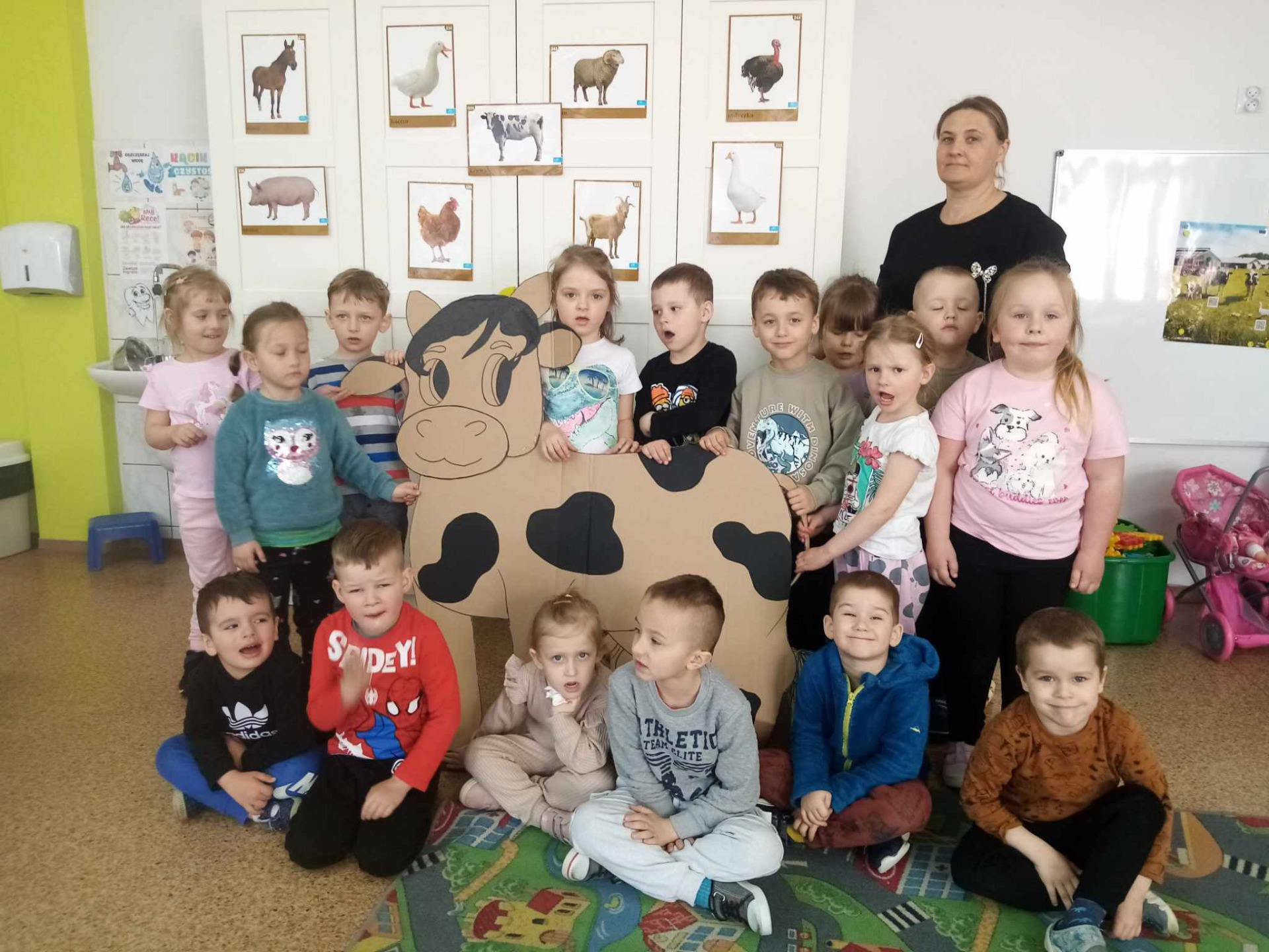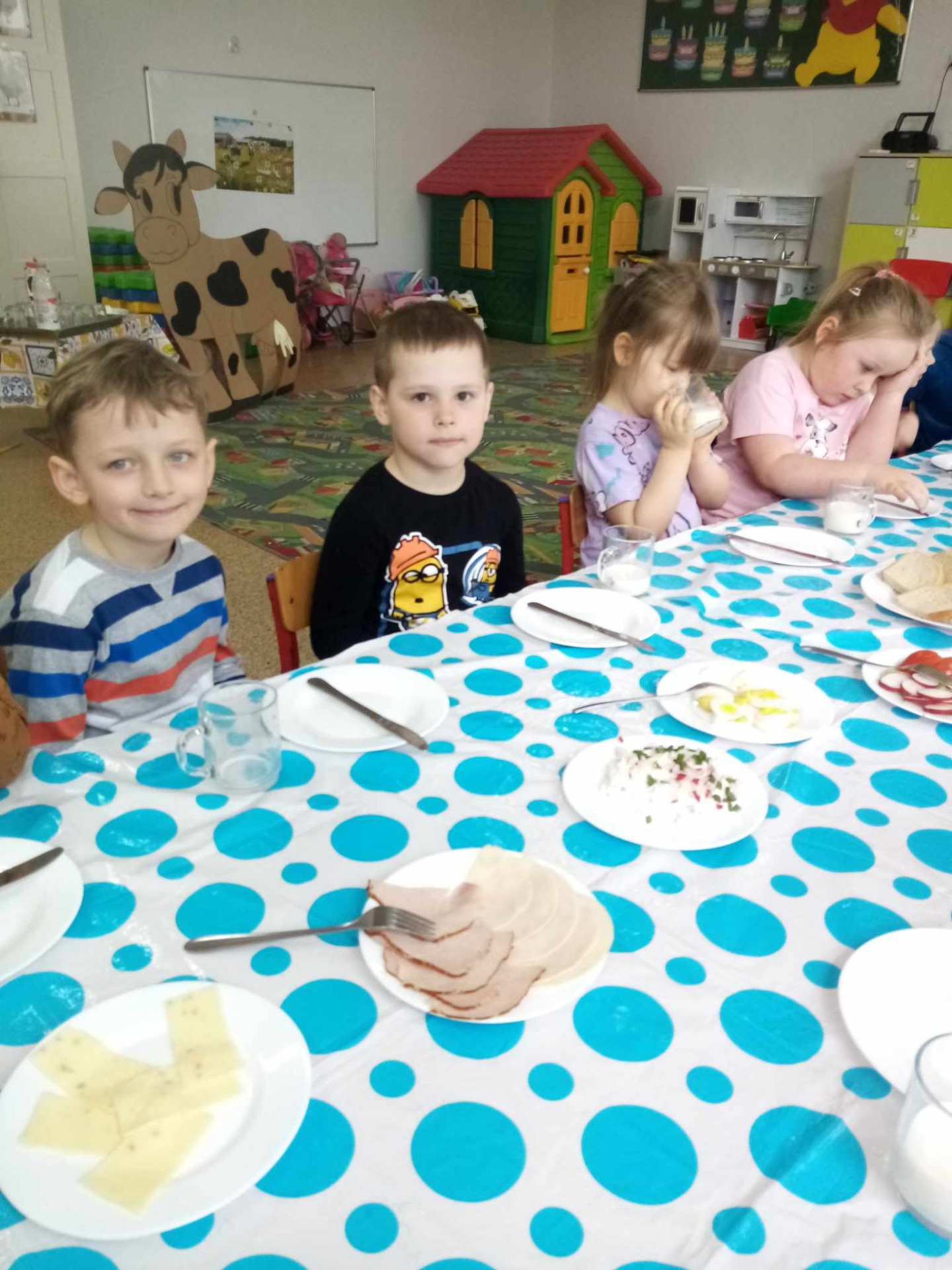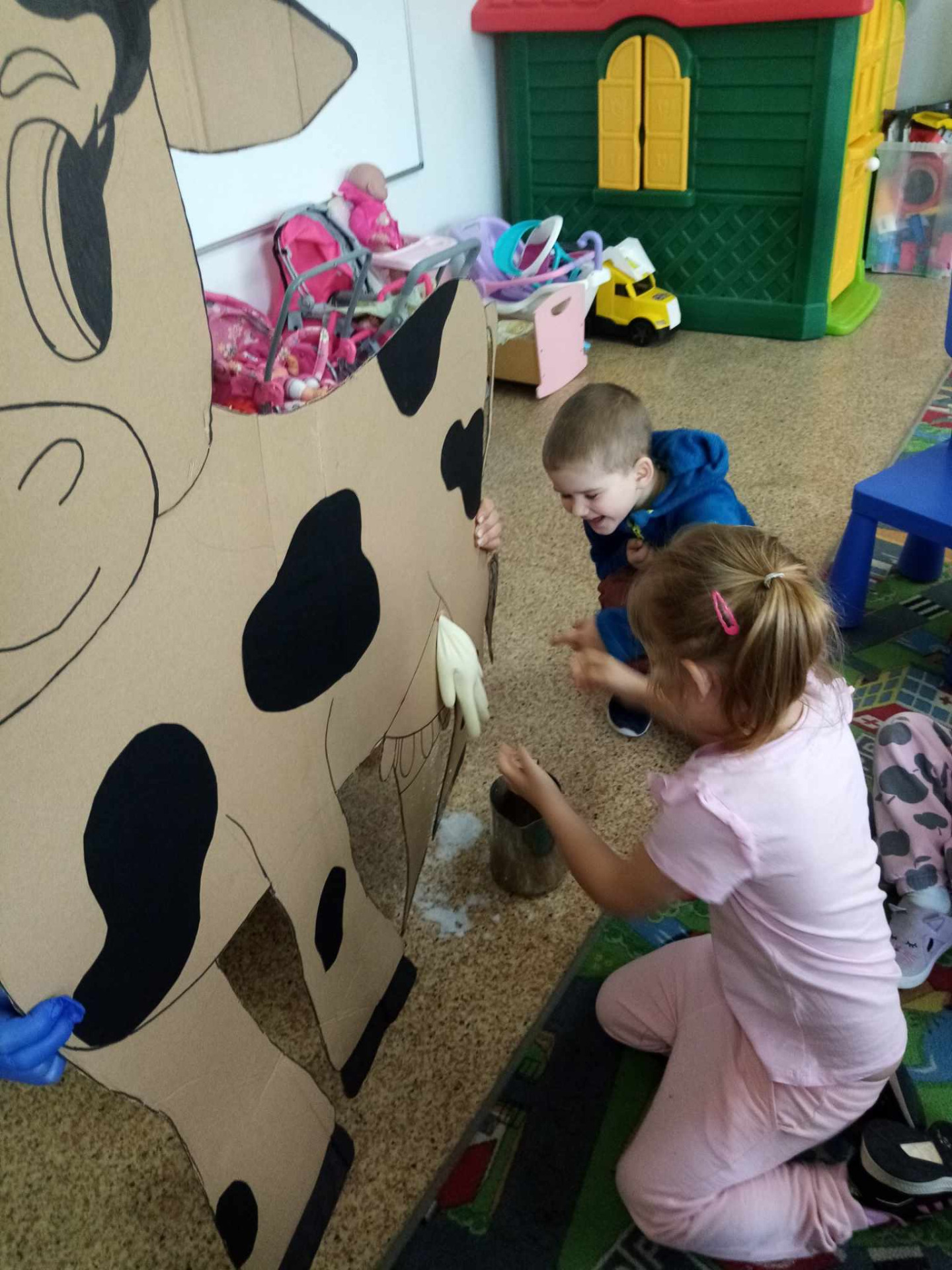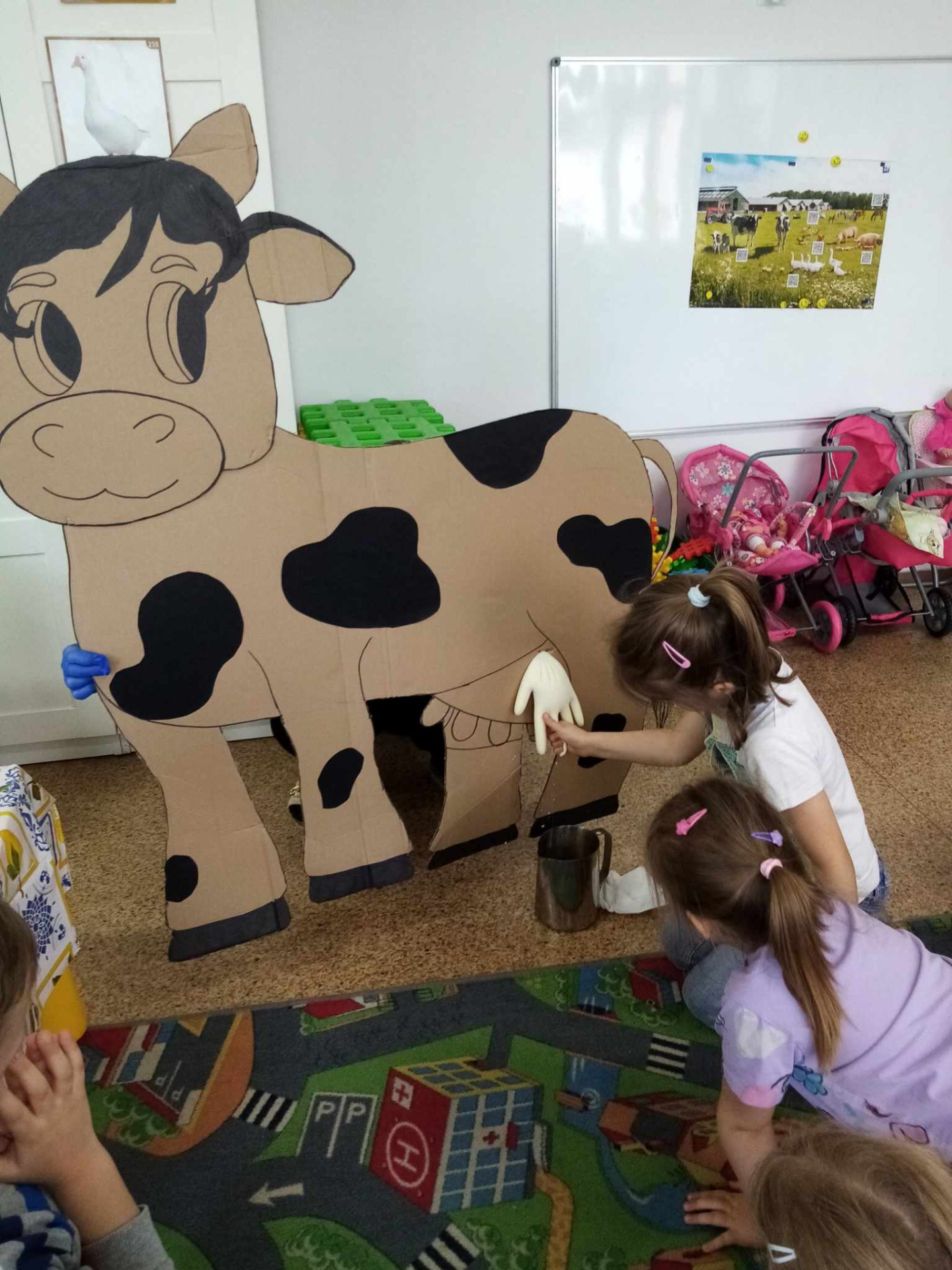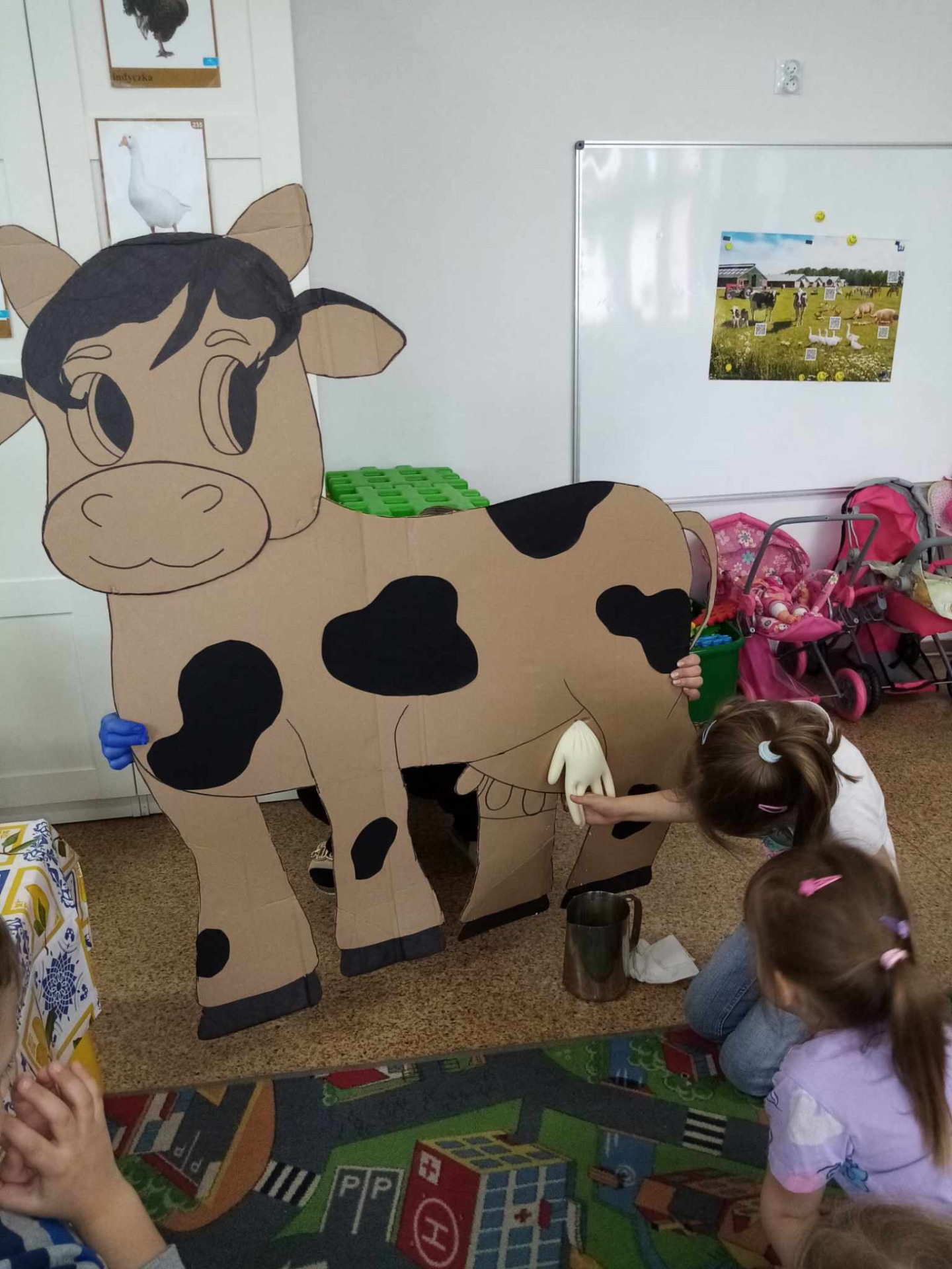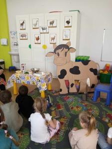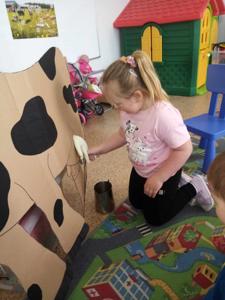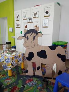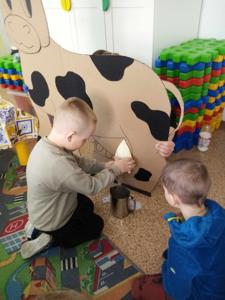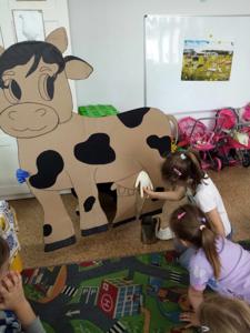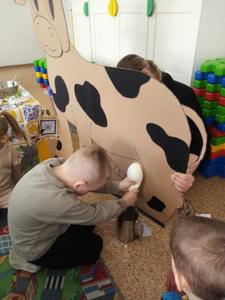 Główną atrakcją była jednak... sylweta krowy, którą dzieci mogły "wydoić"! Było przy tym mnóstwo śmiechu, zabawy i nauki – przedszkolaki dowiedziały się, skąd bierze się mleko, jak wygląda praca na wsi i jak powstają znane im produkty spożywcze.