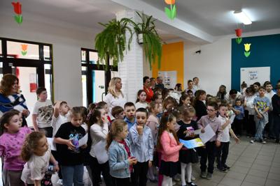 Pani Dyrektor złożyła wszystkim serdeczne życzenia z okazji Świąt Wielkanocnych, nie zapominając także o tradycyjnym "mokrym" akcencie – z humorem i uśmiechem złożyła życzenia wesołego śmigusa-dyngusa i symbolicznie polała maluchy wodą z kolorowej psikawki, wywołując przy tym wiele radości!