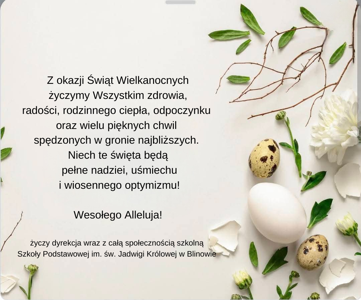 Z okazji Świąt Wielkanocnych życzymy Wszystkim zdrowia, radości, rodzinnego ciepła, odpoczynku oraz wielu pięknych chwil spędzonych w gronie najbliższych. Niech te święta będą pełne nadziei, uśmiechu i wiosennego optymizmu!