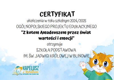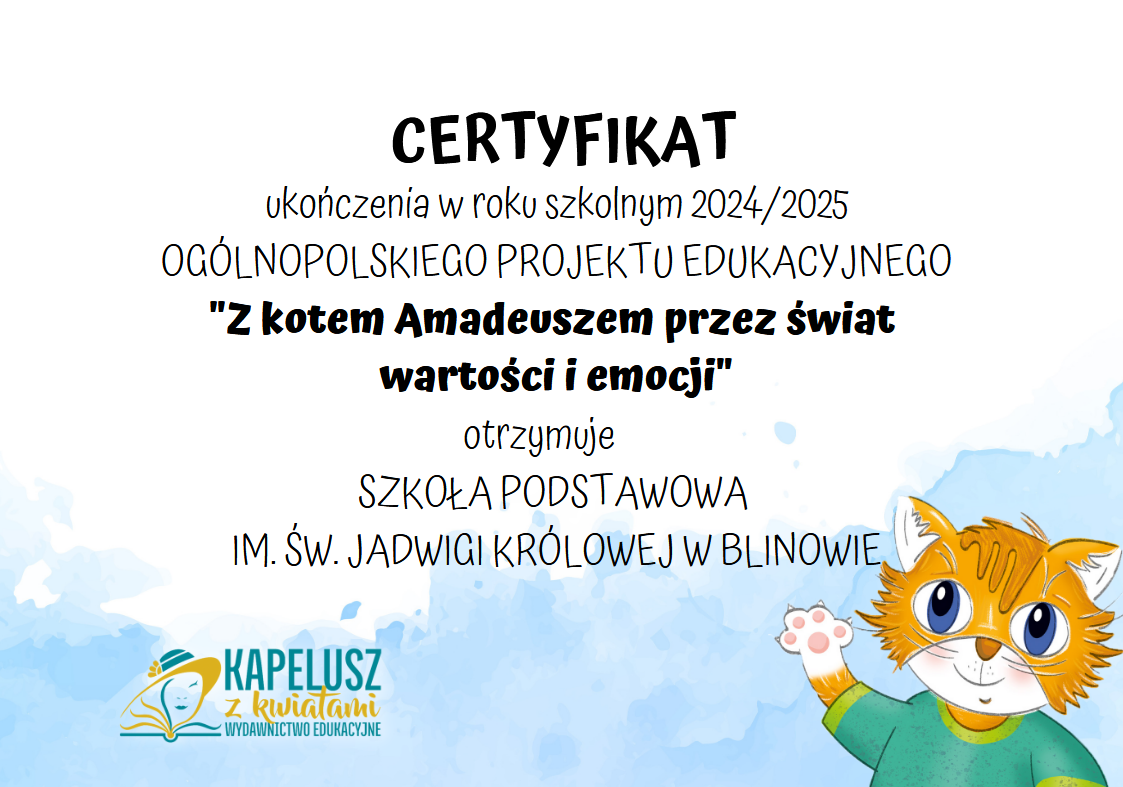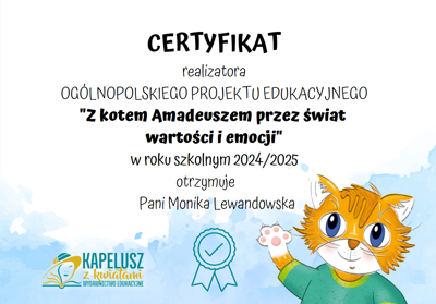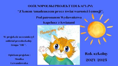 W roku szkolnym 2024/2025 uczniowie oddziału przedszkolnego z grupy „0B” wzięli udział w ogólnopolskim projekcie edukacyjnym „Z kotem Amadeuszem przez świat wartości i emocji” realizowanym pod patronatem Wydawnictwa Kapelusz z Kwiatami. Projekt miał na celu wspieranie rozwoju emocjonalnego i społecznego dzieci oraz budowanie postaw opartych na wartościach takich jak przyjaźń, uczciwość, szacunek, empatia czy odpowiedzialność.