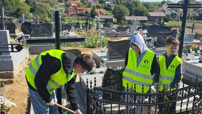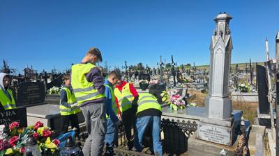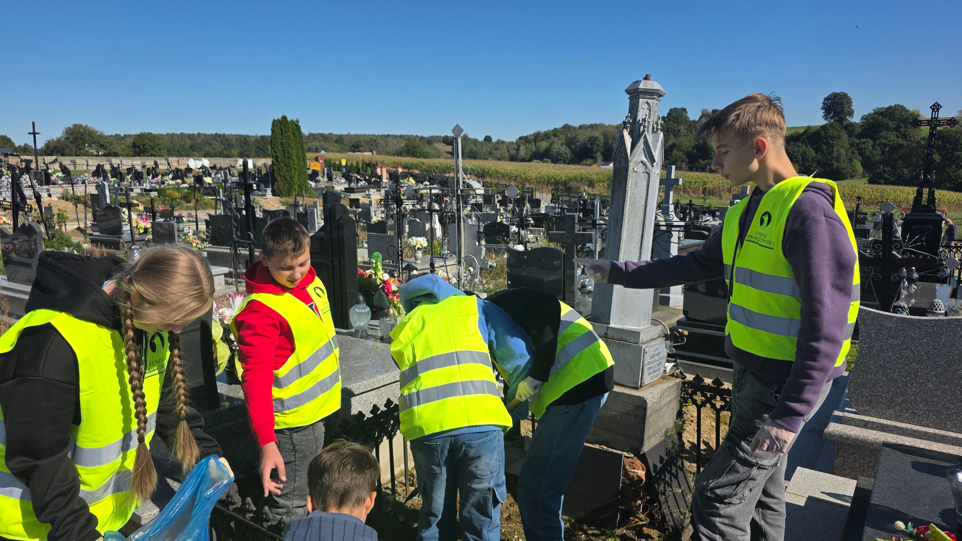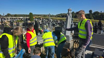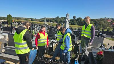 Uczniowie z zaangażowaniem zbierali śmieci, dbając o to, by miejsce spoczynku nabrało należnej godności i porządku.