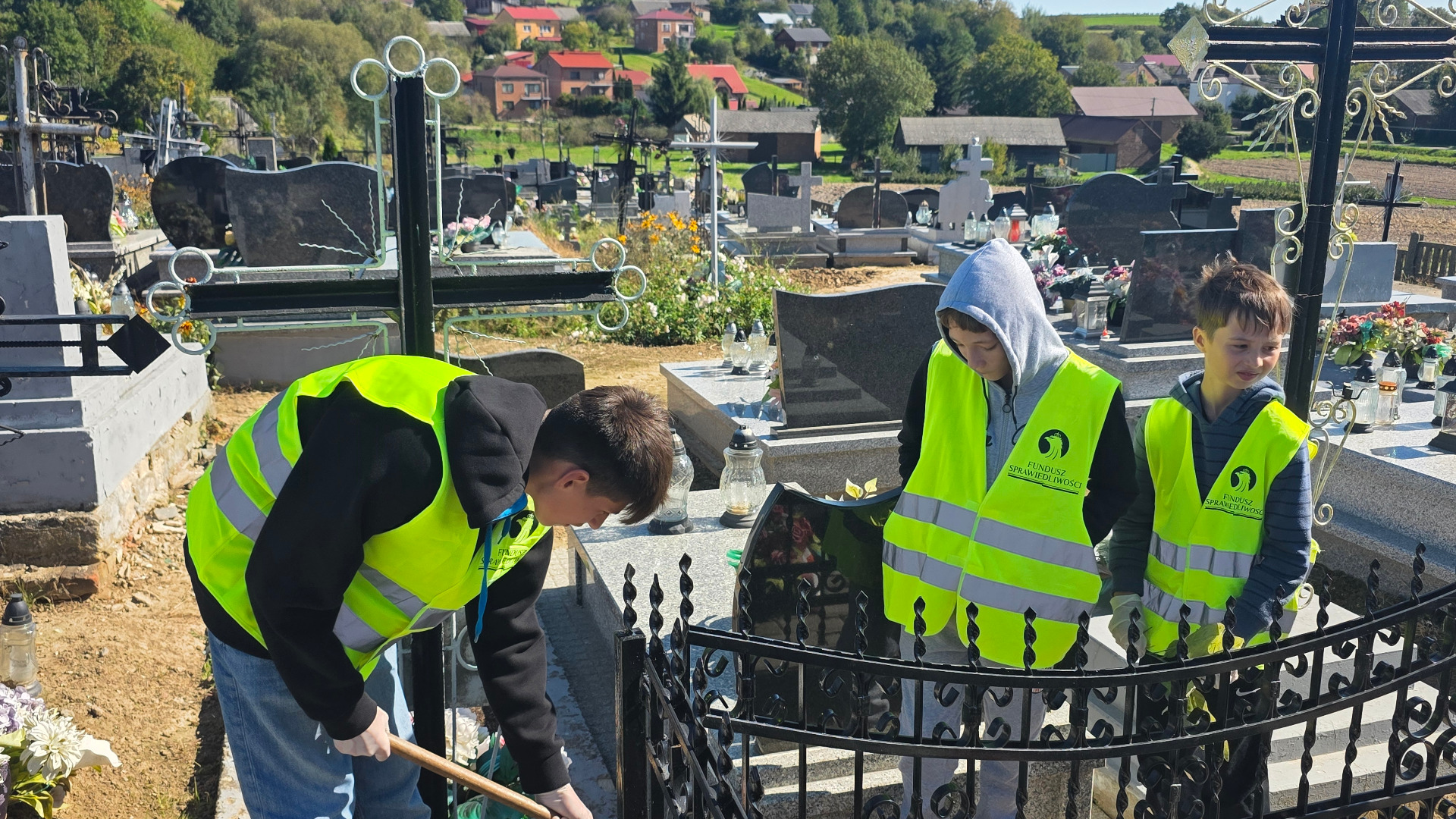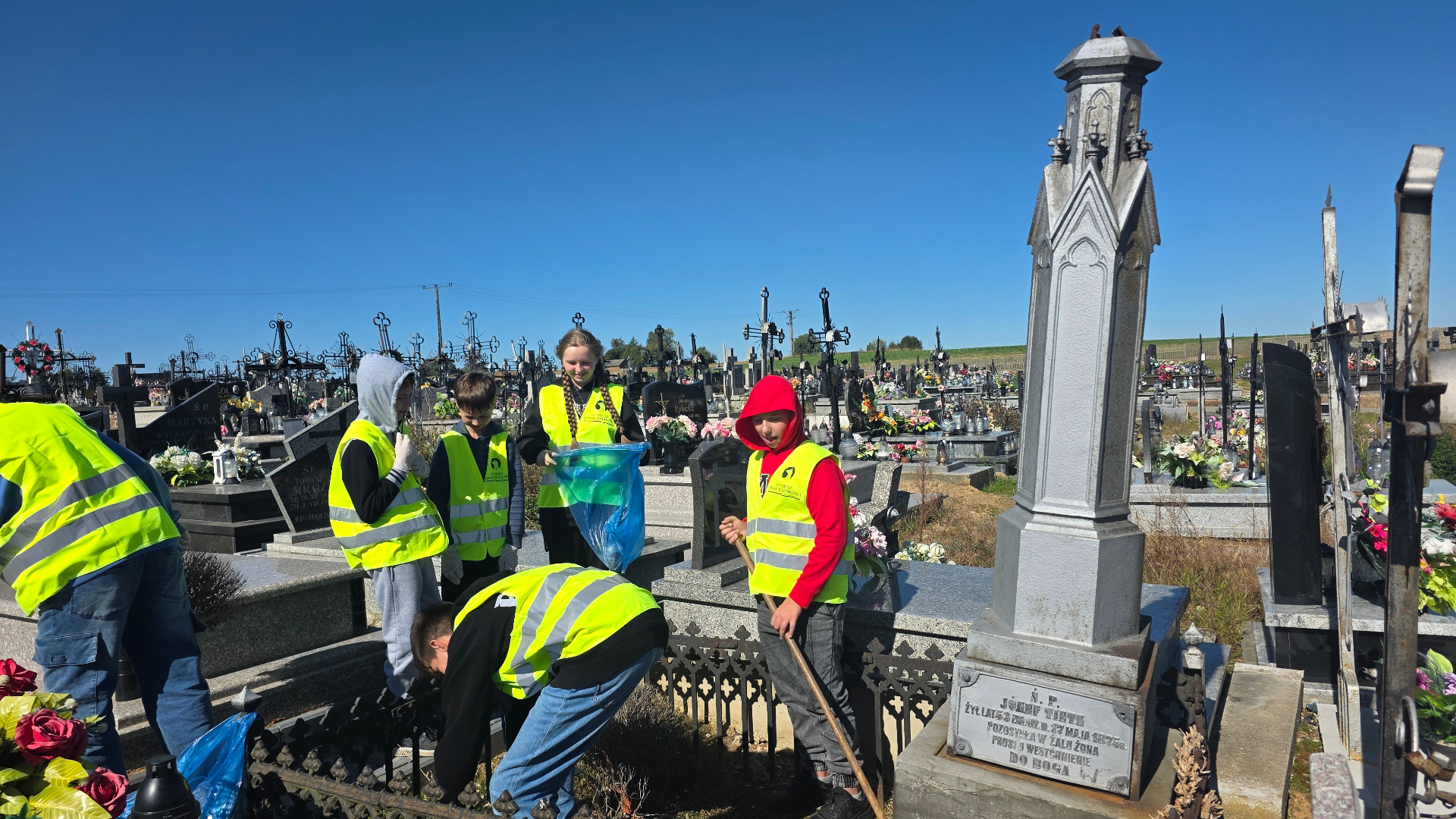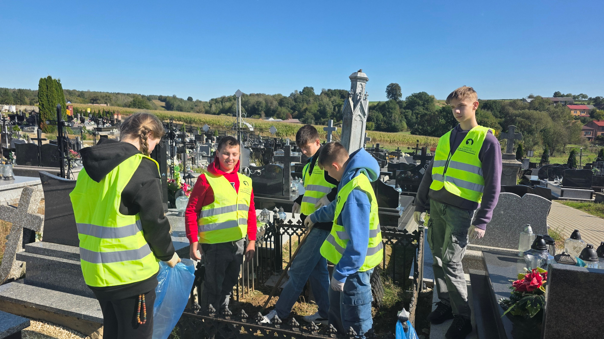 W ramach akcji Sprzątania Świata uczniowie klasy 7 wraz ze swoją wychowawczynią, Panią Marzeną Kwiatkowską, 25 września 2025 roku podjęli się porządkowania miejscowego cmentarza - łącząc troskę o środowisko z pamięcią i szacunkiem dla tych, którzy odeszli.