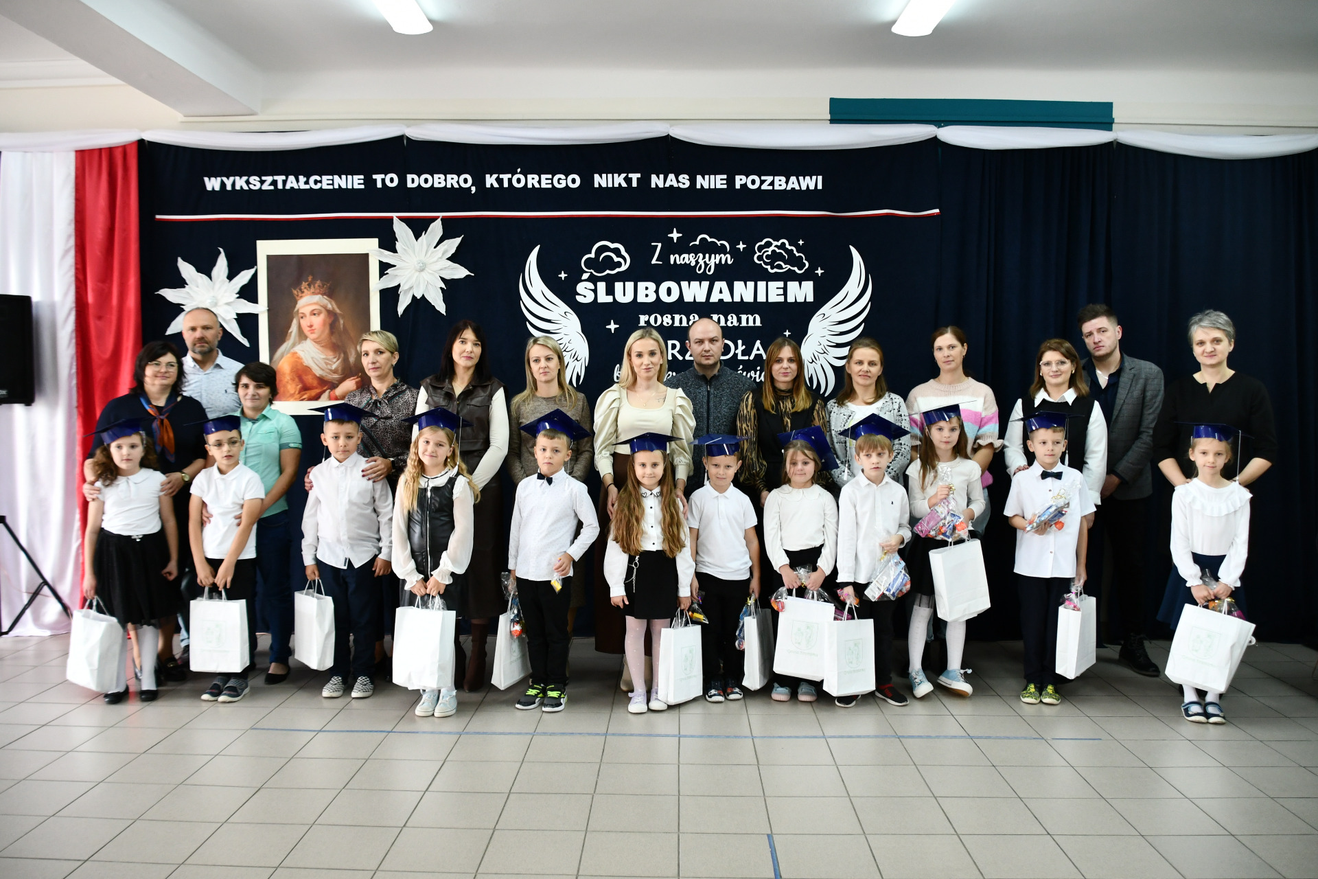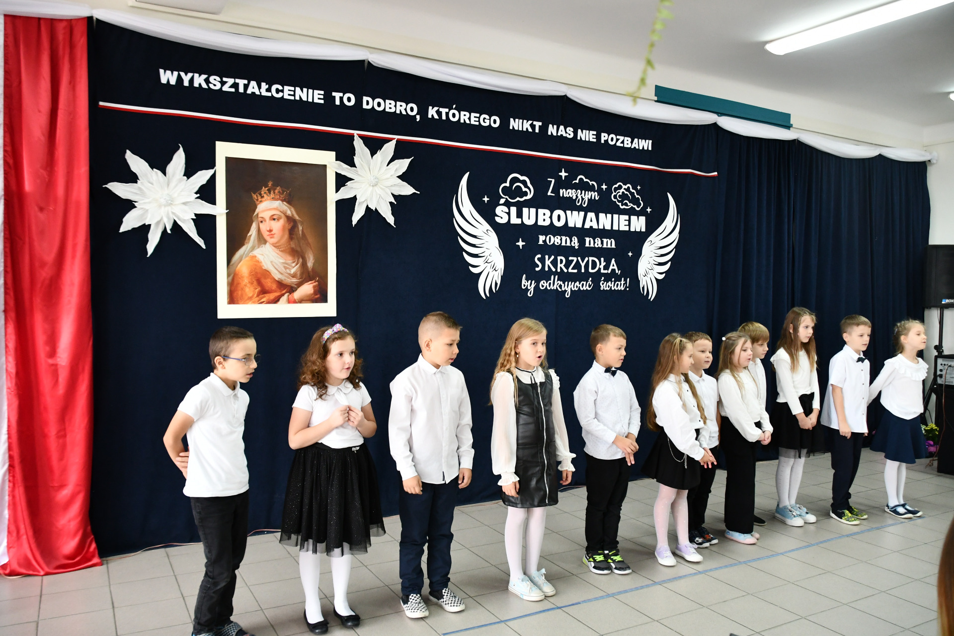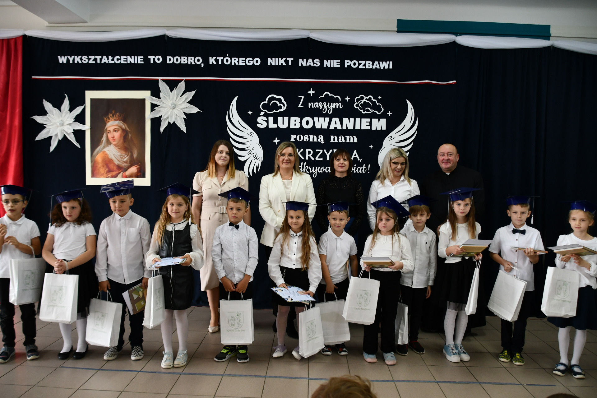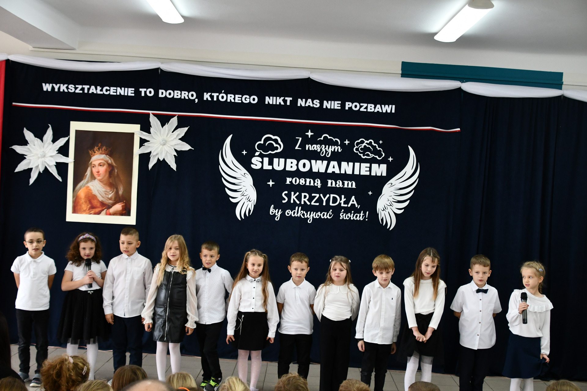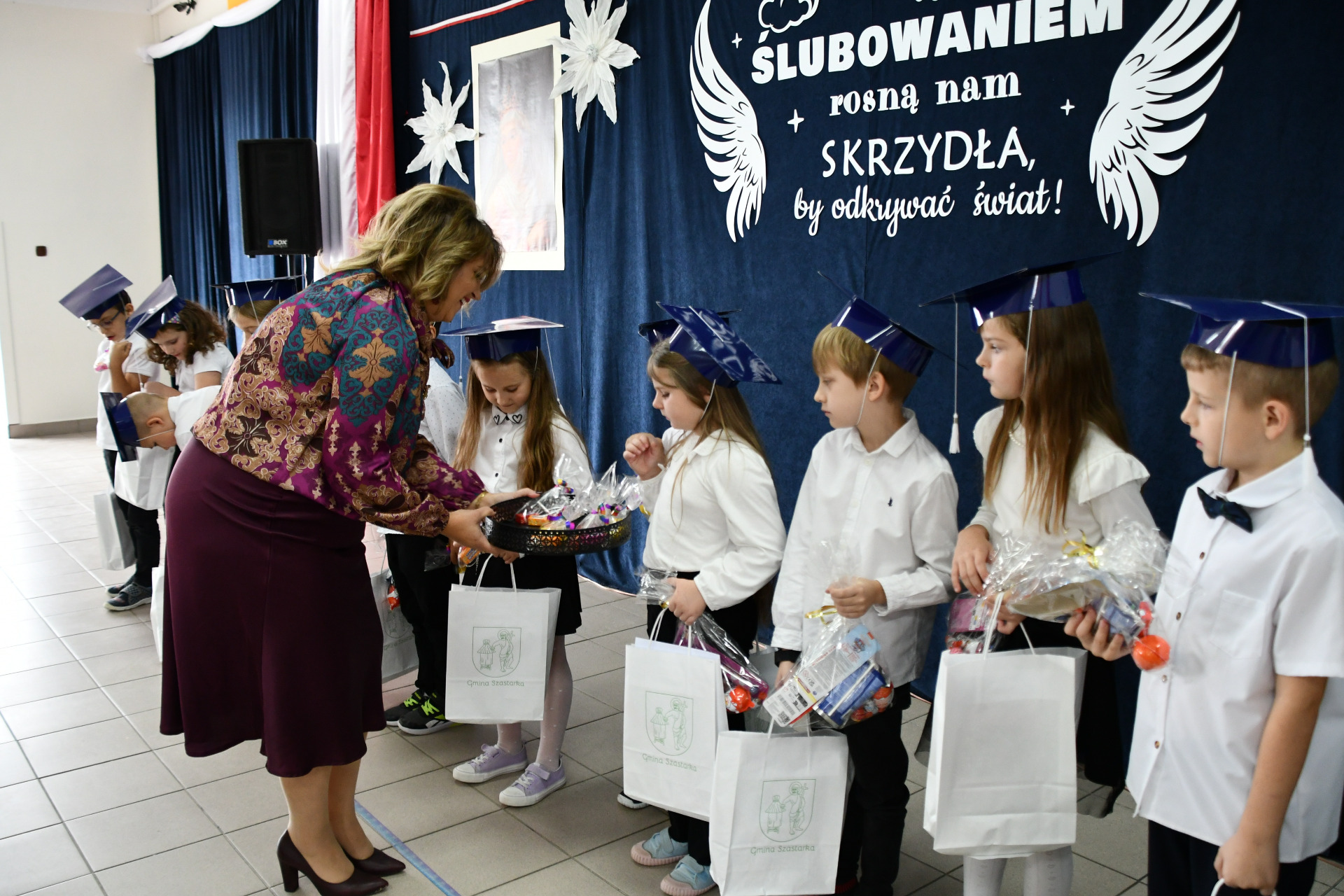 Najważniejszym momentem uroczystości było ślubowanie pierwszoklasistów przed sztandarem szkoły. Następnie Pani Dyrektor dokonała aktu pasowania niebieskim ołówkiem, przyjmując dzieci do grona uczniów Szkoły Podstawowej im. św. Jadwigi Królowej w Blinowie. Dopełnieniem tej podniosłej chwili było przejście uczniów przez symboliczną Bramę Wiedzy. Na pamiątkę wszyscy uczniowie dostali książeczki oraz dyplomy pasowania na ucznia. Pani Wójt Elżbieta Kowalczyk również życzyła dzieciom samych sukcesów oraz wręczyła im upominki. Rodzice także sprawili swoim dzieciom miłe niespodzianki. Po pamiątkowej sesji zdjęciowej wszyscy udali się do klasy na słodki poczęstunek.