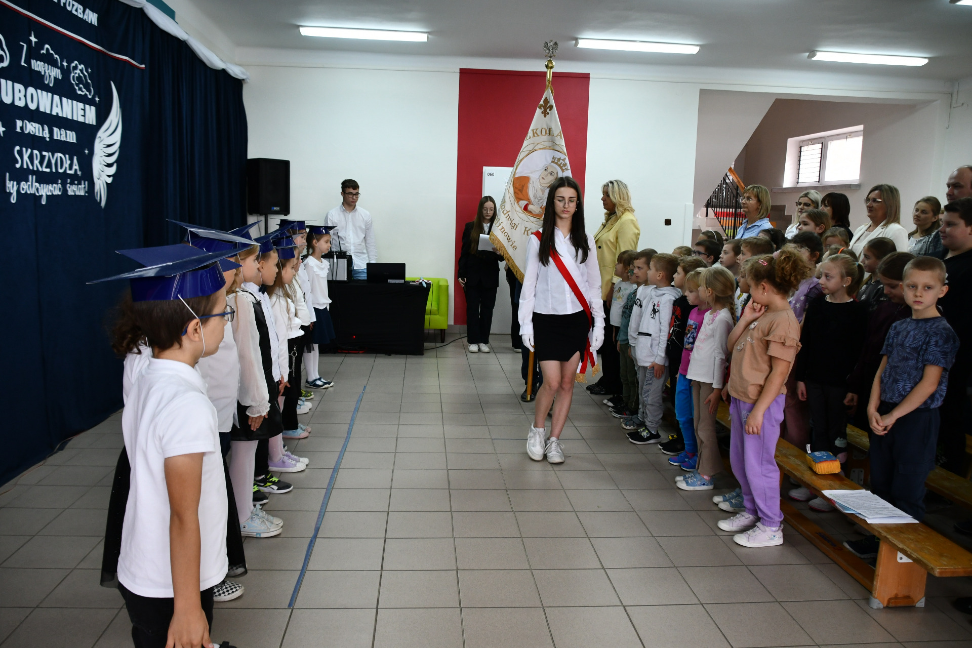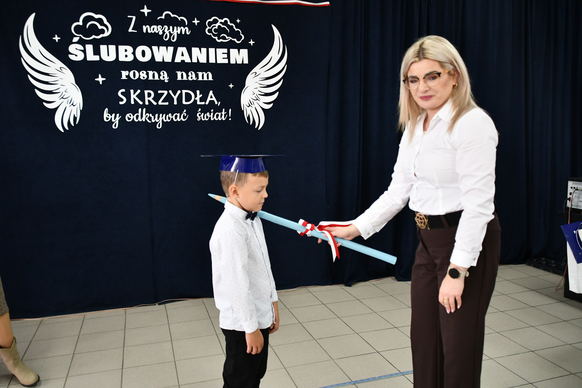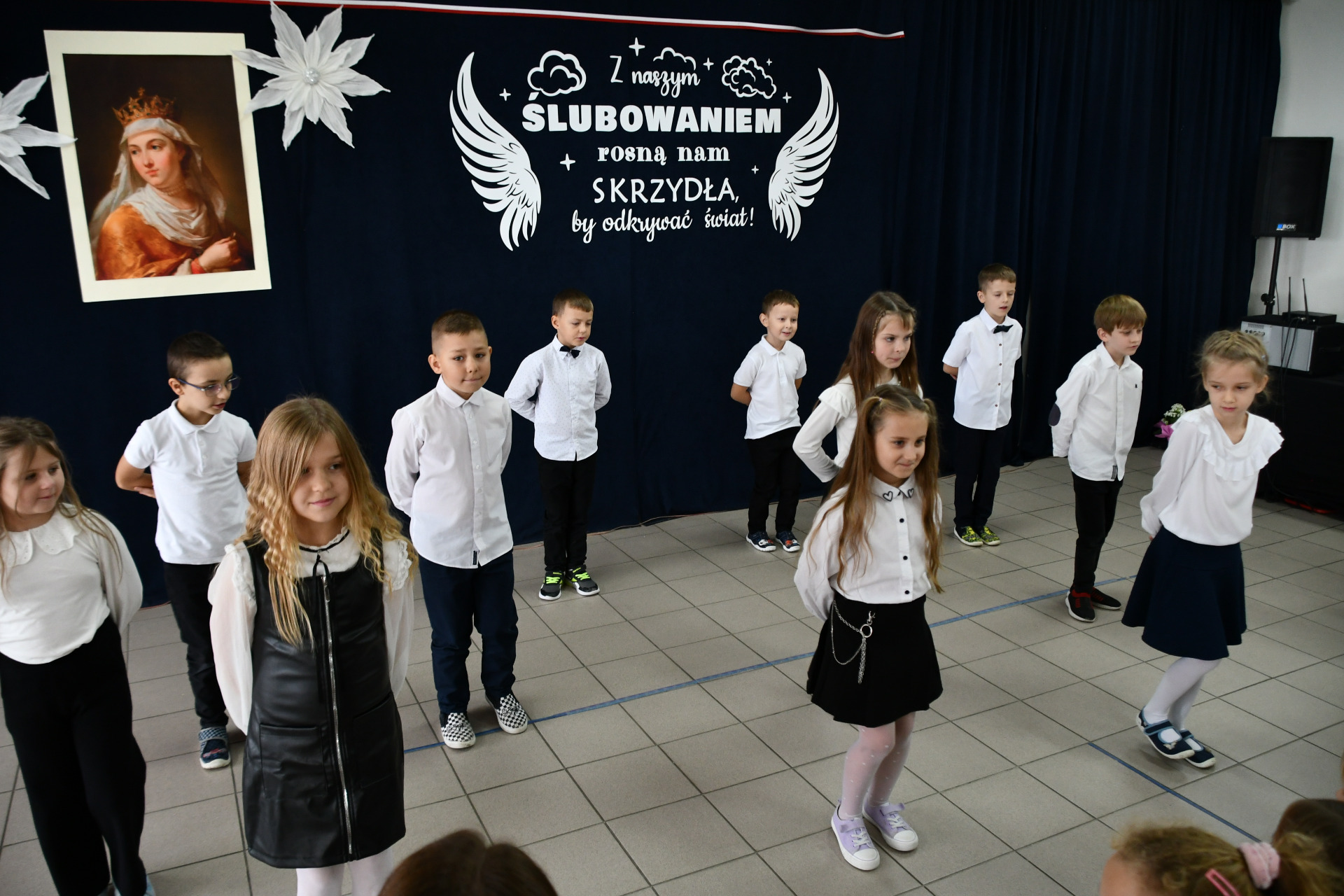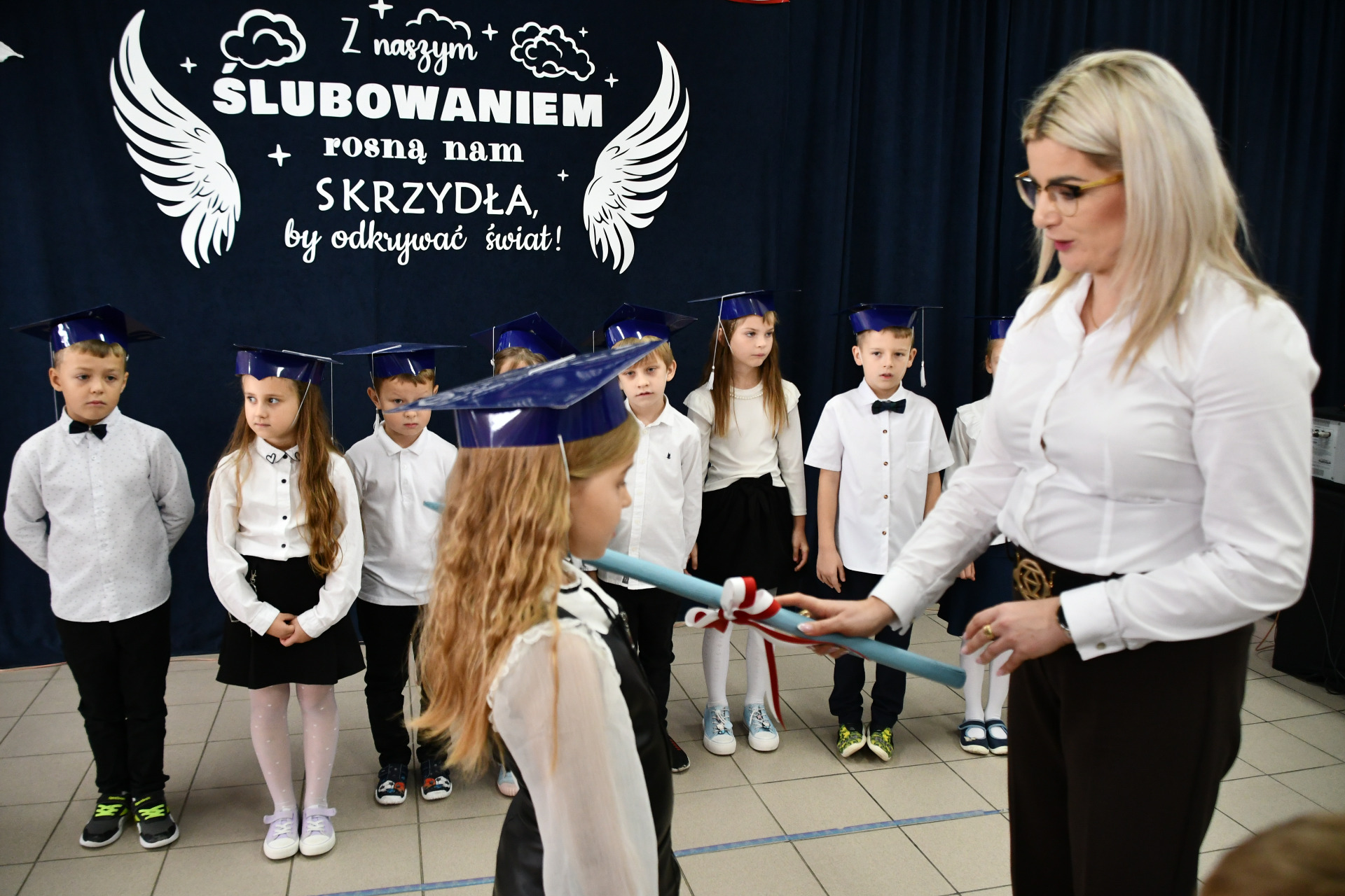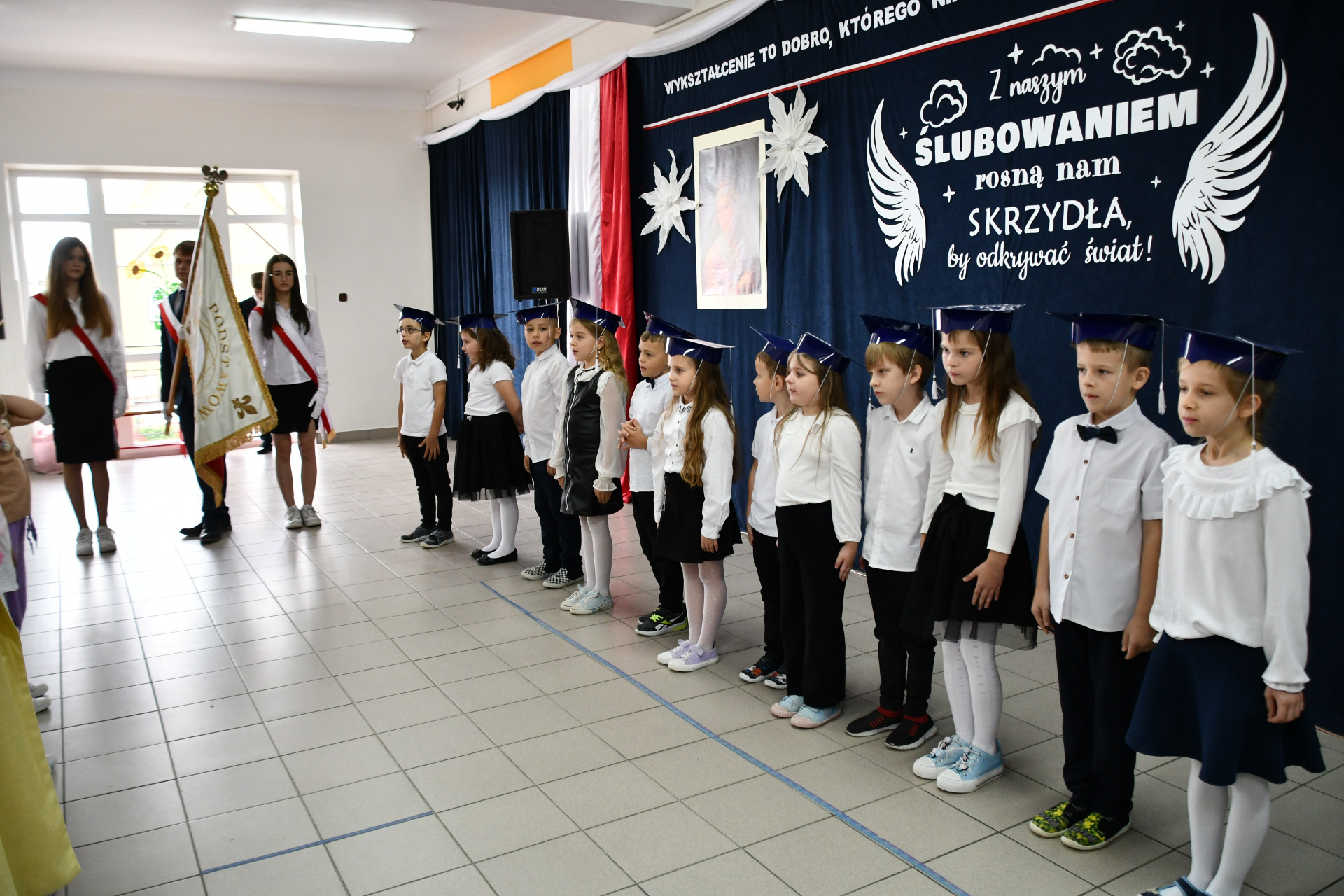 Najważniejszym momentem uroczystości było ślubowanie pierwszoklasistów przed sztandarem szkoły. Następnie Pani Dyrektor dokonała aktu pasowania niebieskim ołówkiem, przyjmując dzieci do grona uczniów Szkoły Podstawowej im. św. Jadwigi Królowej w Blinowie. Dopełnieniem tej podniosłej chwili było przejście uczniów przez symboliczną Bramę Wiedzy. Na pamiątkę wszyscy uczniowie dostali książeczki oraz dyplomy pasowania na ucznia. Pani Wójt Elżbieta Kowalczyk również życzyła dzieciom samych sukcesów oraz wręczyła im upominki. Rodzice także sprawili swoim dzieciom miłe niespodzianki. Po pamiątkowej sesji zdjęciowej wszyscy udali się do klasy na słodki poczęstunek.