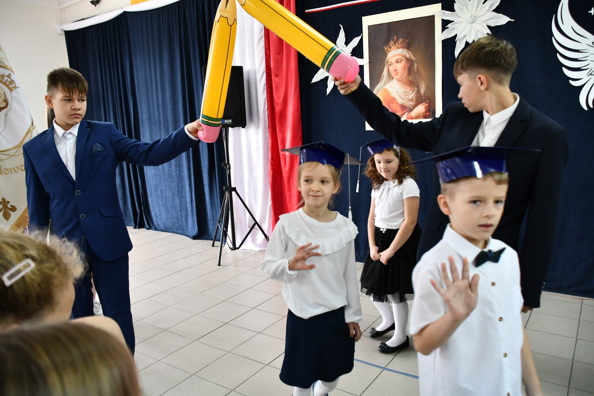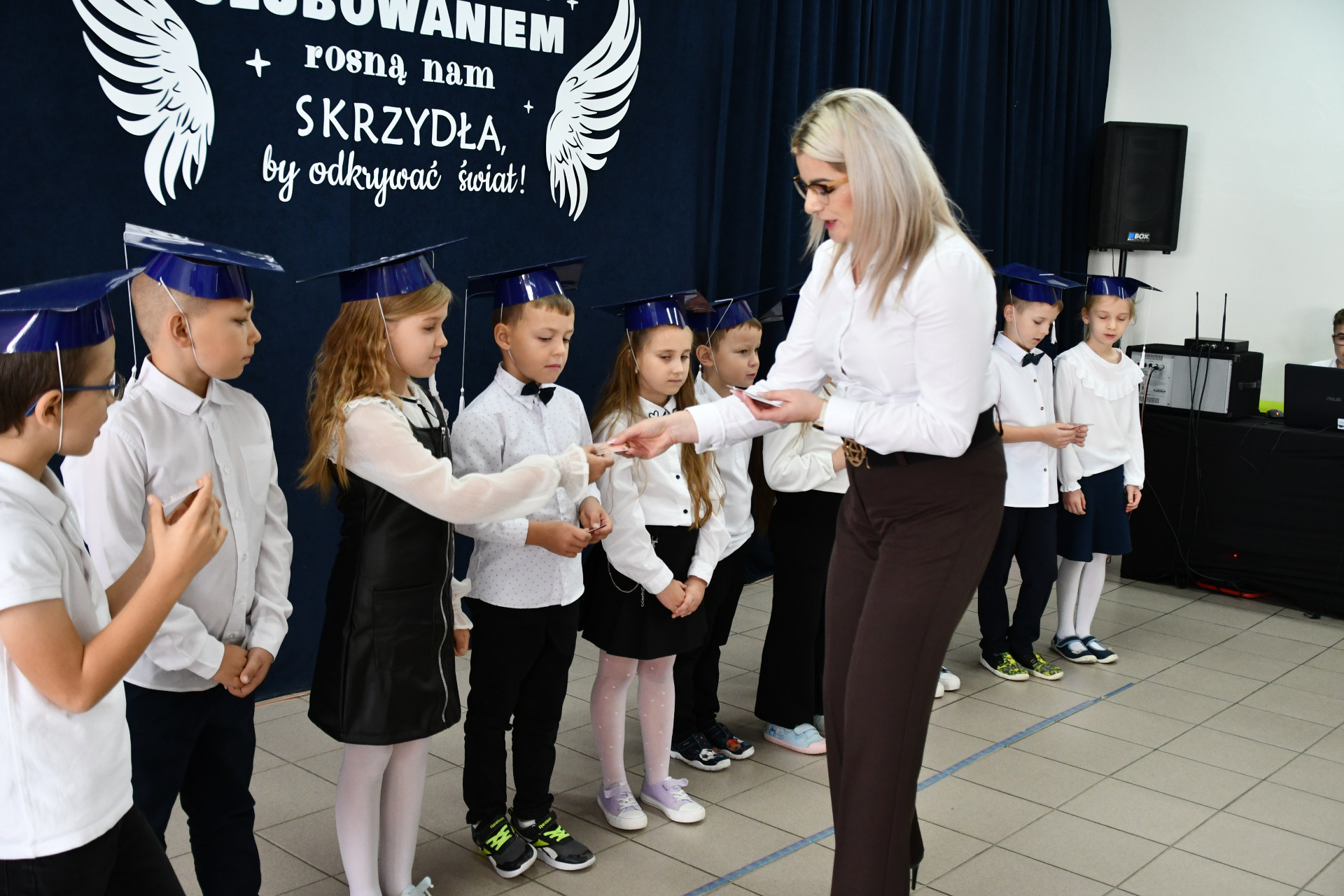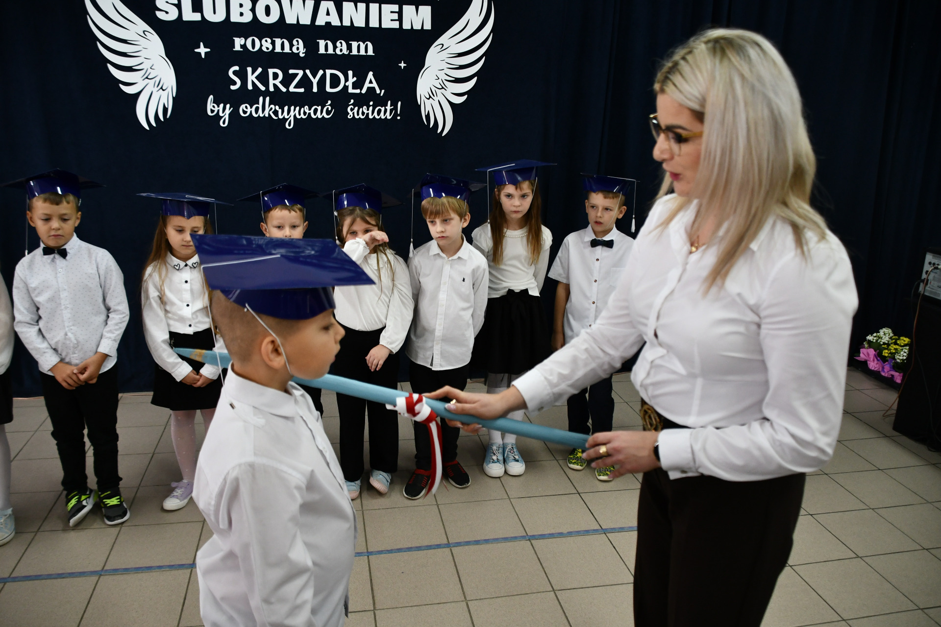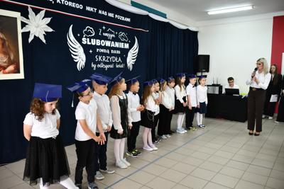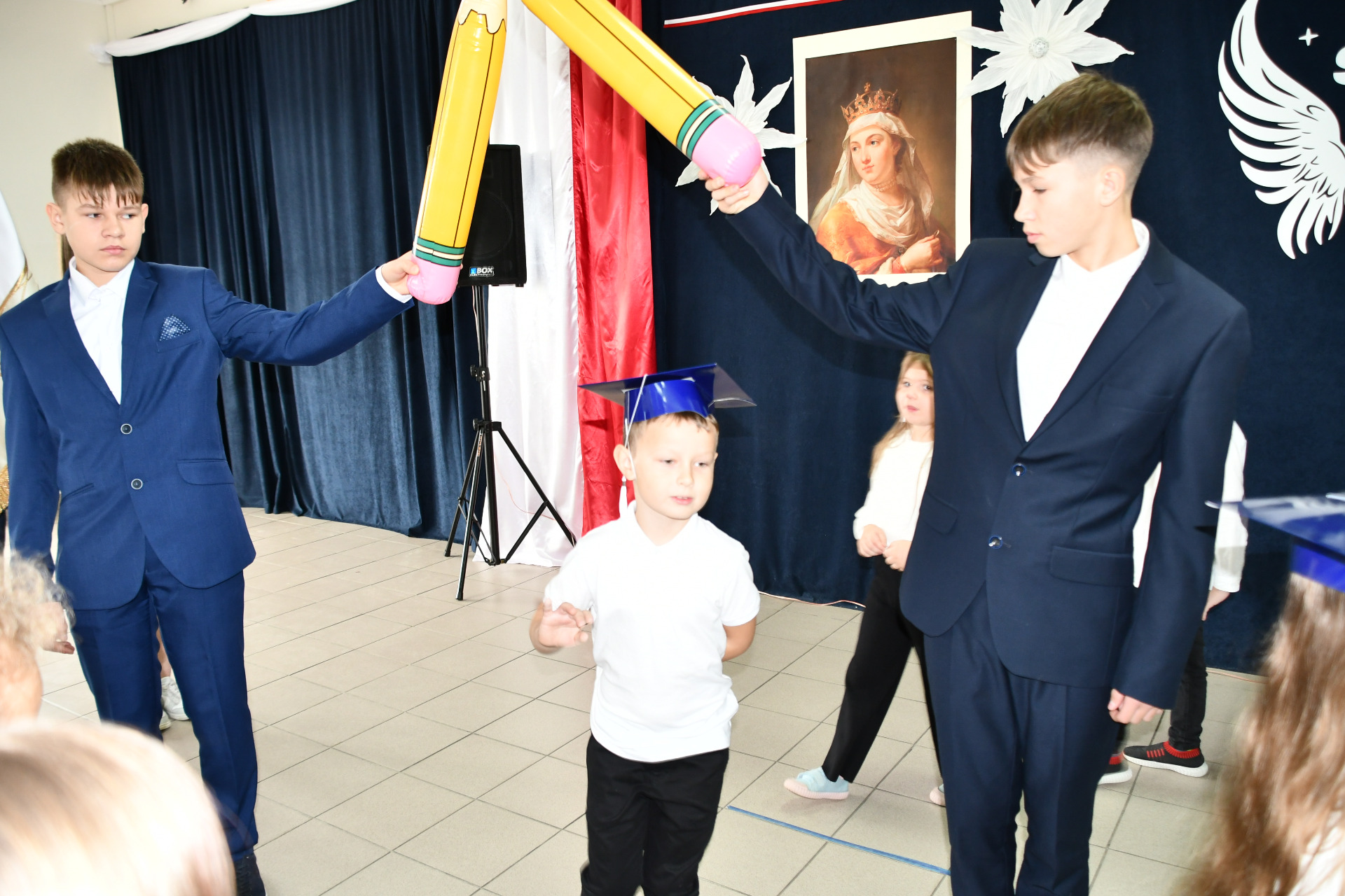 Najważniejszym momentem uroczystości było ślubowanie pierwszoklasistów przed sztandarem szkoły. Następnie Pani Dyrektor dokonała aktu pasowania niebieskim ołówkiem, przyjmując dzieci do grona uczniów Szkoły Podstawowej im. św. Jadwigi Królowej w Blinowie. Dopełnieniem tej podniosłej chwili było przejście uczniów przez symboliczną Bramę Wiedzy. Na pamiątkę wszyscy uczniowie dostali książeczki oraz dyplomy pasowania na ucznia. Pani Wójt Elżbieta Kowalczyk również życzyła dzieciom samych sukcesów oraz wręczyła im upominki. Rodzice także sprawili swoim dzieciom miłe niespodzianki. Po pamiątkowej sesji zdjęciowej wszyscy udali się do klasy na słodki poczęstunek.