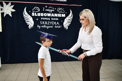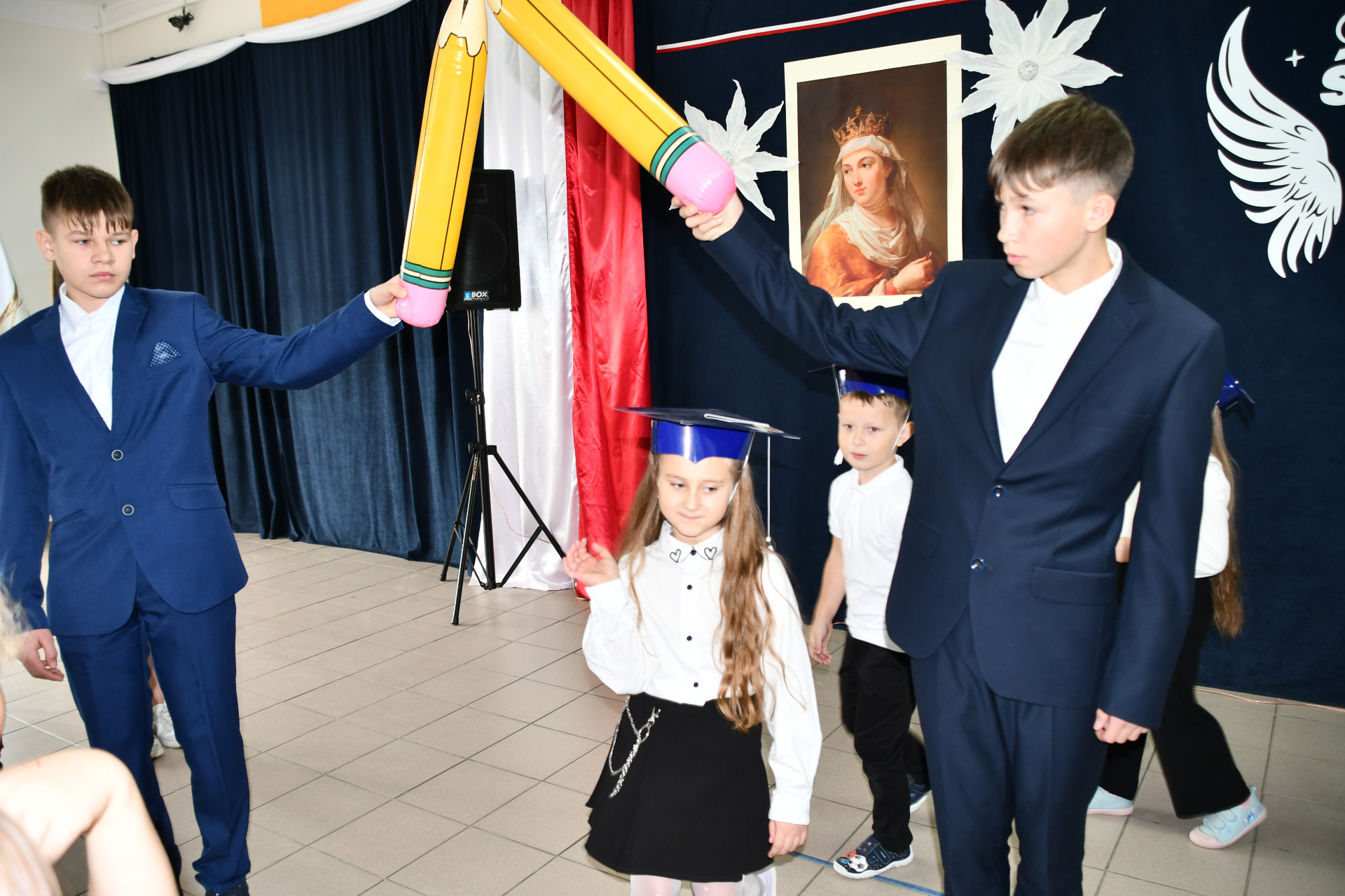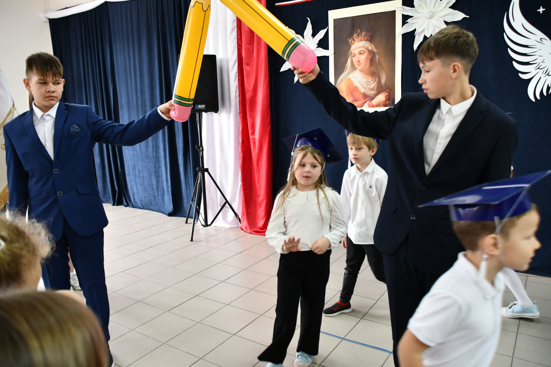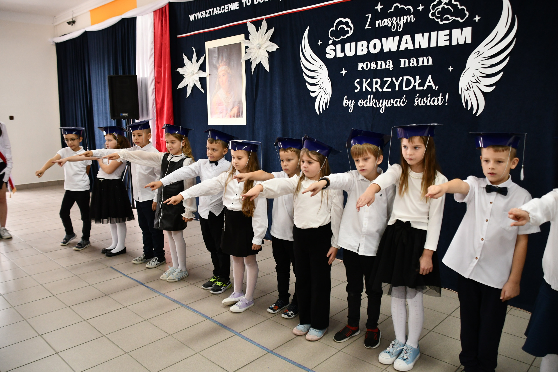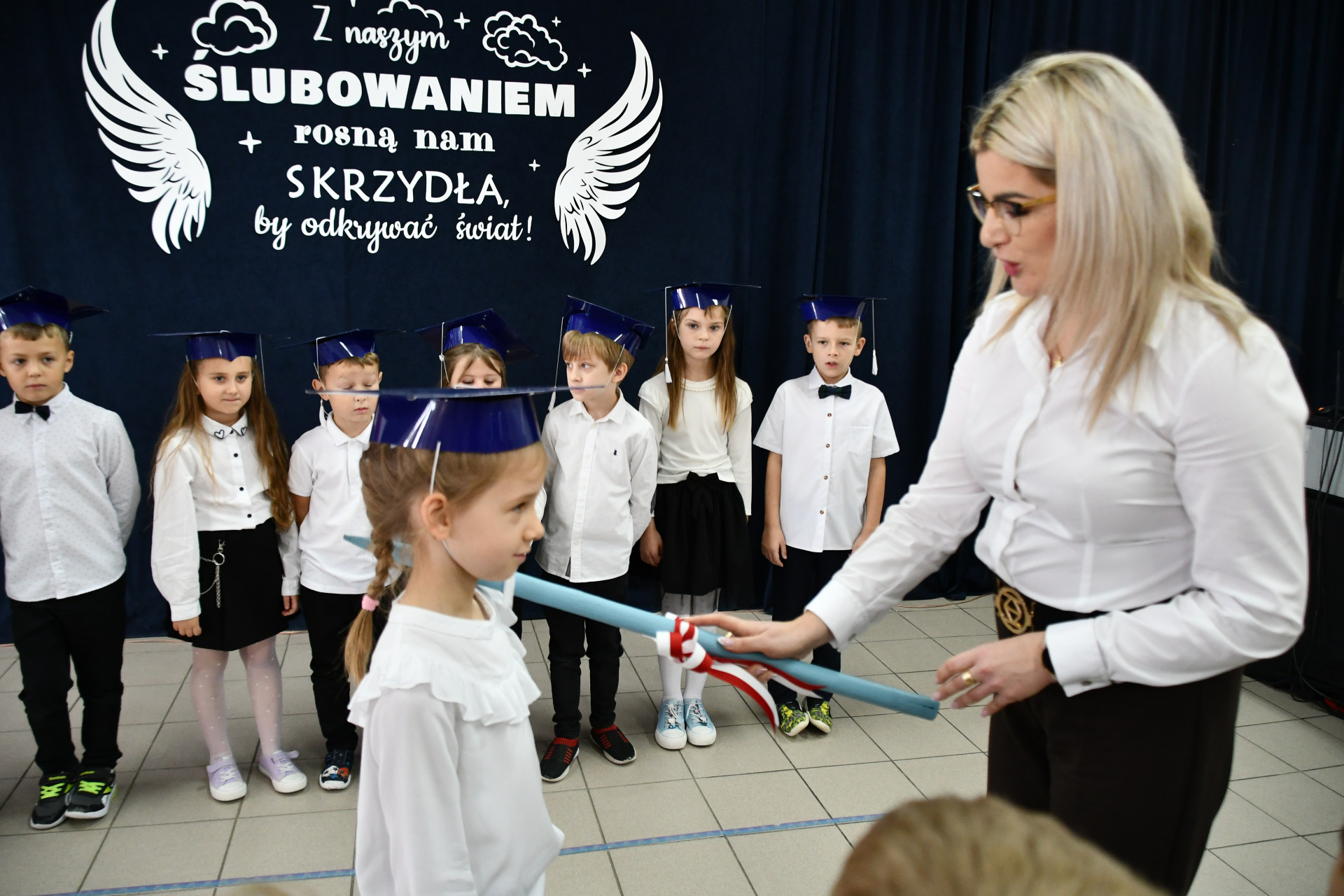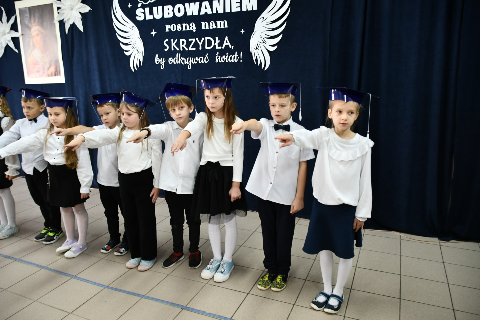 Najważniejszym momentem uroczystości było ślubowanie pierwszoklasistów przed sztandarem szkoły. Następnie Pani Dyrektor dokonała aktu pasowania niebieskim ołówkiem, przyjmując dzieci do grona uczniów Szkoły Podstawowej im. św. Jadwigi Królowej w Blinowie. Dopełnieniem tej podniosłej chwili było przejście uczniów przez symboliczną Bramę Wiedzy. Na pamiątkę wszyscy uczniowie dostali książeczki oraz dyplomy pasowania na ucznia. Pani Wójt Elżbieta Kowalczyk również życzyła dzieciom samych sukcesów oraz wręczyła im upominki. Rodzice także sprawili swoim dzieciom miłe niespodzianki. Po pamiątkowej sesji zdjęciowej wszyscy udali się do klasy na słodki poczęstunek.