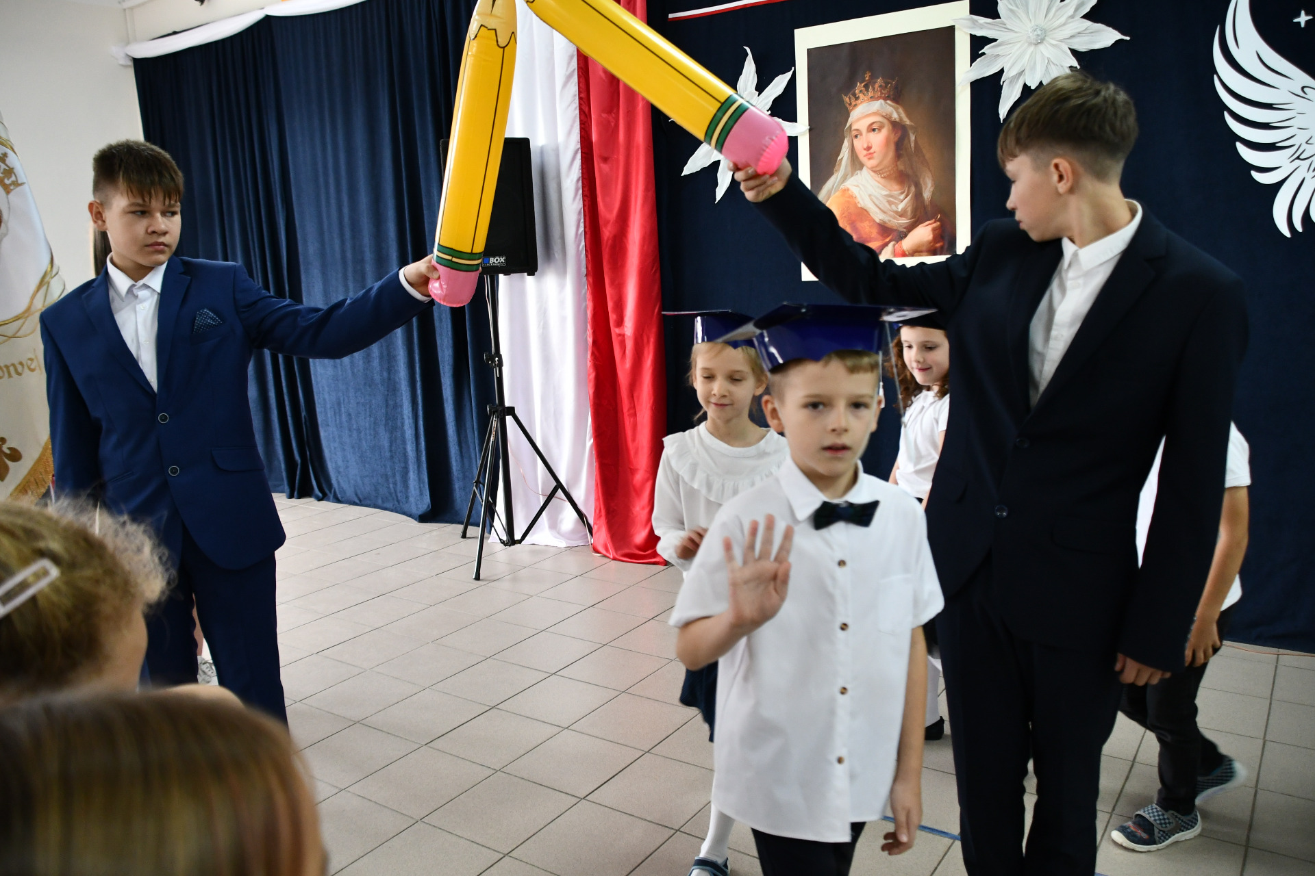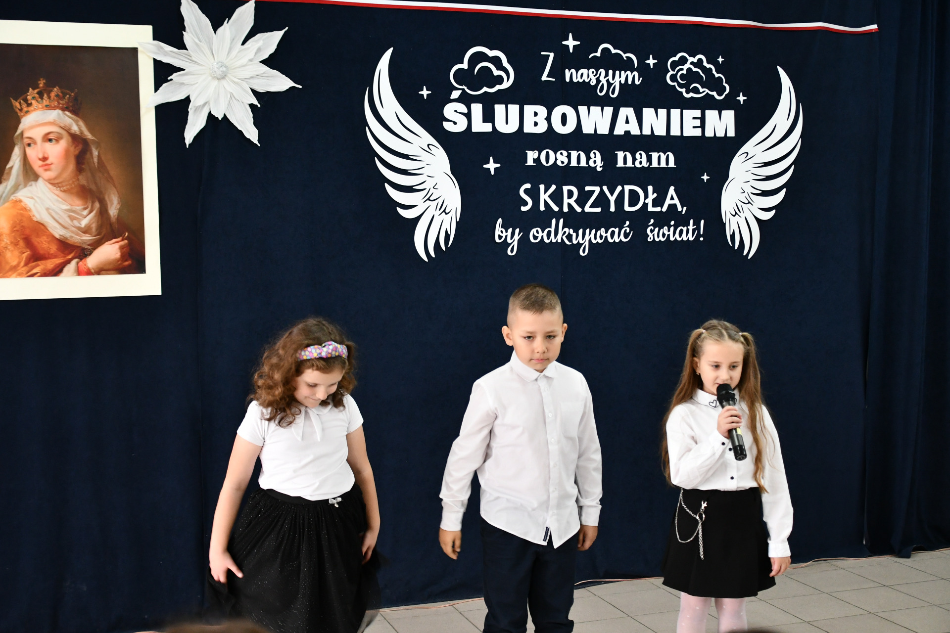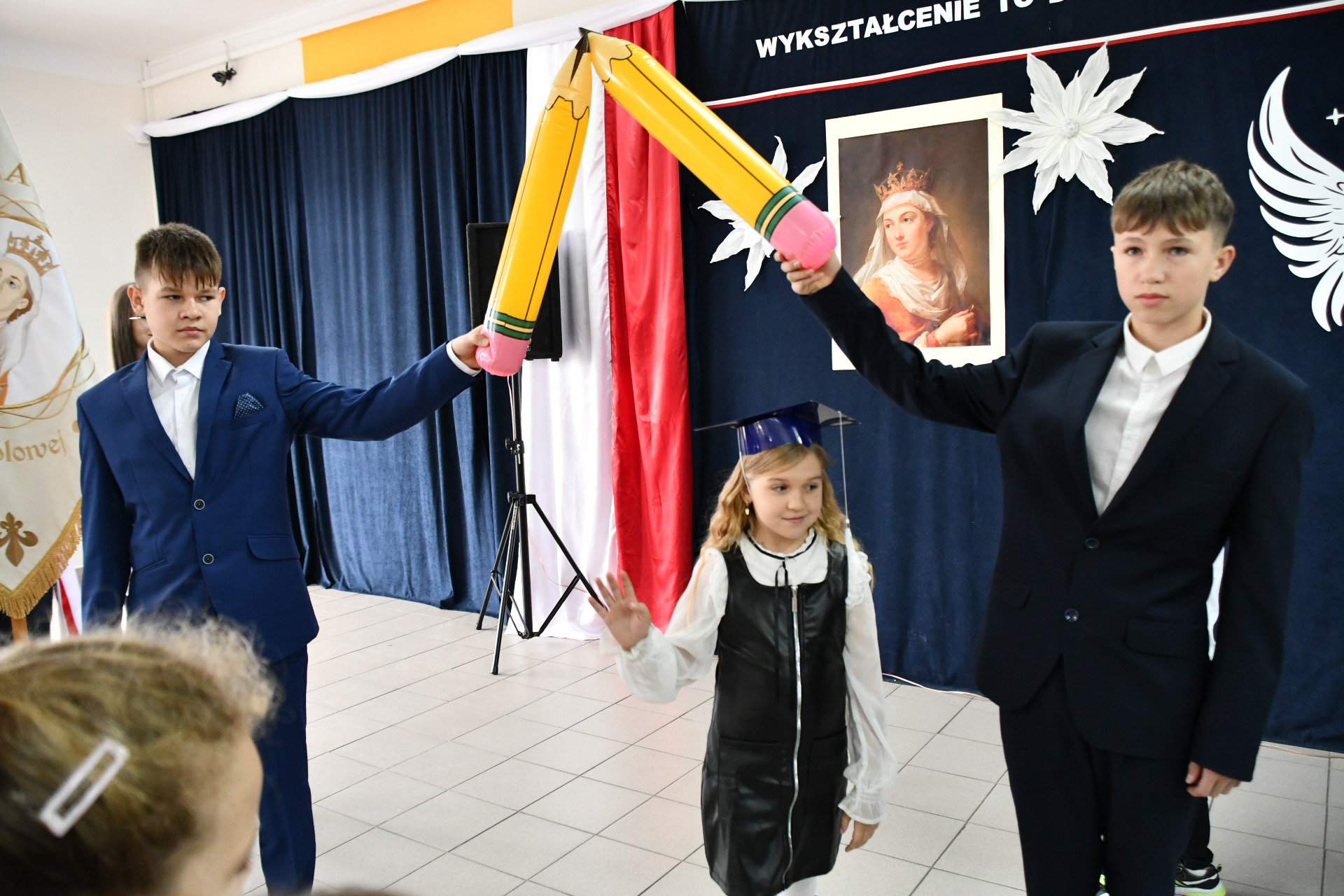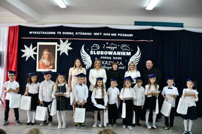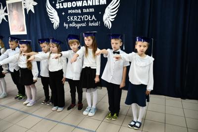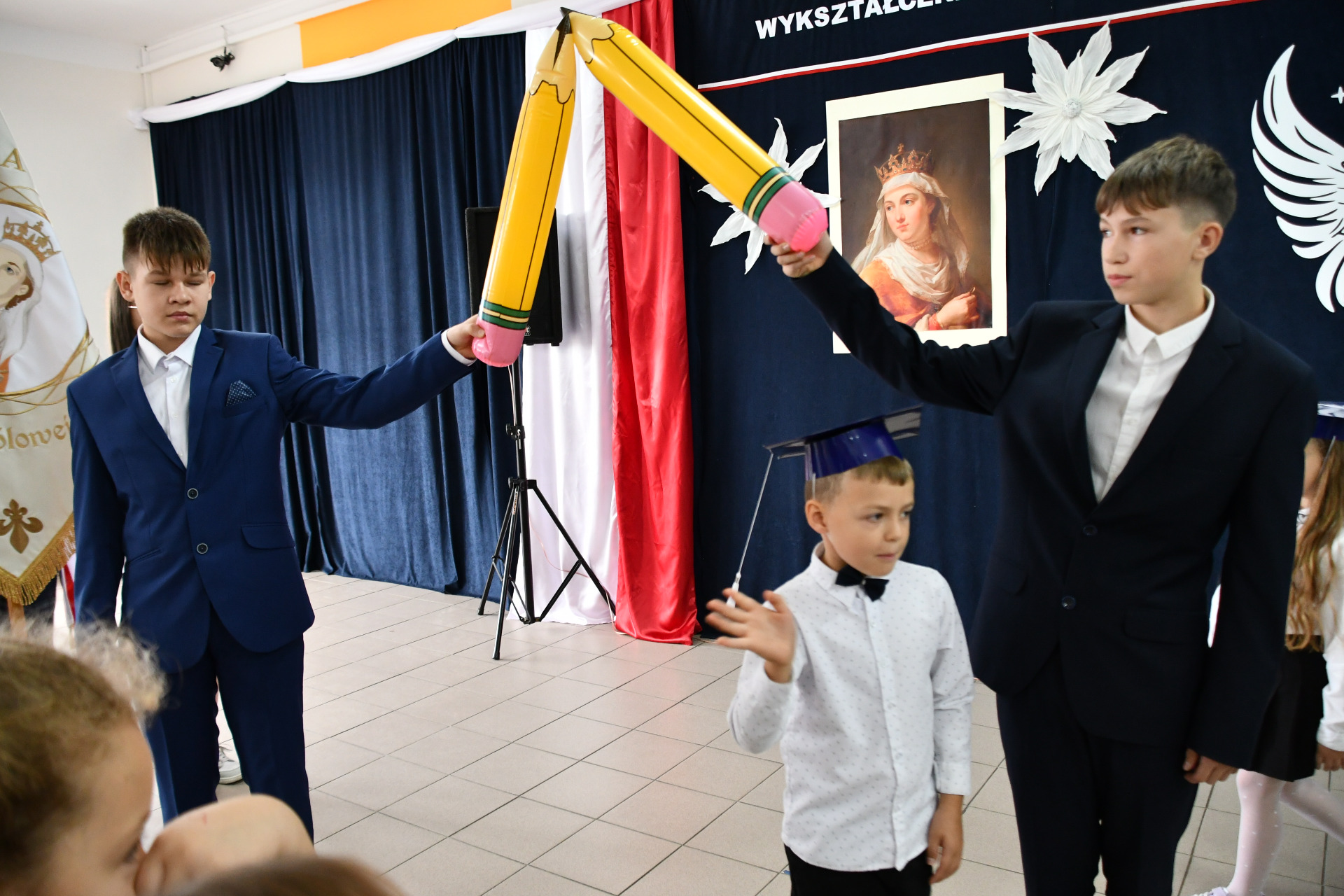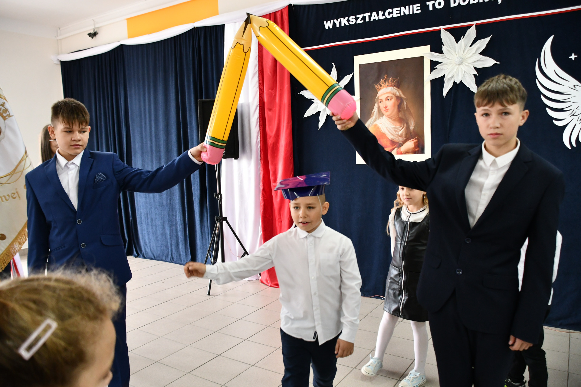 Najważniejszym momentem uroczystości było ślubowanie pierwszoklasistów przed sztandarem szkoły. Następnie Pani Dyrektor dokonała aktu pasowania niebieskim ołówkiem, przyjmując dzieci do grona uczniów Szkoły Podstawowej im. św. Jadwigi Królowej w Blinowie. Dopełnieniem tej podniosłej chwili było przejście uczniów przez symboliczną Bramę Wiedzy. Na pamiątkę wszyscy uczniowie dostali książeczki oraz dyplomy pasowania na ucznia. Pani Wójt Elżbieta Kowalczyk również życzyła dzieciom samych sukcesów oraz wręczyła im upominki. Rodzice także sprawili swoim dzieciom miłe niespodzianki. Po pamiątkowej sesji zdjęciowej wszyscy udali się do klasy na słodki poczęstunek.