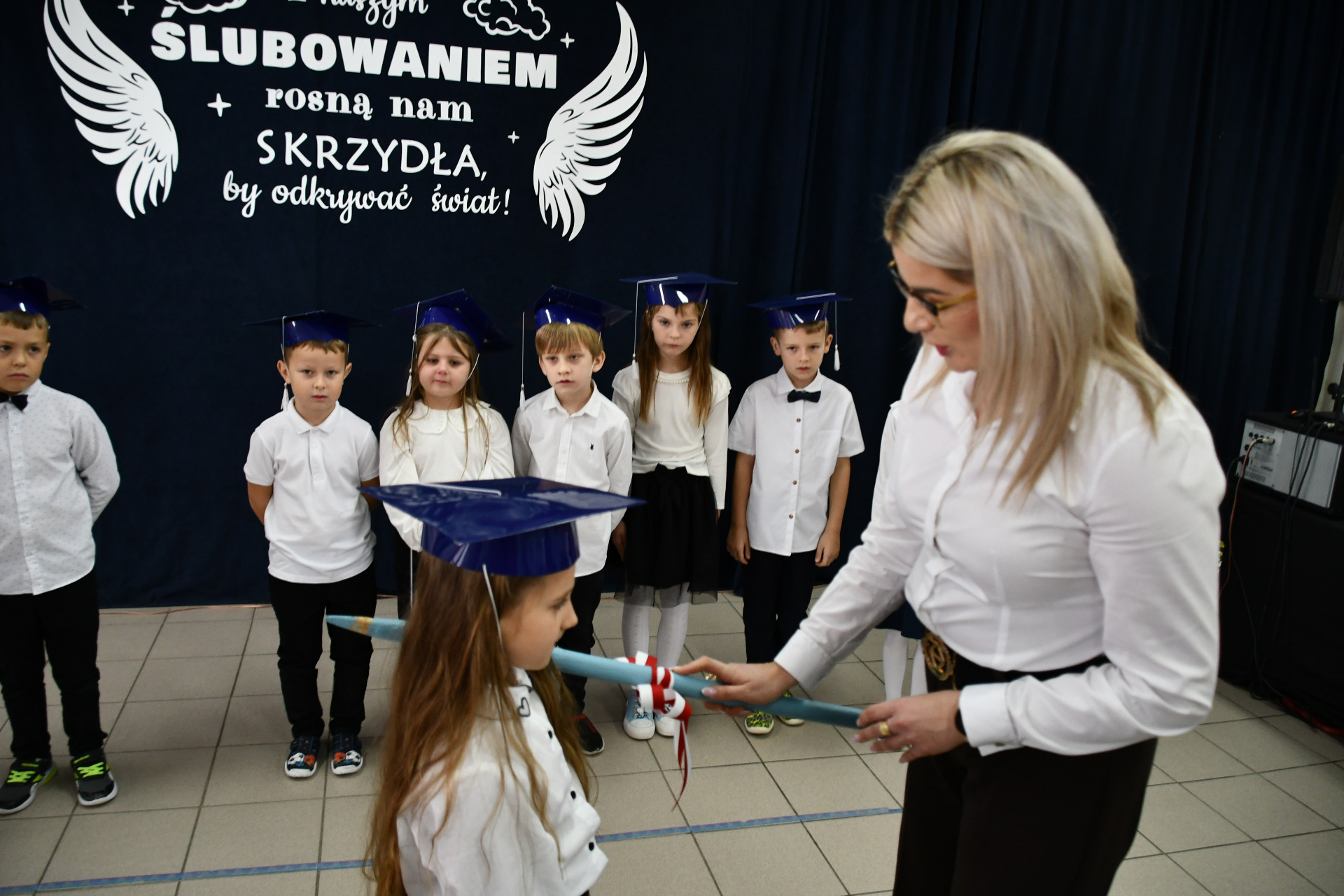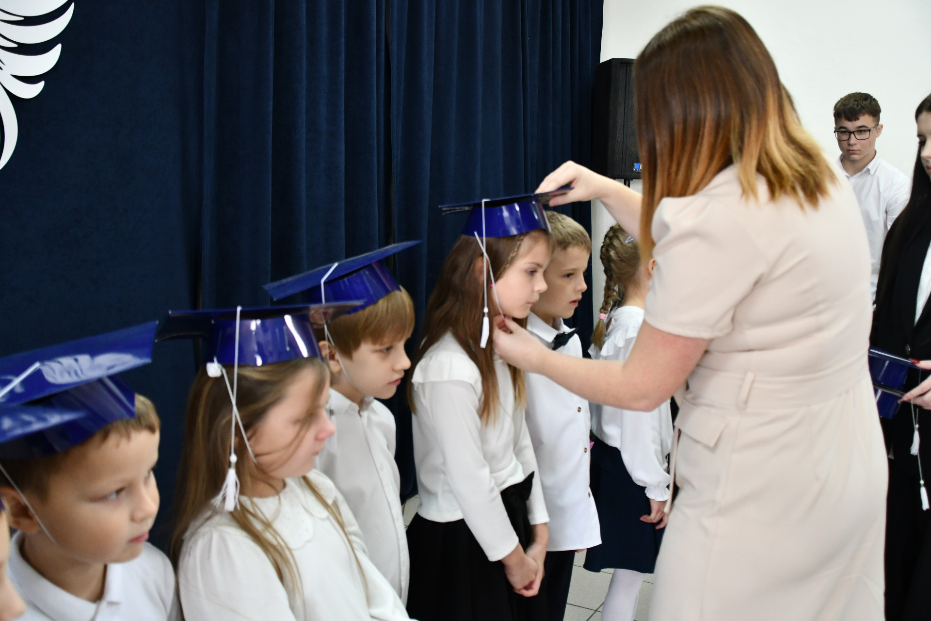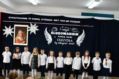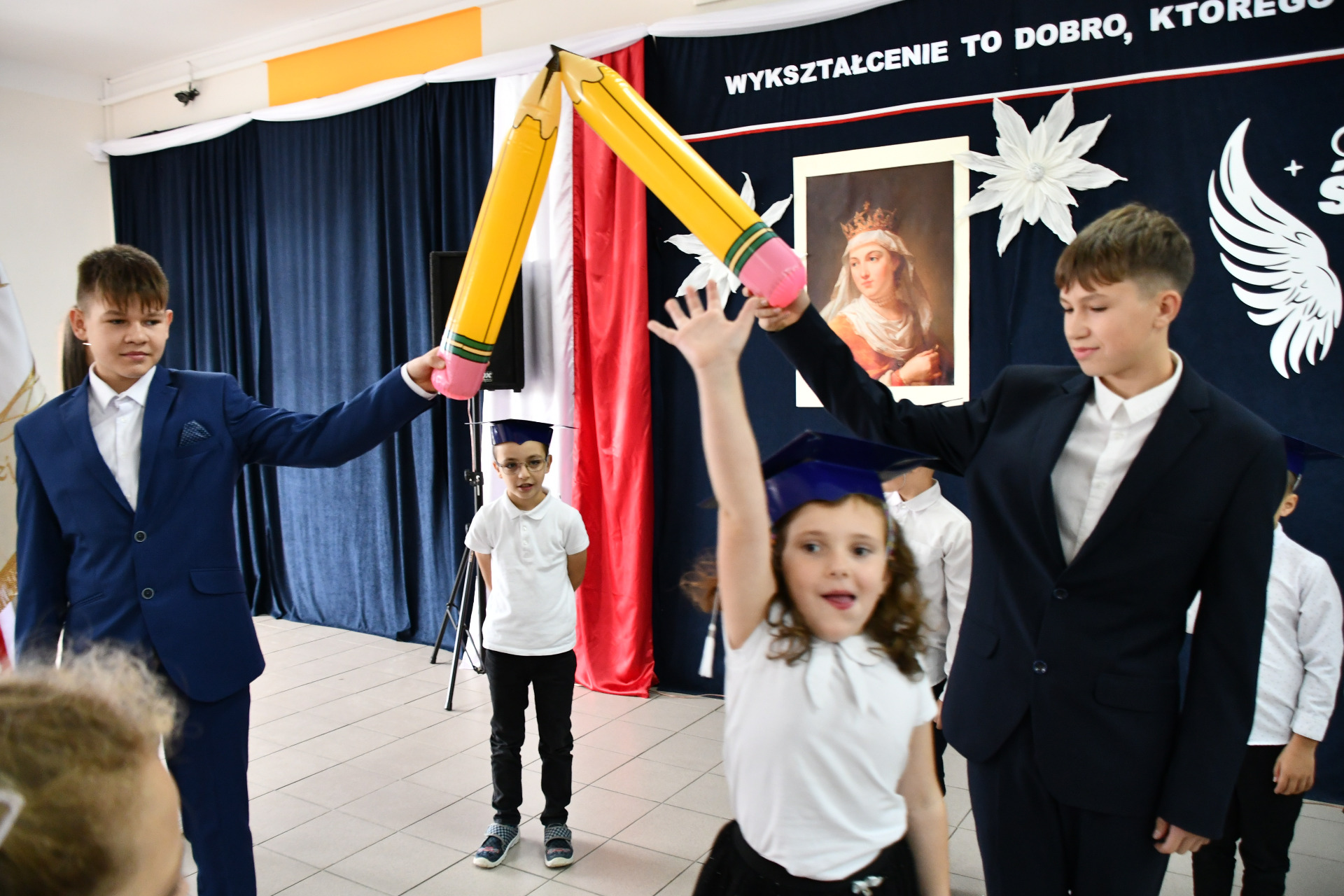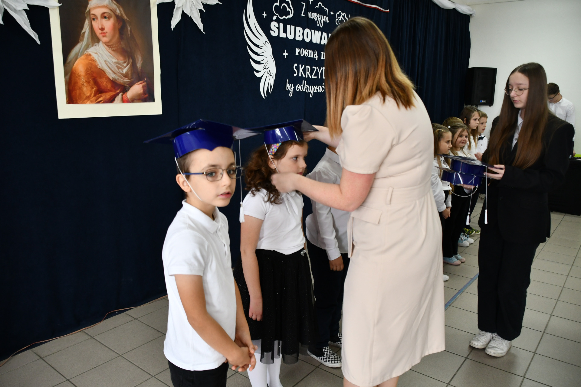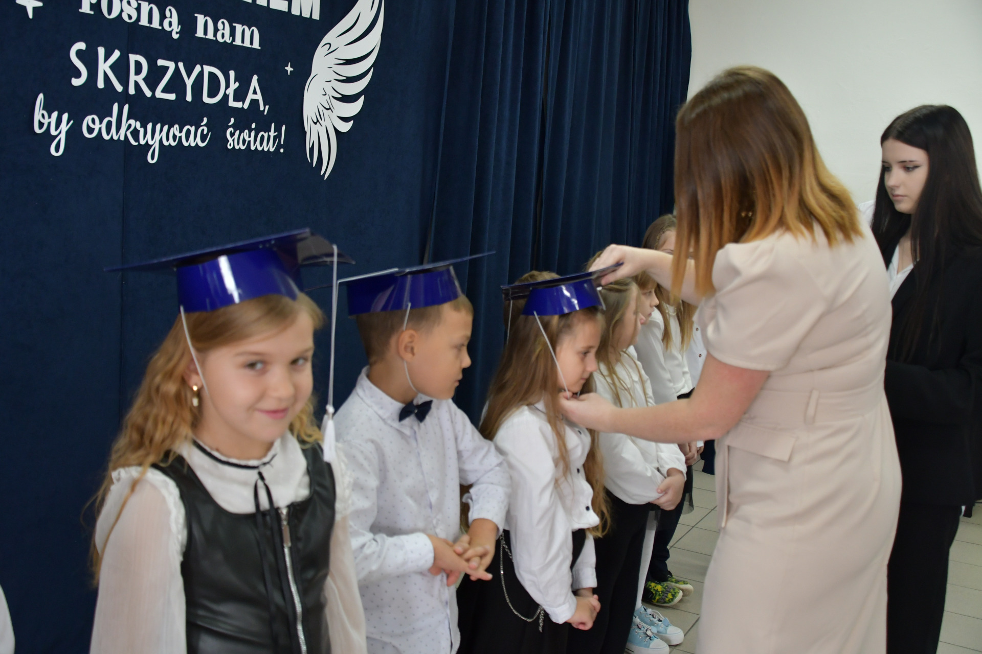 Najważniejszym momentem uroczystości było ślubowanie pierwszoklasistów przed sztandarem szkoły. Następnie Pani Dyrektor dokonała aktu pasowania niebieskim ołówkiem, przyjmując dzieci do grona uczniów Szkoły Podstawowej im. św. Jadwigi Królowej w Blinowie. Dopełnieniem tej podniosłej chwili było przejście uczniów przez symboliczną Bramę Wiedzy. Na pamiątkę wszyscy uczniowie dostali książeczki oraz dyplomy pasowania na ucznia. Pani Wójt Elżbieta Kowalczyk również życzyła dzieciom samych sukcesów oraz wręczyła im upominki. Rodzice także sprawili swoim dzieciom miłe niespodzianki. Po pamiątkowej sesji zdjęciowej wszyscy udali się do klasy na słodki poczęstunek.