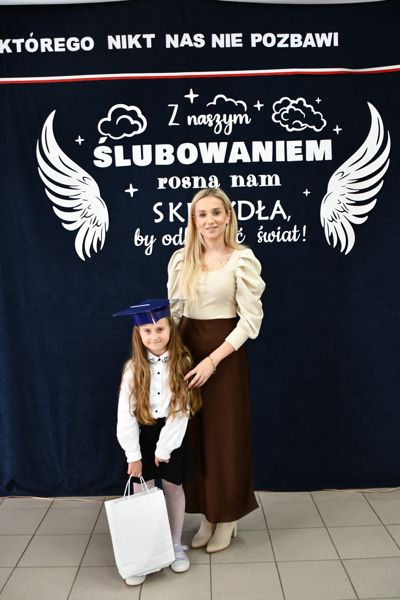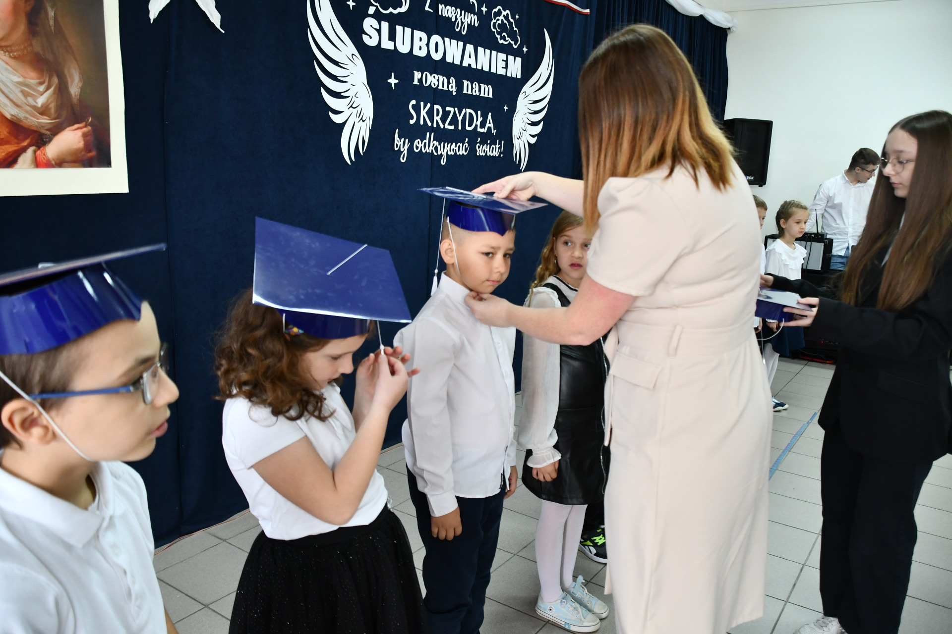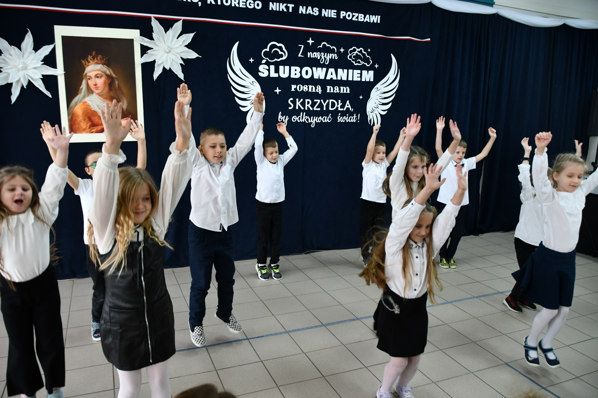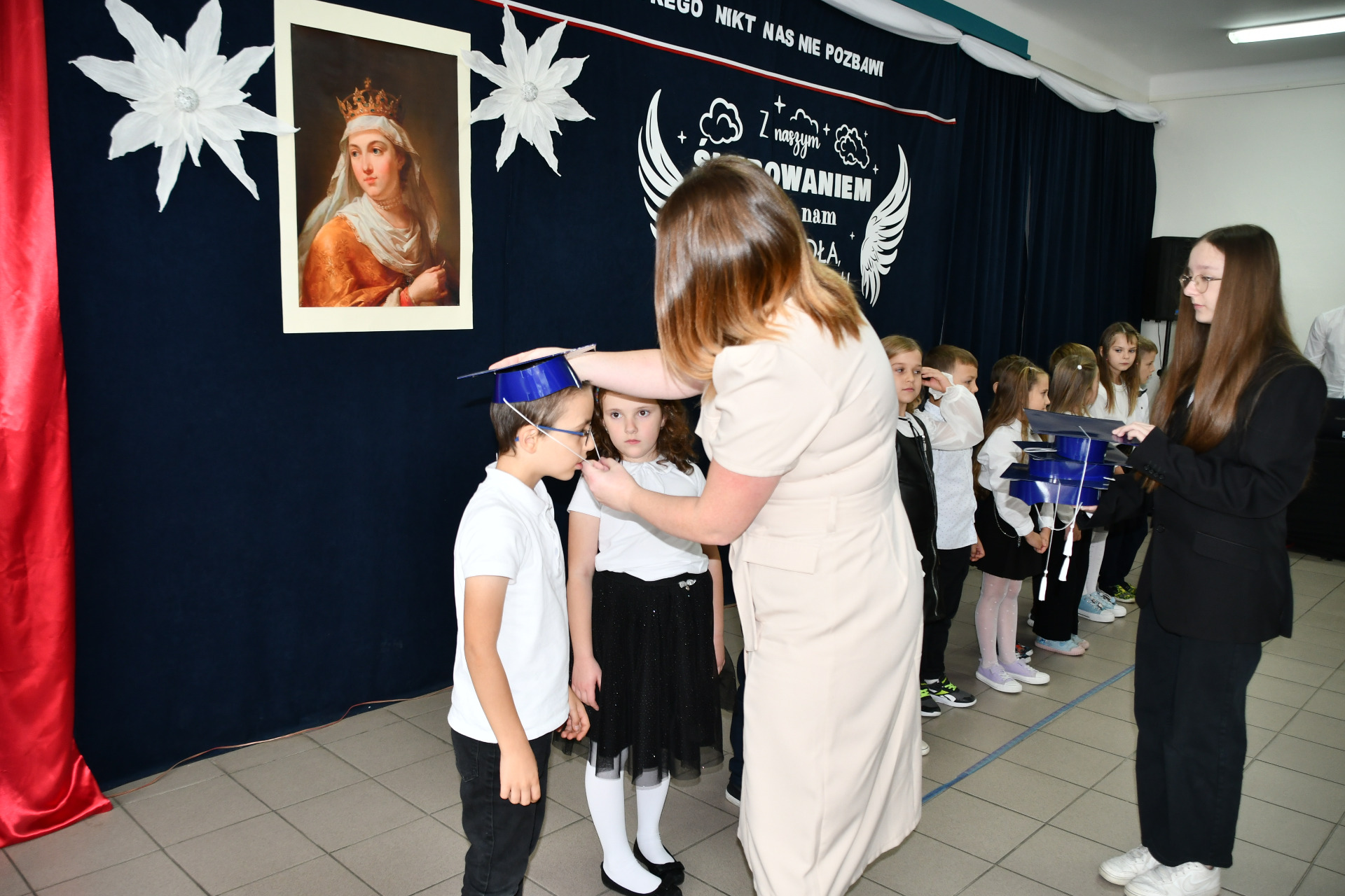 Najważniejszym momentem uroczystości było ślubowanie pierwszoklasistów przed sztandarem szkoły. Następnie Pani Dyrektor dokonała aktu pasowania niebieskim ołówkiem, przyjmując dzieci do grona uczniów Szkoły Podstawowej im. św. Jadwigi Królowej w Blinowie. Dopełnieniem tej podniosłej chwili było przejście uczniów przez symboliczną Bramę Wiedzy. Na pamiątkę wszyscy uczniowie dostali książeczki oraz dyplomy pasowania na ucznia. Pani Wójt Elżbieta Kowalczyk również życzyła dzieciom samych sukcesów oraz wręczyła im upominki. Rodzice także sprawili swoim dzieciom miłe niespodzianki. Po pamiątkowej sesji zdjęciowej wszyscy udali się do klasy na słodki poczęstunek.