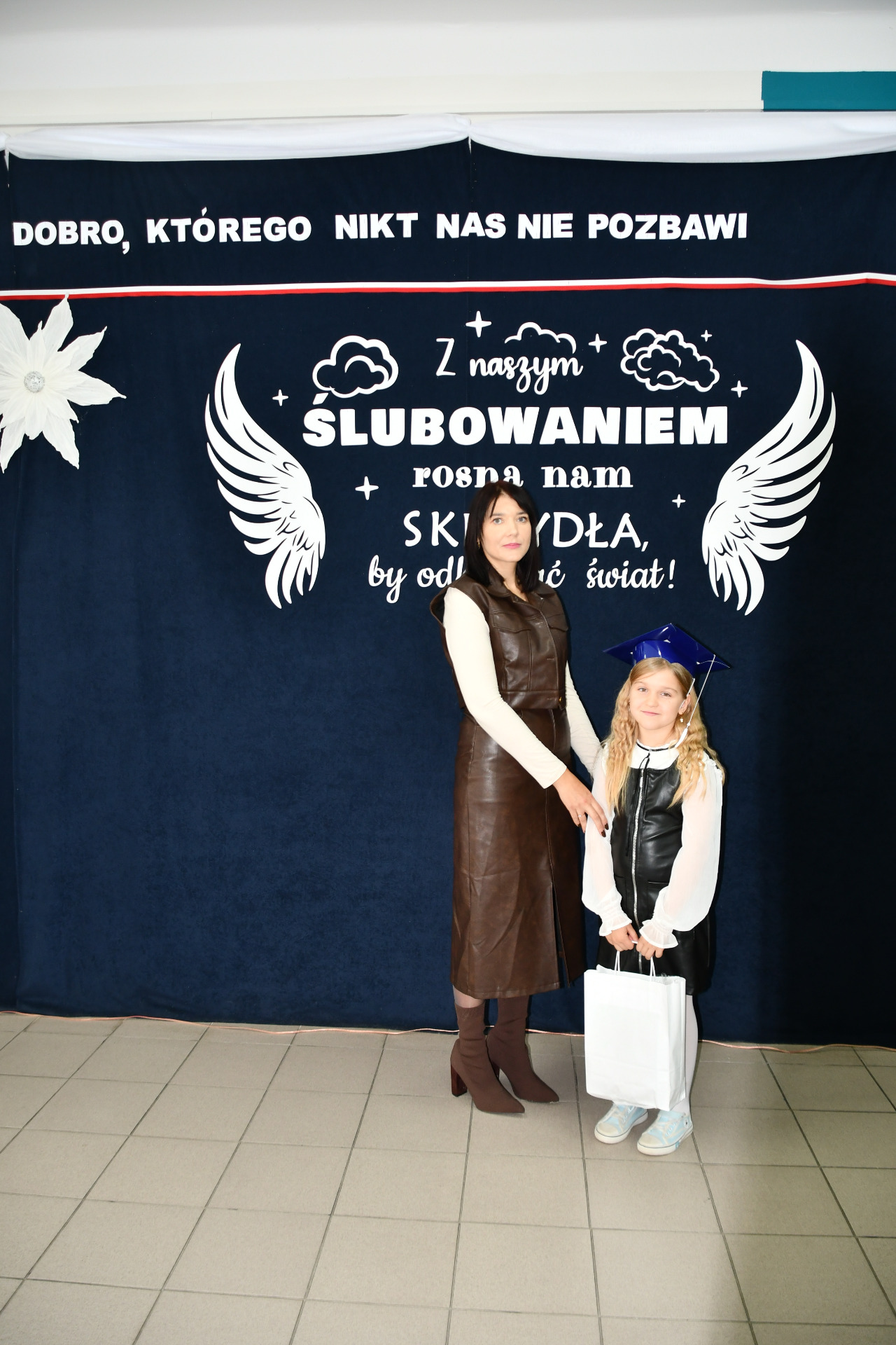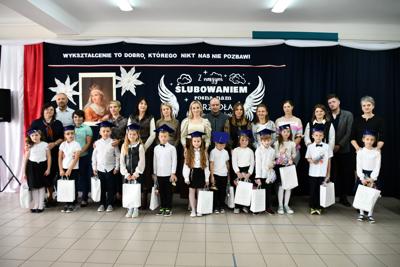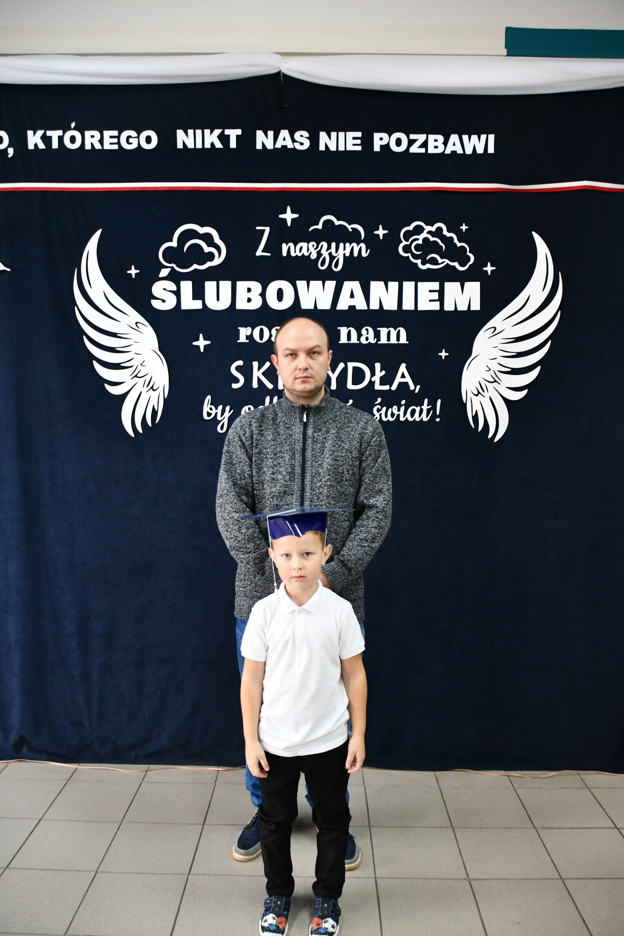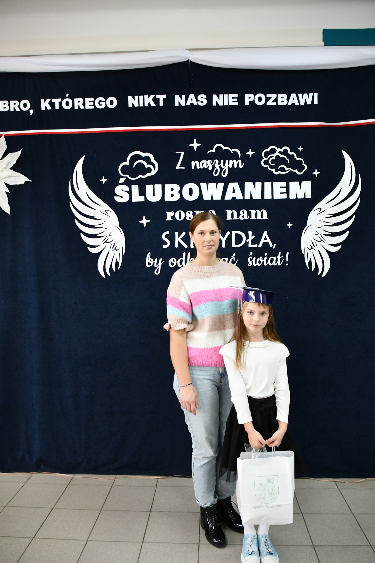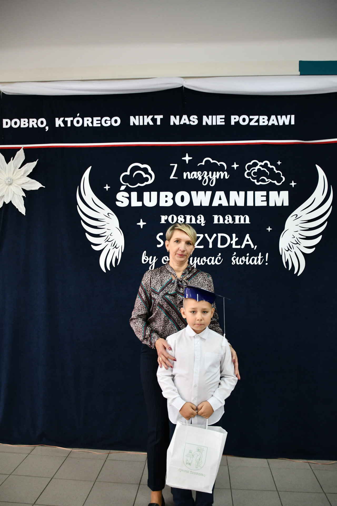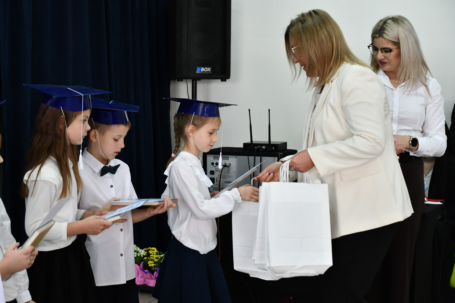 Najważniejszym momentem uroczystości było ślubowanie pierwszoklasistów przed sztandarem szkoły. Następnie Pani Dyrektor dokonała aktu pasowania niebieskim ołówkiem, przyjmując dzieci do grona uczniów Szkoły Podstawowej im. św. Jadwigi Królowej w Blinowie. Dopełnieniem tej podniosłej chwili było przejście uczniów przez symboliczną Bramę Wiedzy. Na pamiątkę wszyscy uczniowie dostali książeczki oraz dyplomy pasowania na ucznia. Pani Wójt Elżbieta Kowalczyk również życzyła dzieciom samych sukcesów oraz wręczyła im upominki. Rodzice także sprawili swoim dzieciom miłe niespodzianki. Po pamiątkowej sesji zdjęciowej wszyscy udali się do klasy na słodki poczęstunek.
