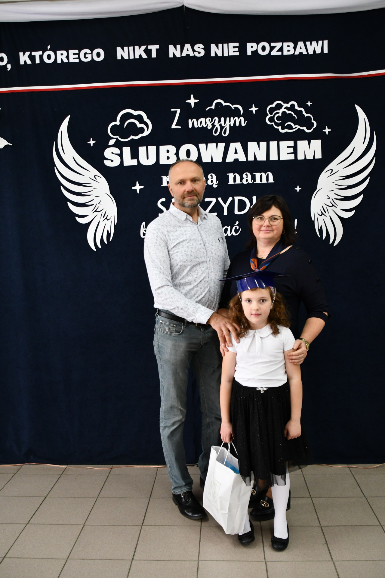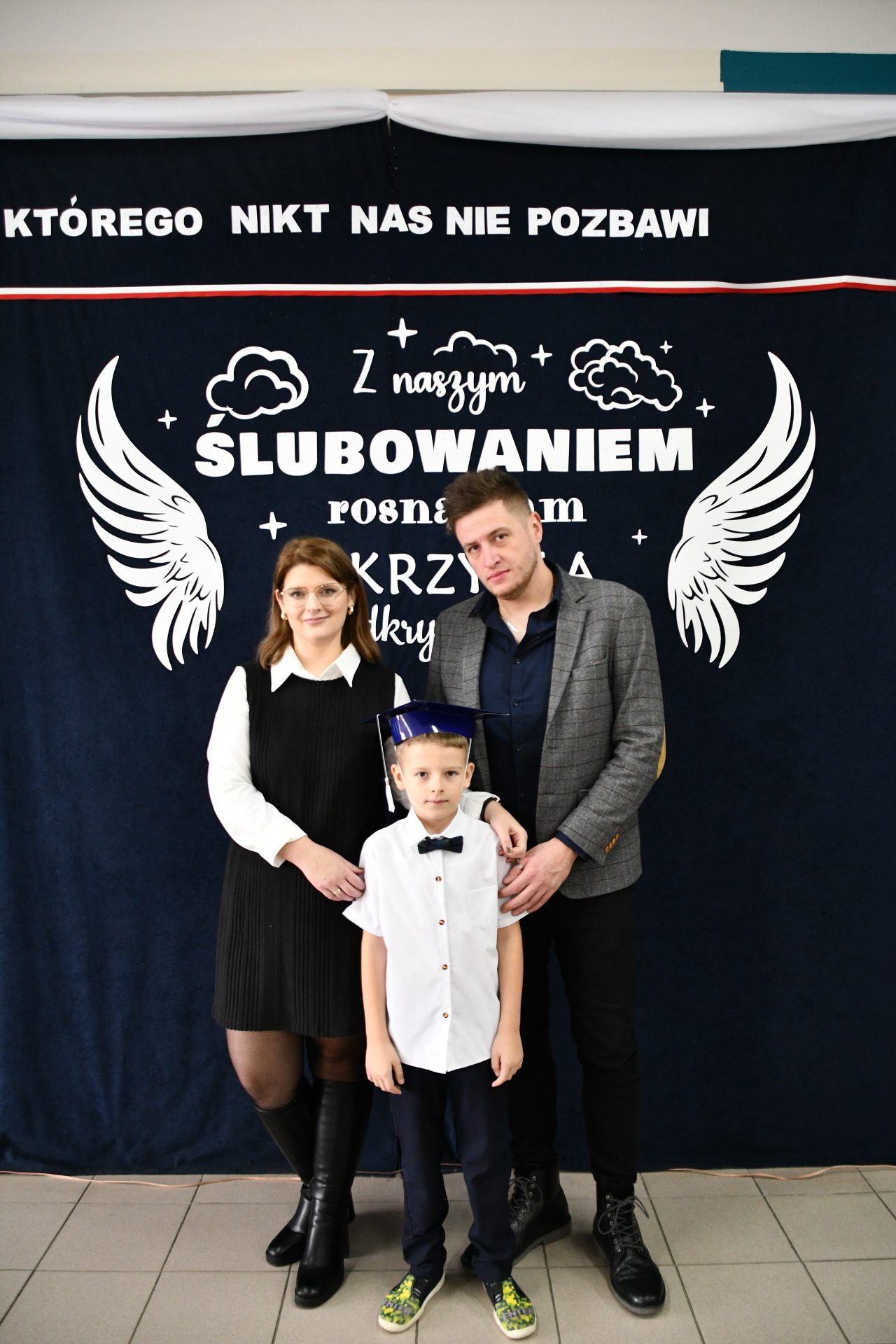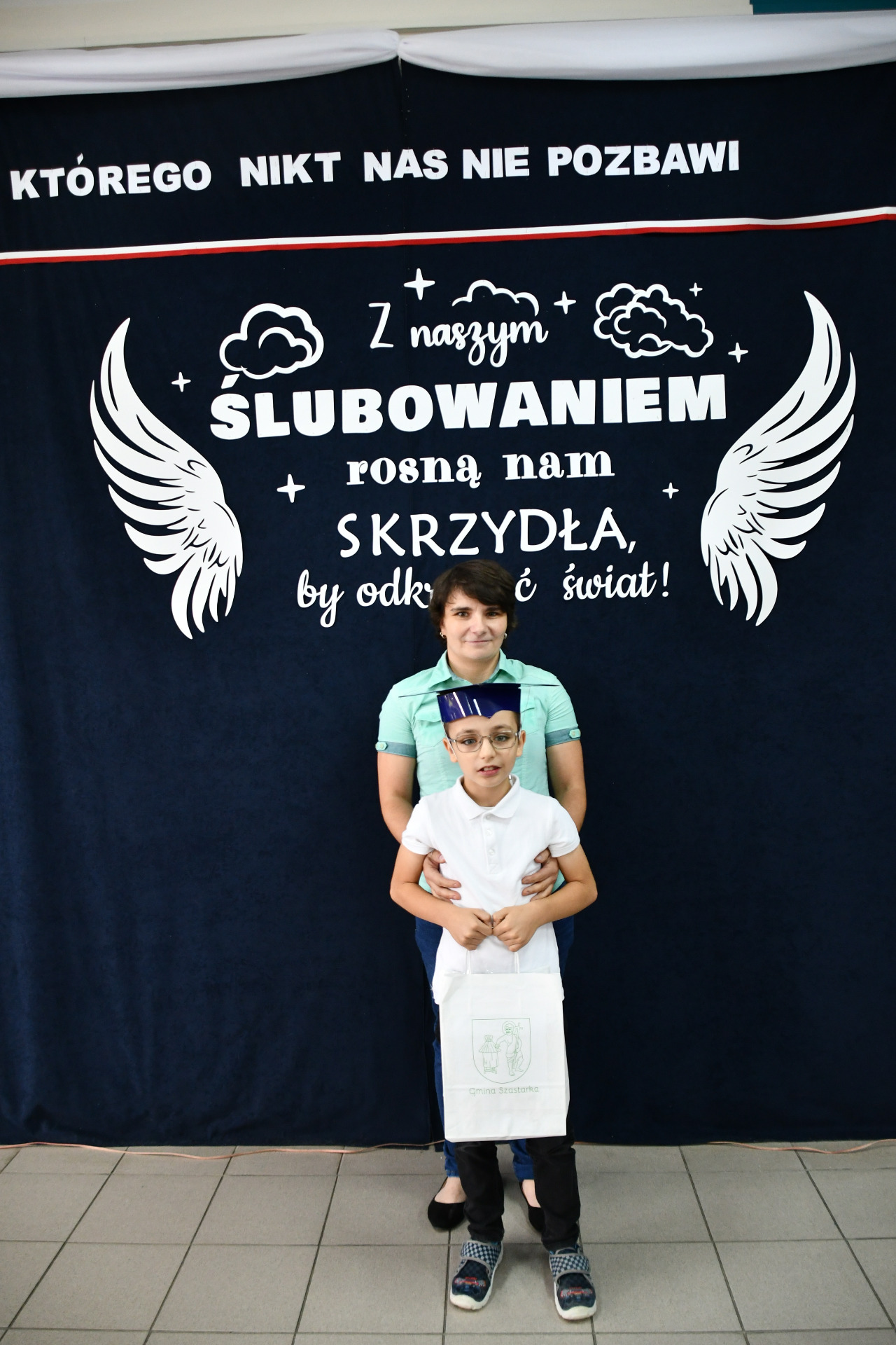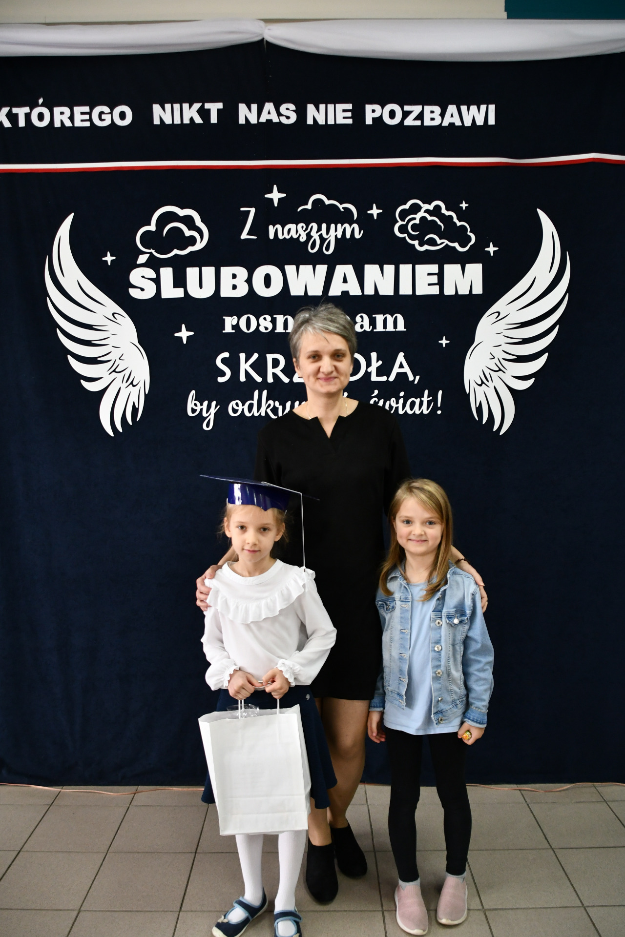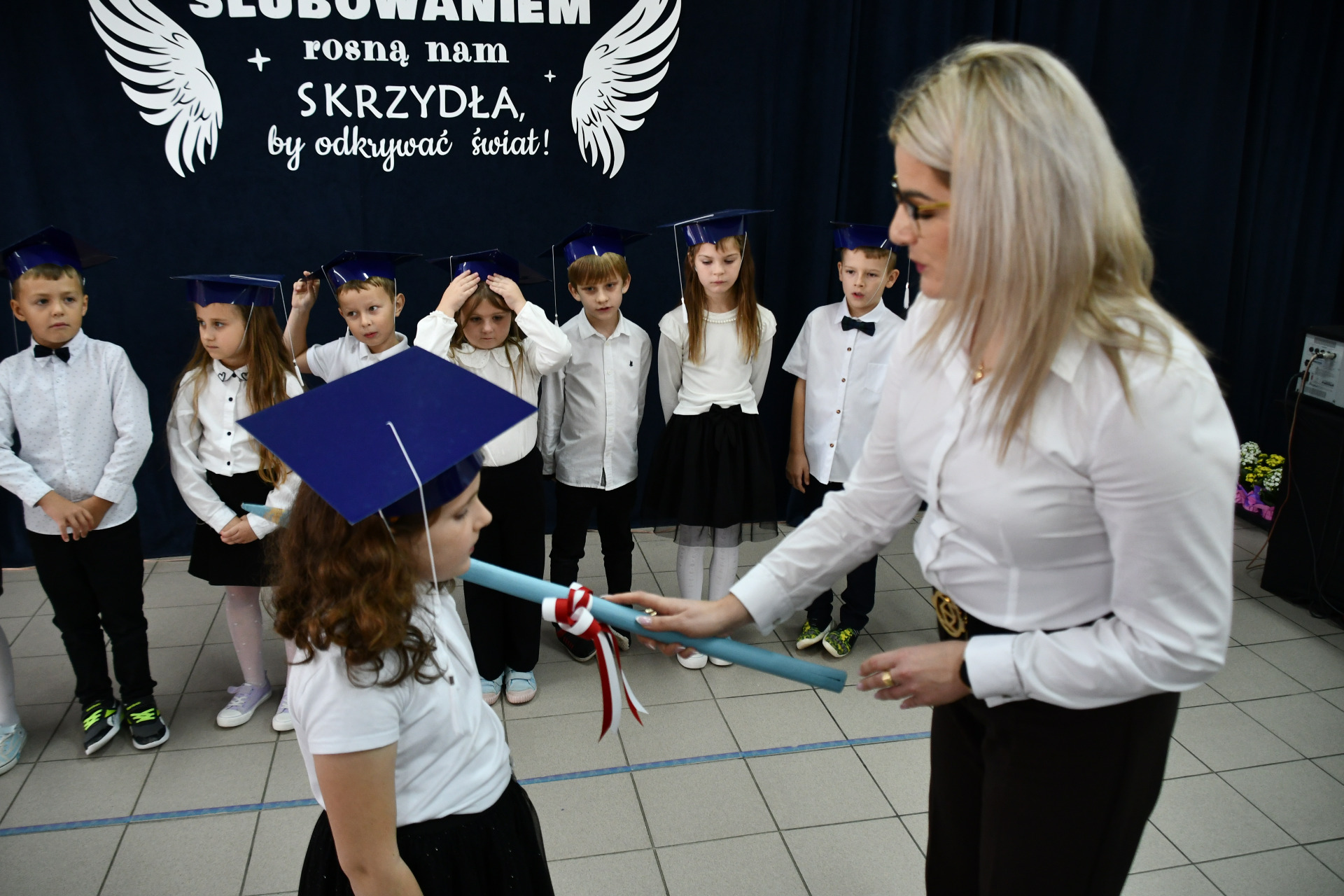 Najważniejszym momentem uroczystości było ślubowanie pierwszoklasistów przed sztandarem szkoły. Następnie Pani Dyrektor dokonała aktu pasowania niebieskim ołówkiem, przyjmując dzieci do grona uczniów Szkoły Podstawowej im. św. Jadwigi Królowej w Blinowie. Dopełnieniem tej podniosłej chwili było przejście uczniów przez symboliczną Bramę Wiedzy. Na pamiątkę wszyscy uczniowie dostali książeczki oraz dyplomy pasowania na ucznia. Pani Wójt Elżbieta Kowalczyk również życzyła dzieciom samych sukcesów oraz wręczyła im upominki. Rodzice także sprawili swoim dzieciom miłe niespodzianki. Po pamiątkowej sesji zdjęciowej wszyscy udali się do klasy na słodki poczęstunek.