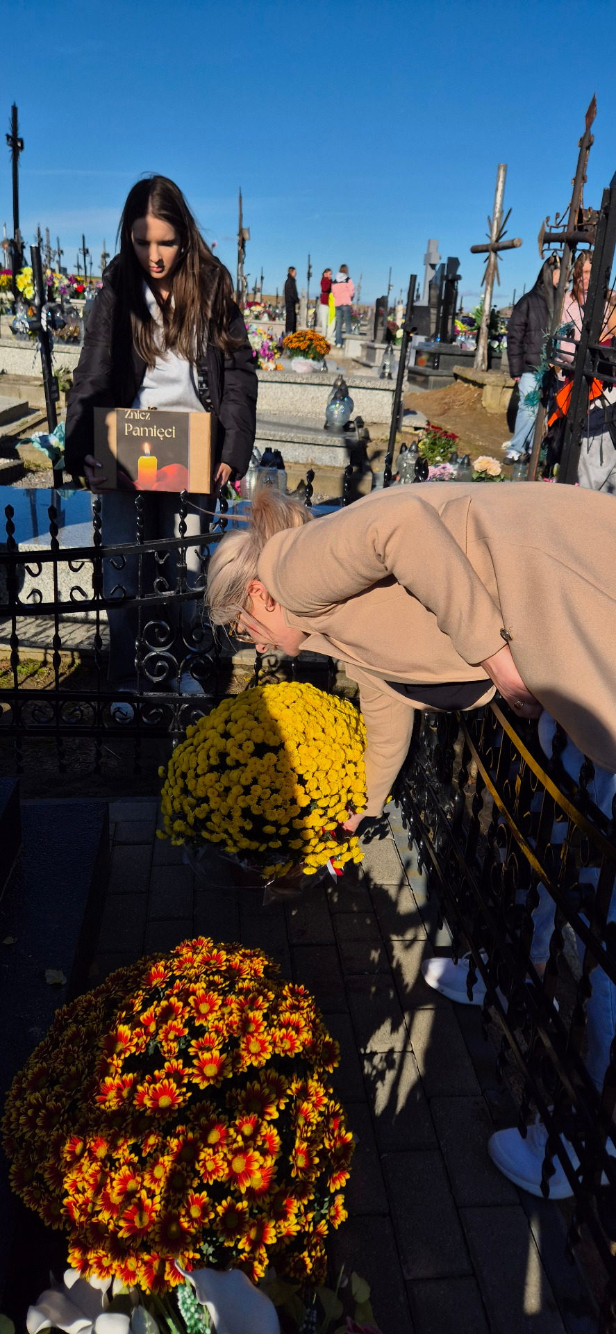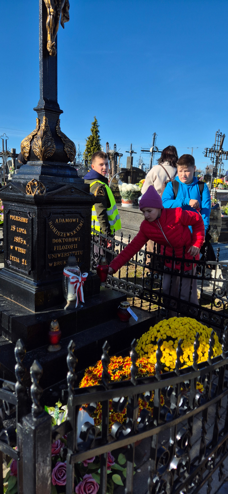 Wspólnie zapaliliśmy znicze na grobie naszego emerytowanego nauczyciela i pracownicy szkoły, a także zapaliliśmy znicze i złożyliśmy kwiaty na mogiłach, którymi opiekuje się szkoła: Adama Romiszewskiego, ks. Melchiora (Adama) Chmielewskiego i Józefa Tietza.