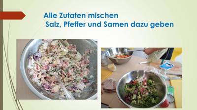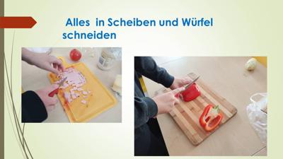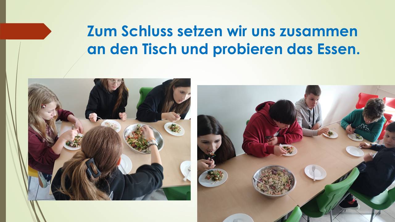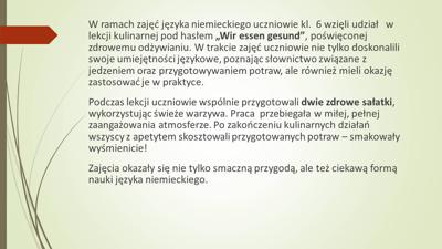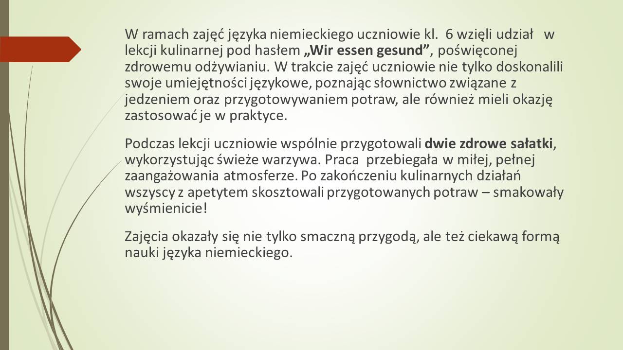 W ramach zajęć języka niemieckiego uczniowie kl. 6 wzięli udział w lekcji kulinarnej pod hasłem „Wir essen gesund”, poświęconej zdrowemu odżywianiu. W trakcie zajęć uczniowie nie tylko doskonalili swoje umiejętności językowe, poznając słownictwo związane z jedzeniem oraz przygotowywaniem potraw, ale również mieli okazję zastosować je w praktyce.