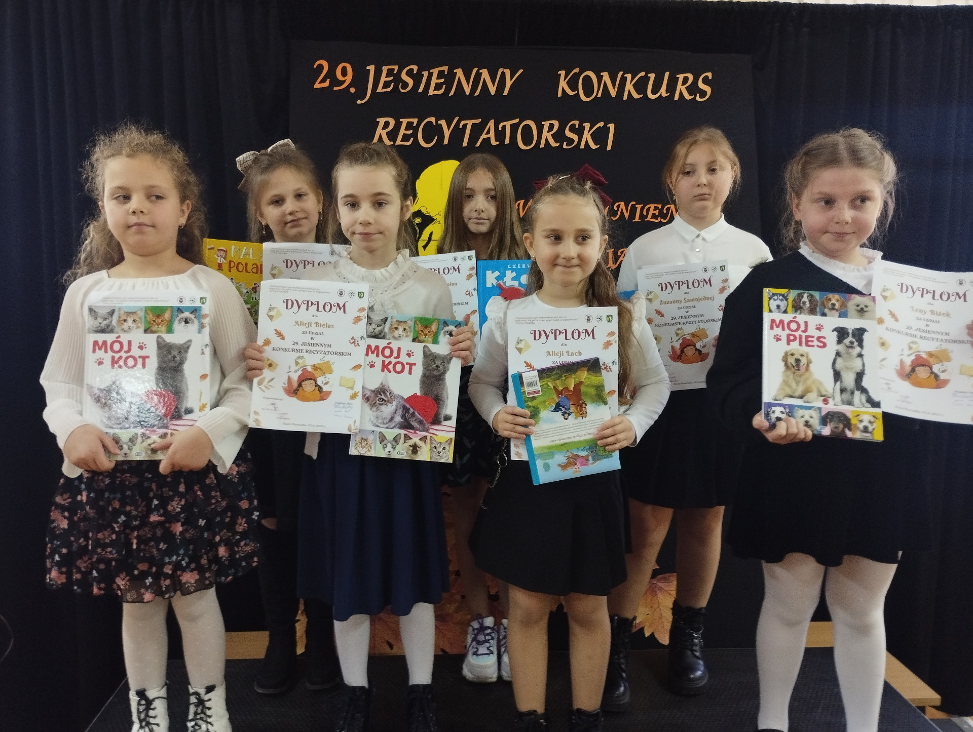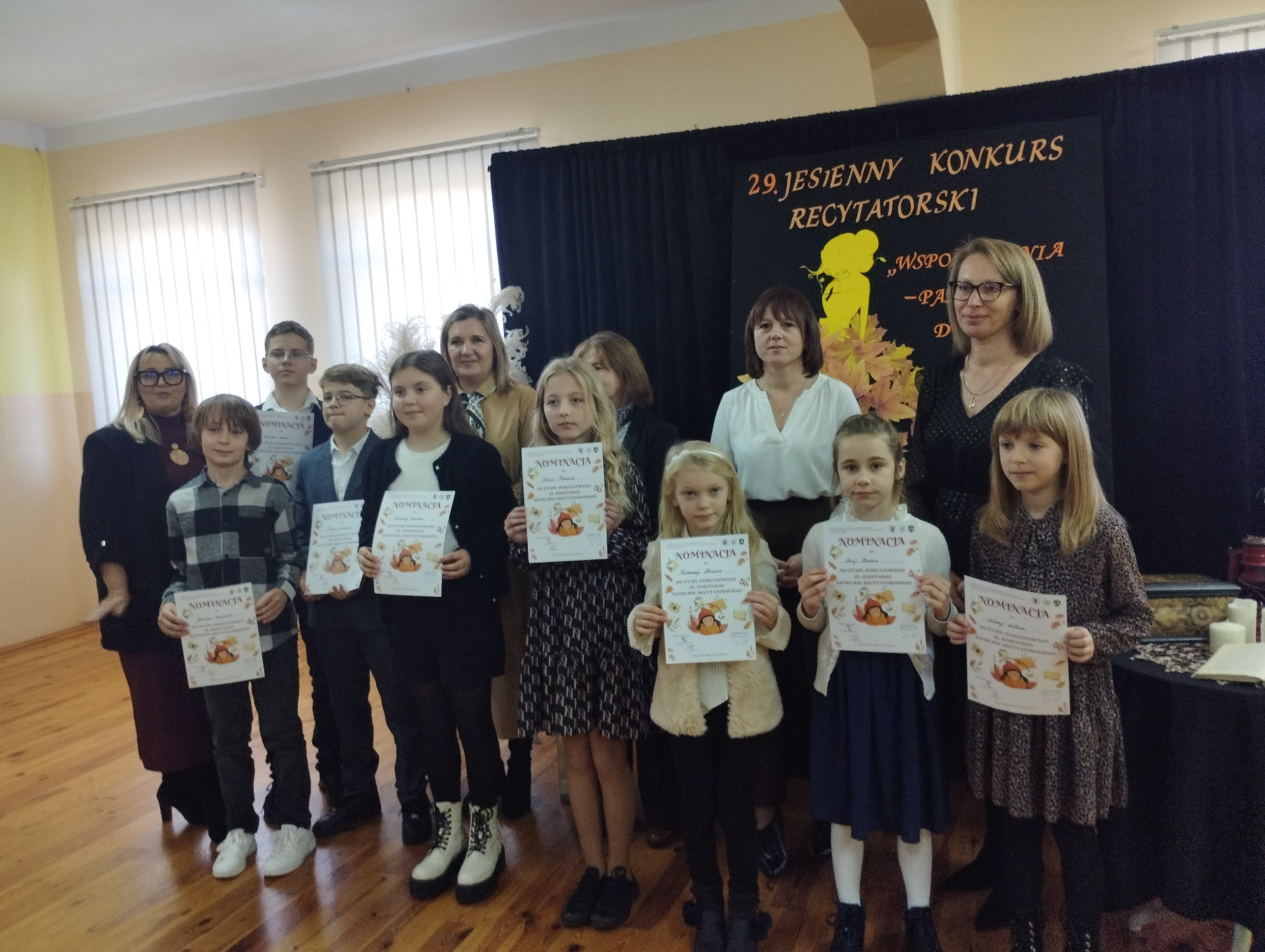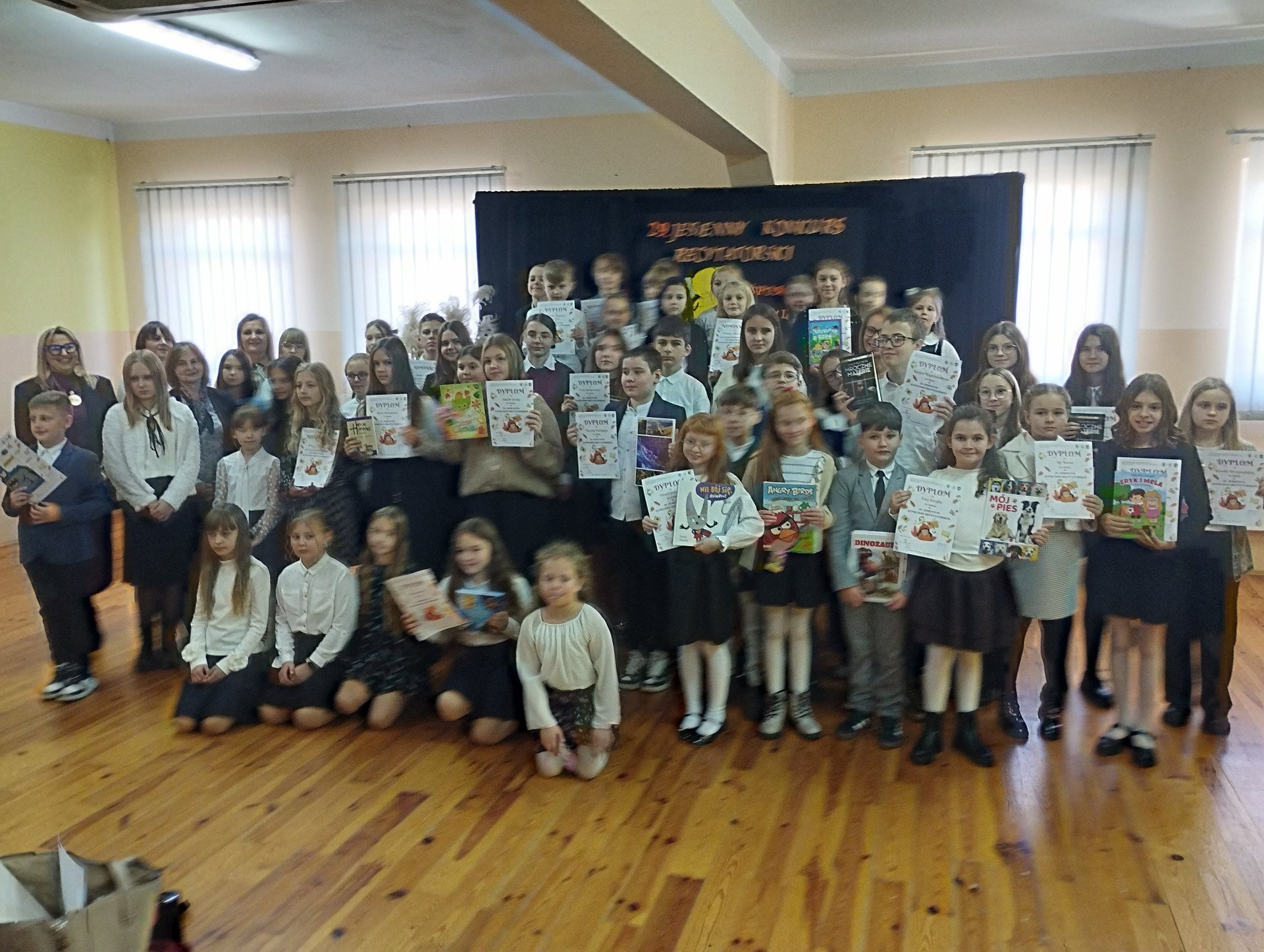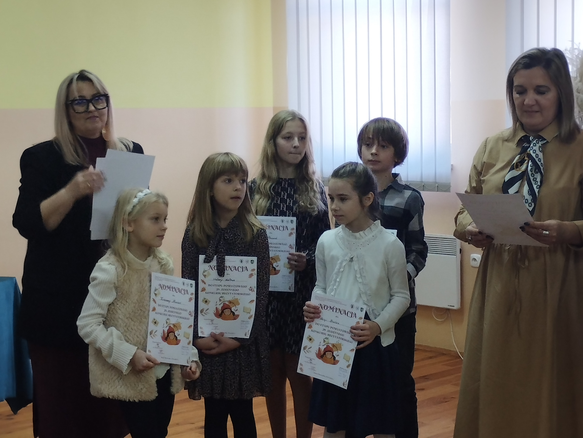 Wszystkie uczennice. otrzymały pamiątkowe dyplomy i nagrody książkowe. Nagrody wręczyła Pani Elżbieta Kowalczyk Wójt Gminy Szastarka . Nominację do powiatowego konkursu otrzymała Bielas Alicja i Ptaszek Oliwia. Serdecznie dziękujemy i gratulujemy naszym uczennicom występu w konkursie a także nominacji Alicji i Oliwii. Eliminacje powiatowe konkursu odbędą się 13 listopada 2025 r. w siedzibie Gminnego Ośrodka Kultury w Trzydniku Dużym. Życzymy sukcesów na kolejnym etapie konkursu.