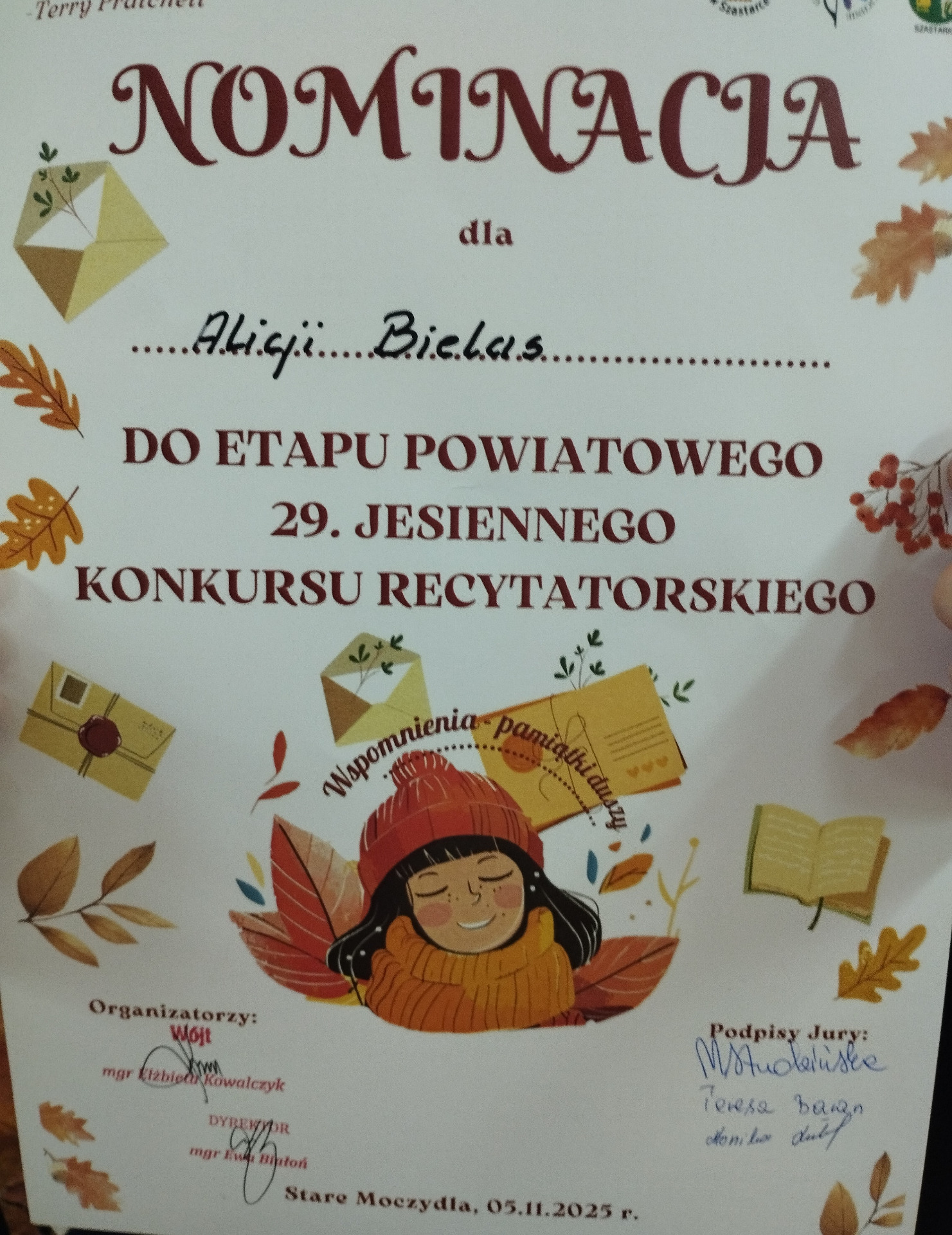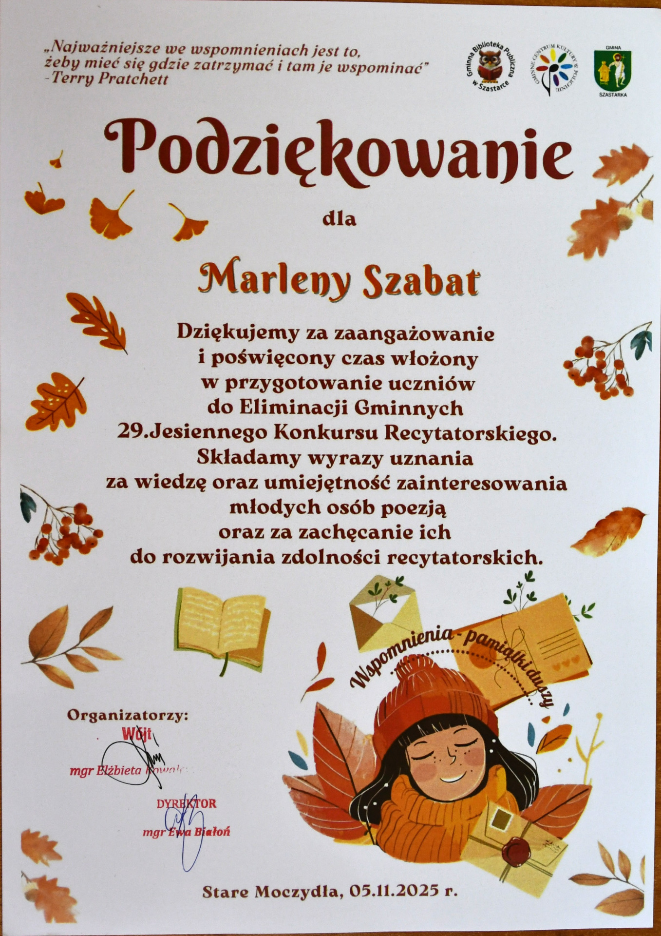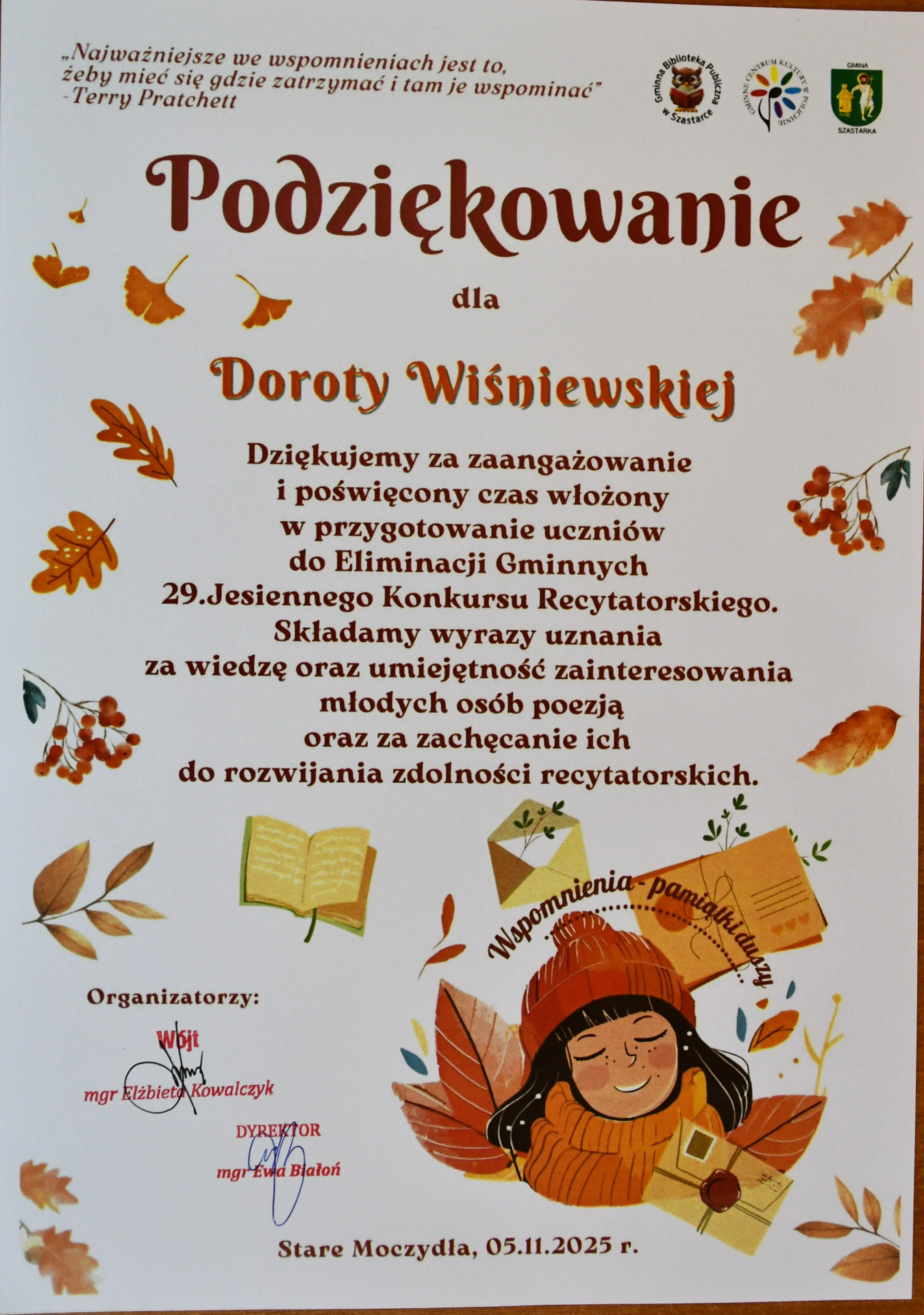 W dniu 5 listopada 2025 roku w Wiejskim Domu Kultury w Starych Moczydłach odbyły się zorganizowane przez Gminną Bibliotekę Publiczną w Szastarce wraz z Gminnym Centrum Kultury w Polichnie eliminacje do 29. Jesiennego Konkursu Recytatorskiego. Wspólnym tematem wszystkich występów były „Wspomnienia- pamiątki duszy”. Naszą szkołę reprezentowały następujące uczennice:
