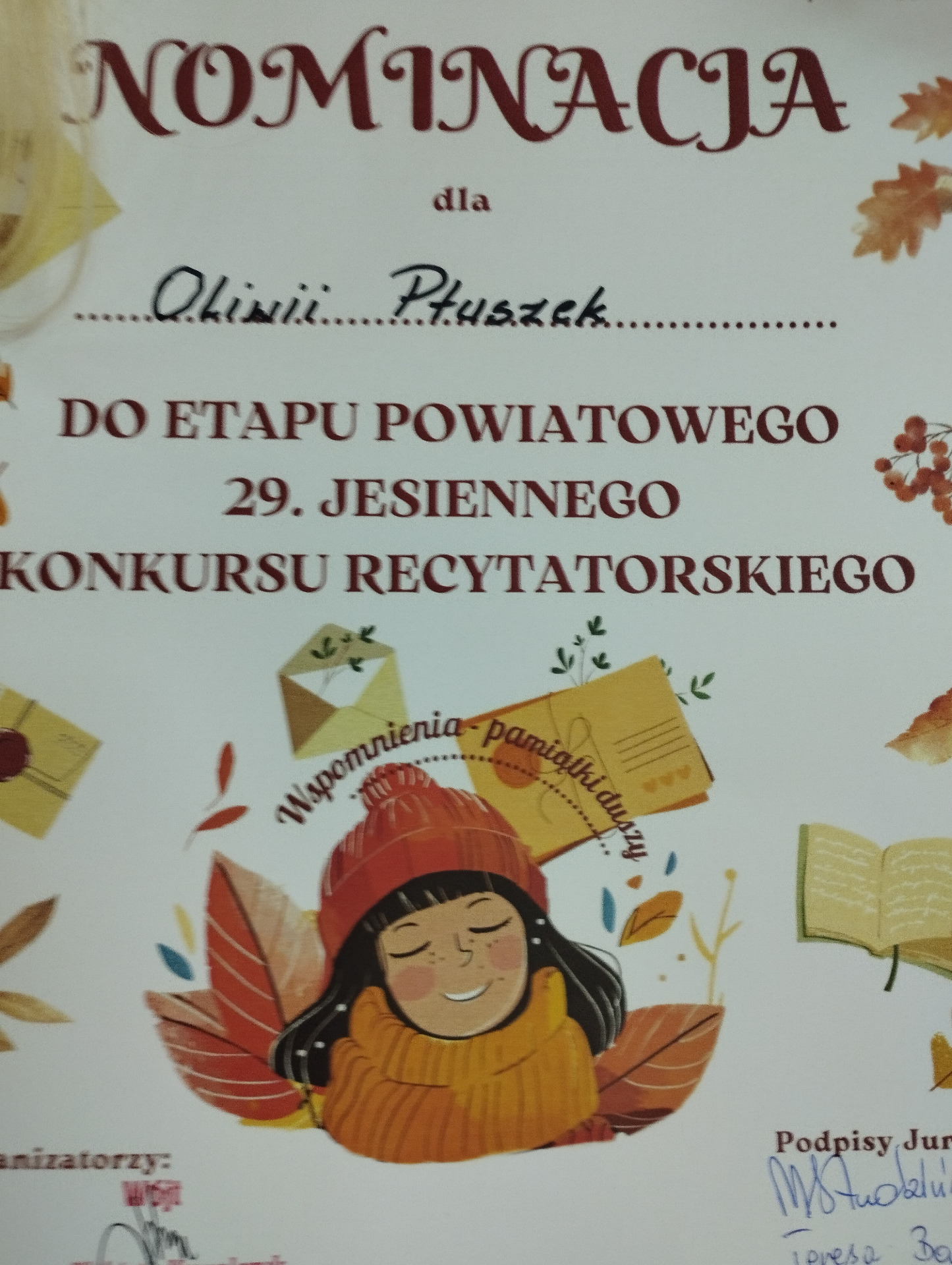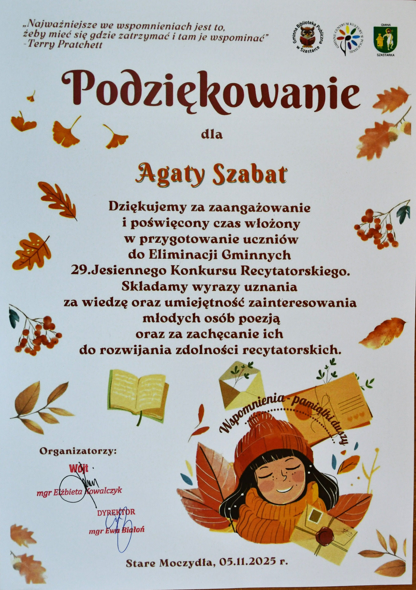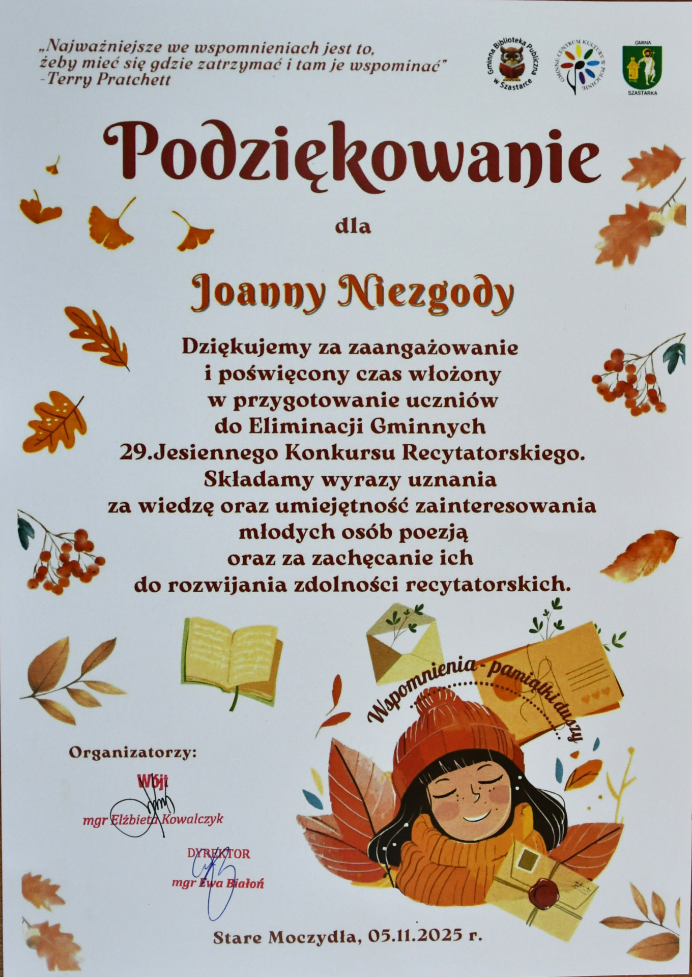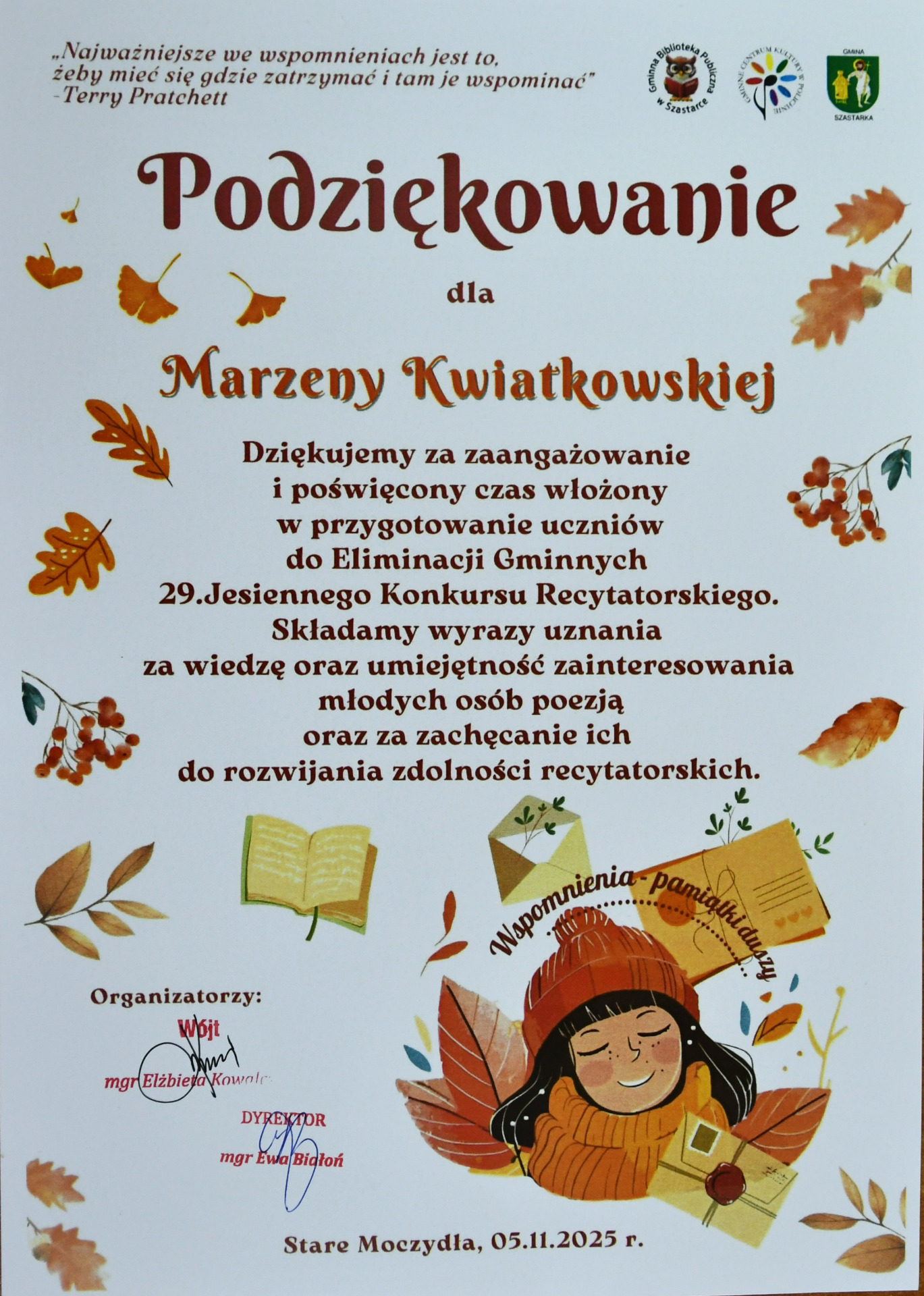 W dniu 5 listopada 2025 roku w Wiejskim Domu Kultury w Starych Moczydłach odbyły się zorganizowane przez Gminną Bibliotekę Publiczną w Szastarce wraz z Gminnym Centrum Kultury w Polichnie eliminacje do 29. Jesiennego Konkursu Recytatorskiego. Wspólnym tematem wszystkich występów były „Wspomnienia- pamiątki duszy”. Naszą szkołę reprezentowały następujące uczennice: