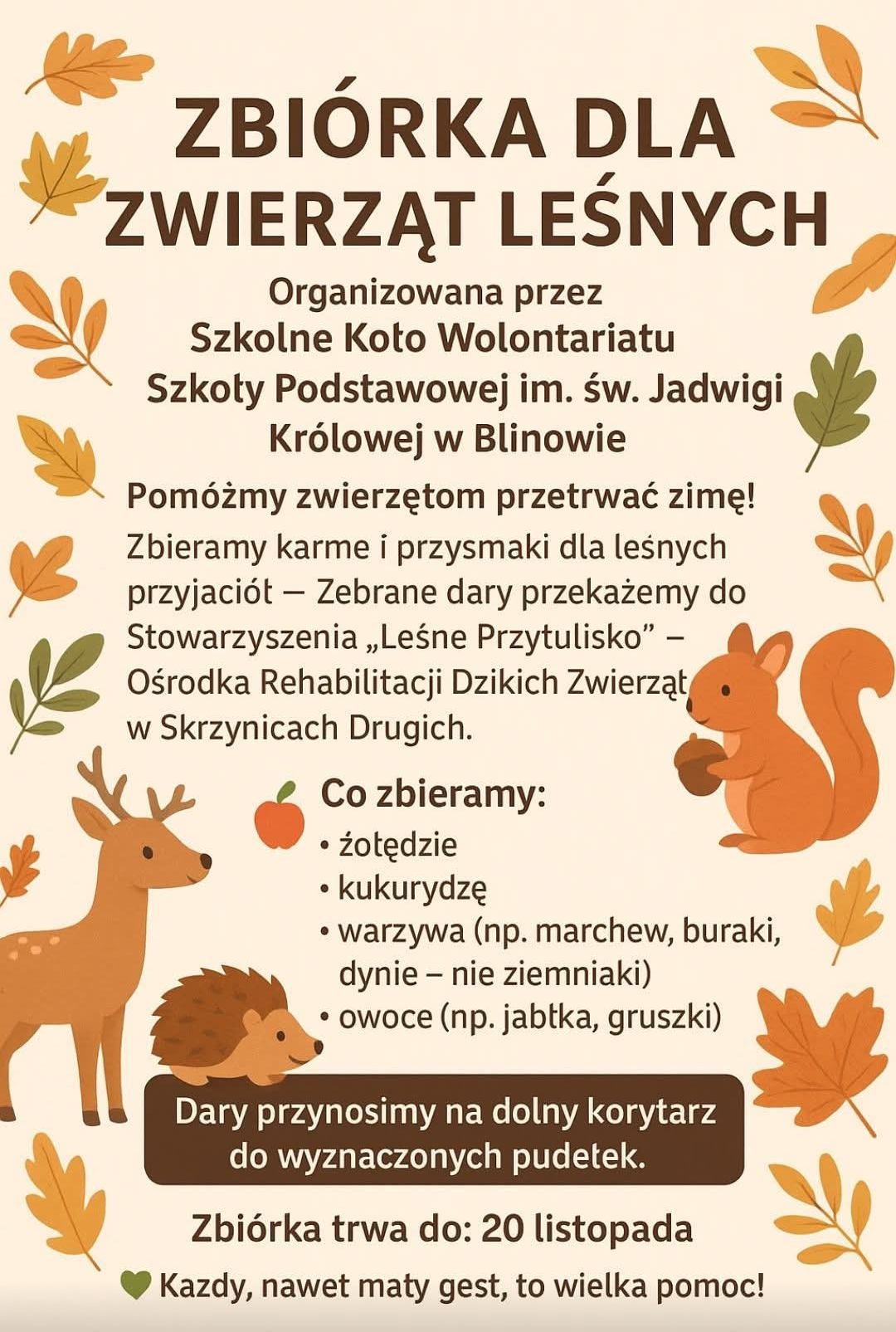 Szkolne Koło Wolontariatu Szkoły Podstawowej im. św. Jadwigi Królowej w Blinowie zaprasza do udziału w zbiórce karmy i przysmaków dla zwierząt leśnych.