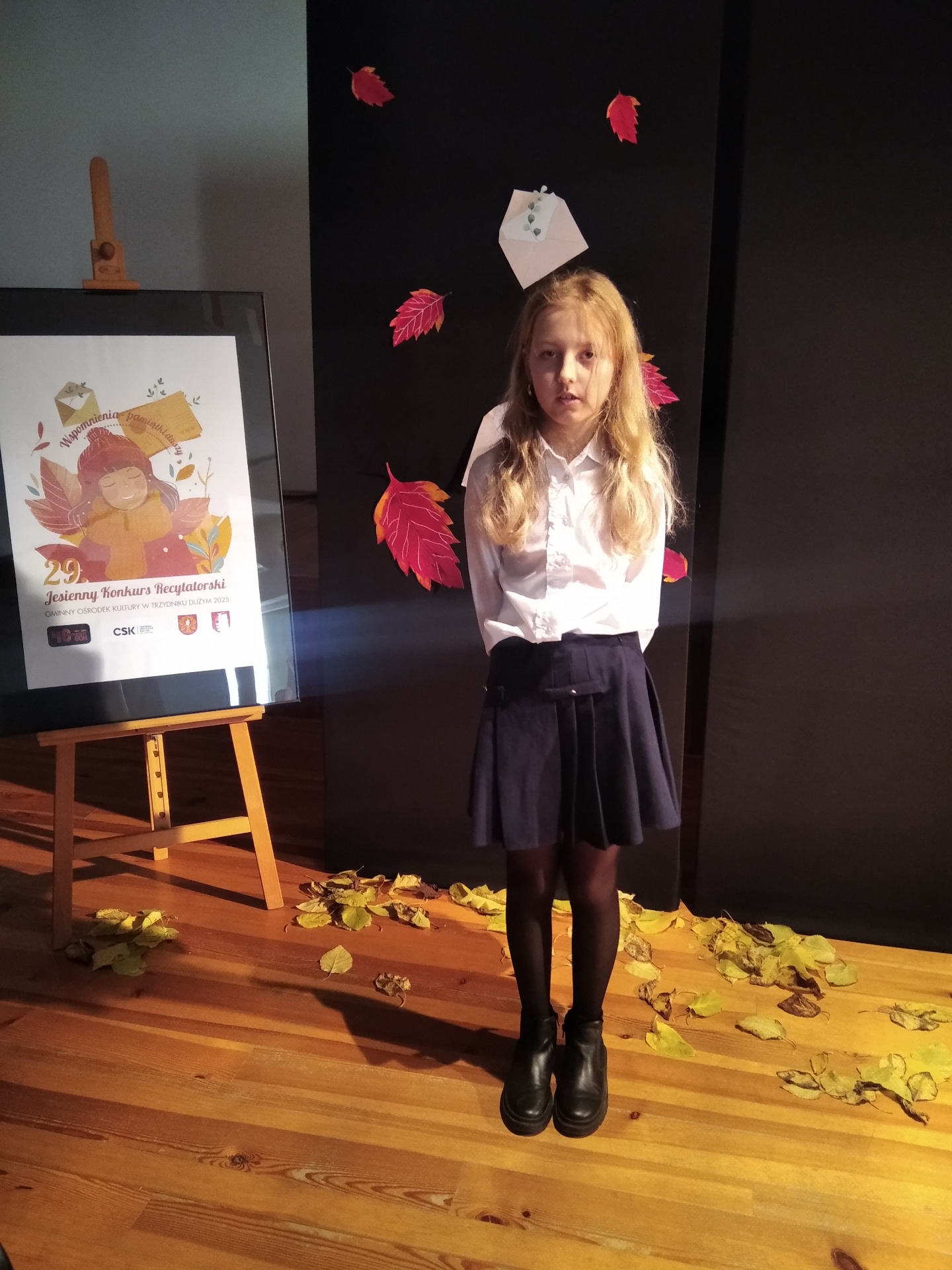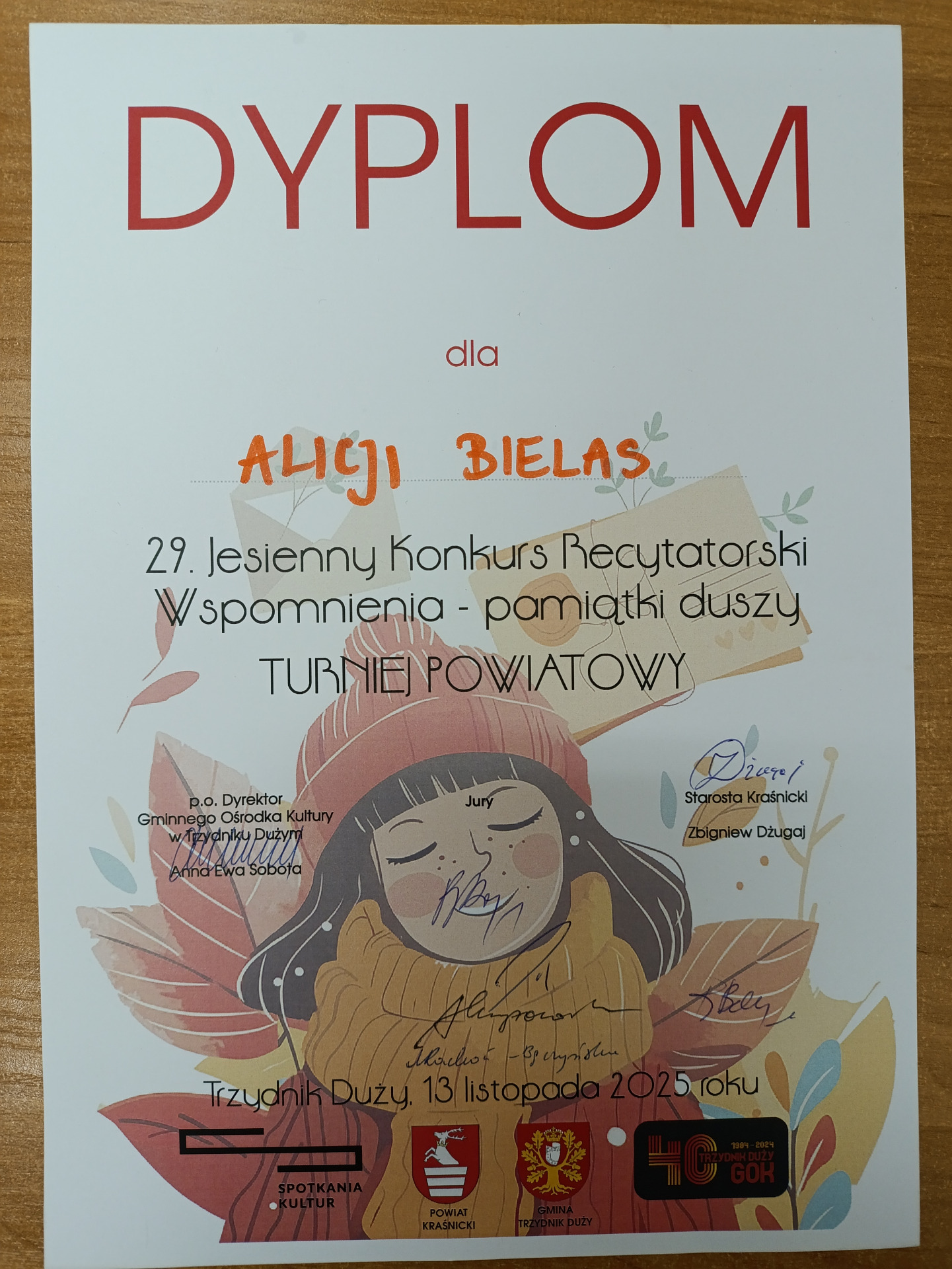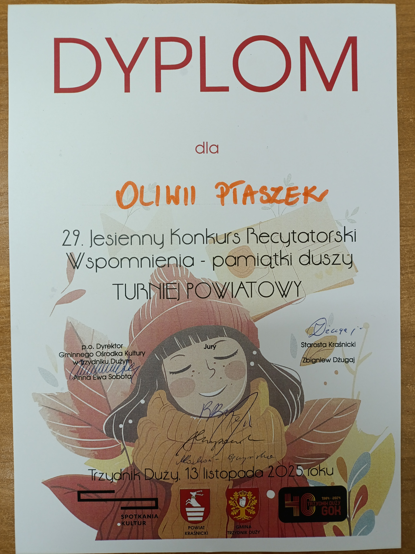 W eliminacjach powiatowych naszą szkołę reprezentowała Oliwia Ptaszek, uczennica klasy 5 i Alicja Bielas, uczennica klasy 2. Sześćdziesięciu najlepszych recytatorów ze wszystkich gmin powiatu kraśnickiego przypomniały nam, jak wielką moc mają słowa i wspomnienia, które nosimy w sercu. Jesienny Konkurs Recytatorski był nie tylko artystycznym spotkaniem, ale też piękną lekcją wrażliwości. Serdecznie dziękujemy naszym dziewczynkom za piękny występ pełen emocji za który zostały nagrodzone dyplomem i nagrodą.