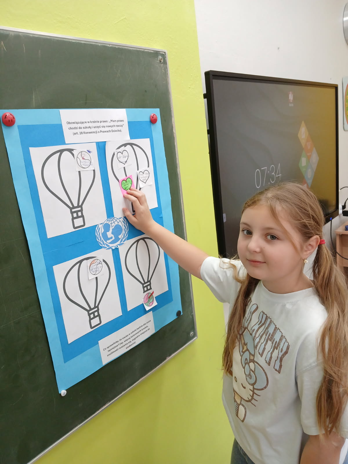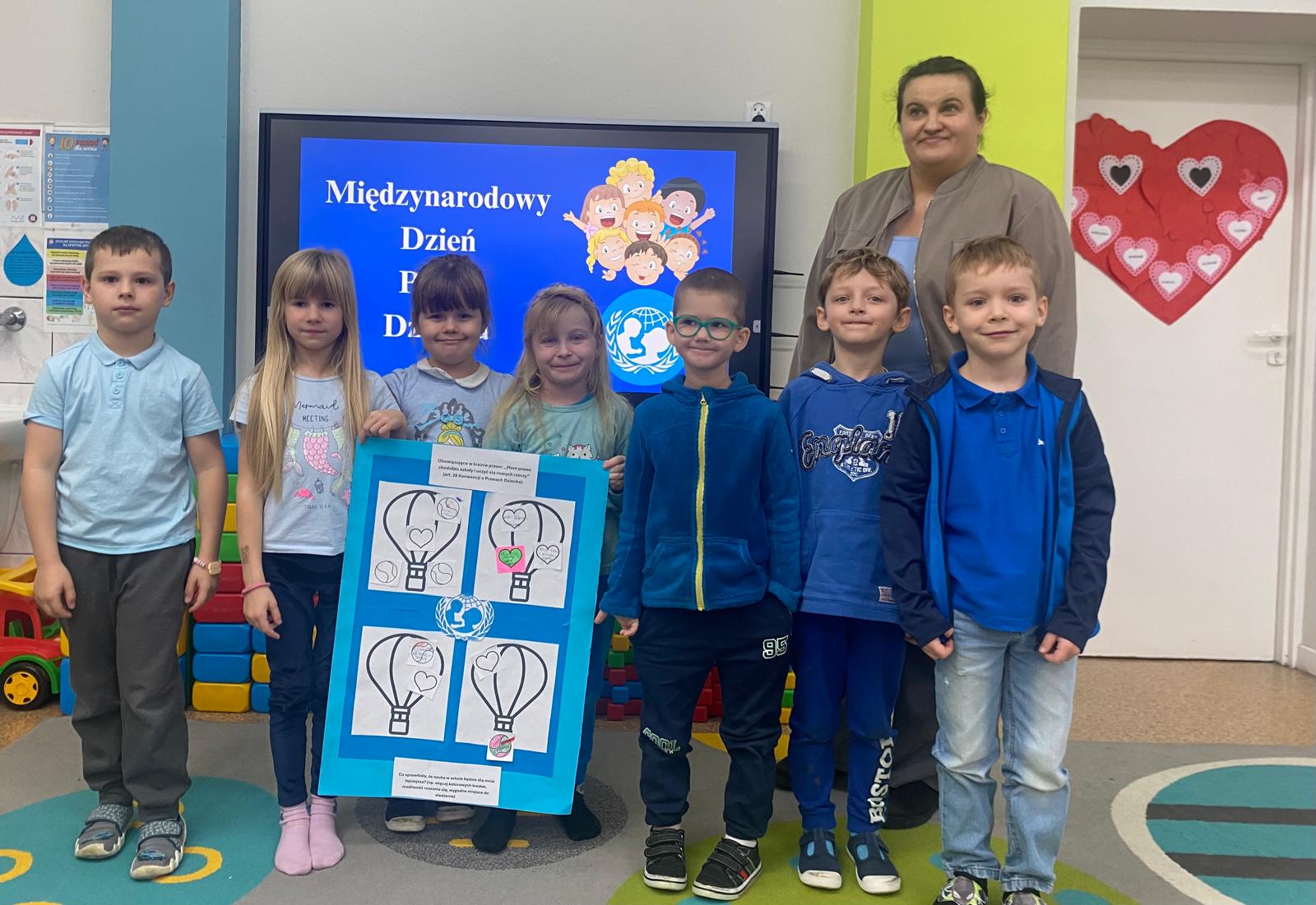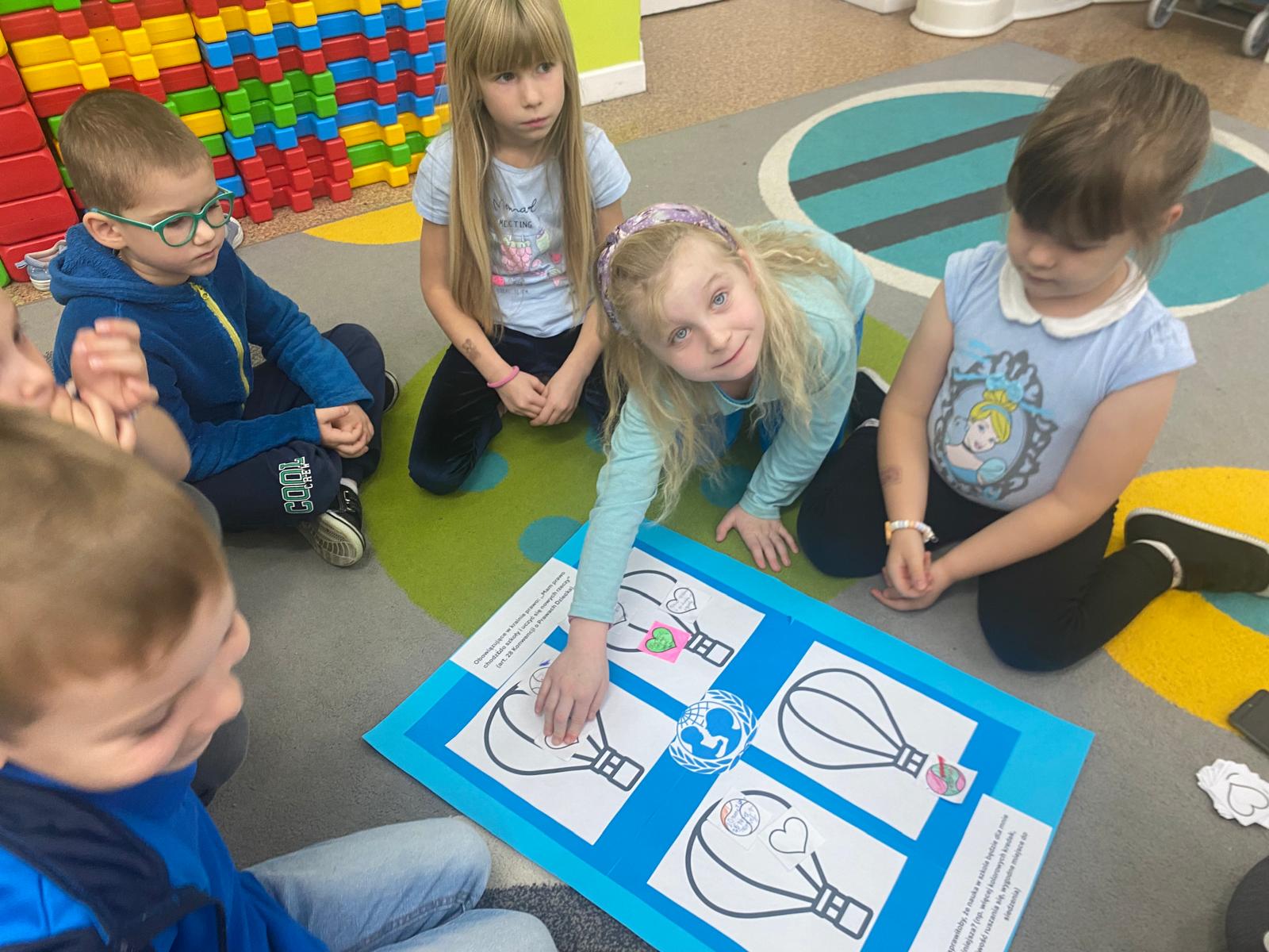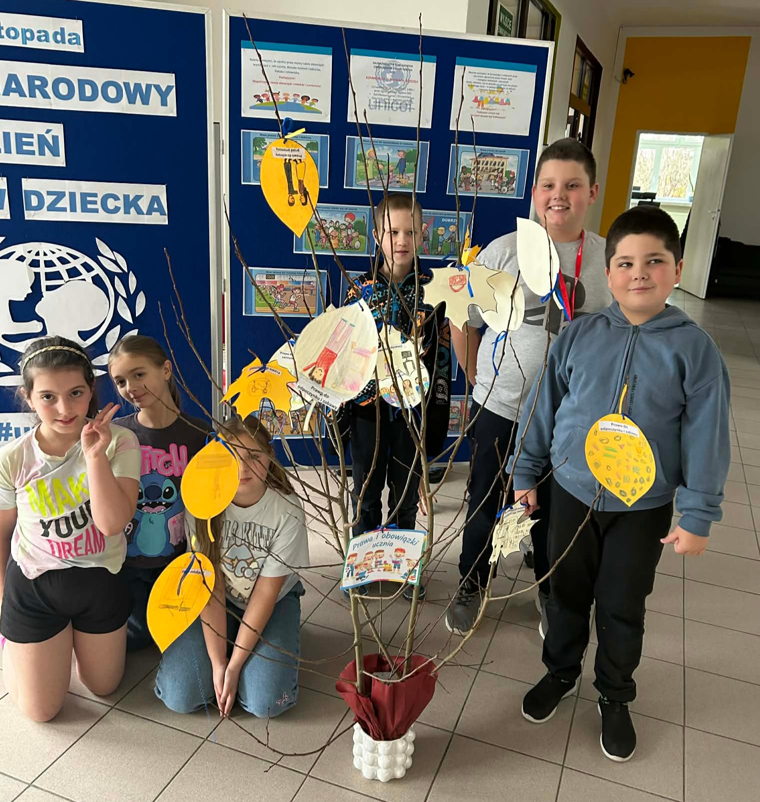 Młodsze dzieci wyruszyły w edukacyjną „Podróż Balonem” po świecie praw dziecka – odkrywały je , rozmawiały o ich znaczeniu oraz wspólnie zastanawiały się jak troszczyć się o nie w naszej szkolnej społeczności. W trakcie zajęć dzieci ilustrowały najważniejsze prawa oraz tworzyły wspólne „Drzewo Praw i Obowiązków Ucznia”.