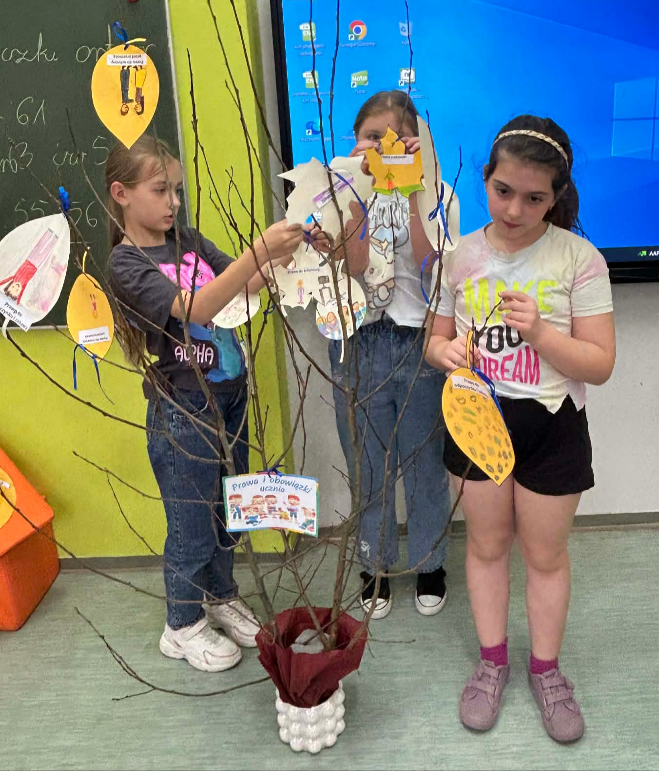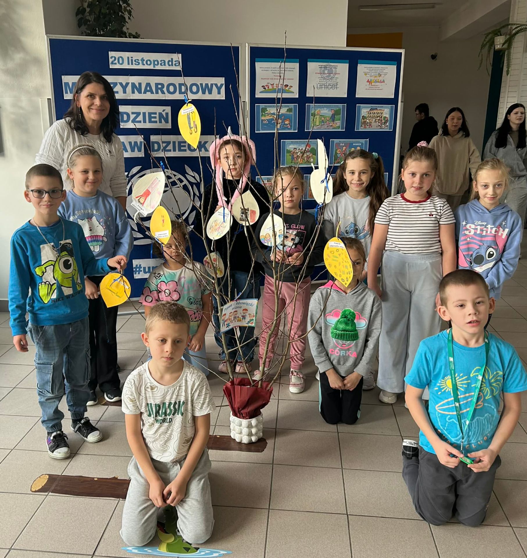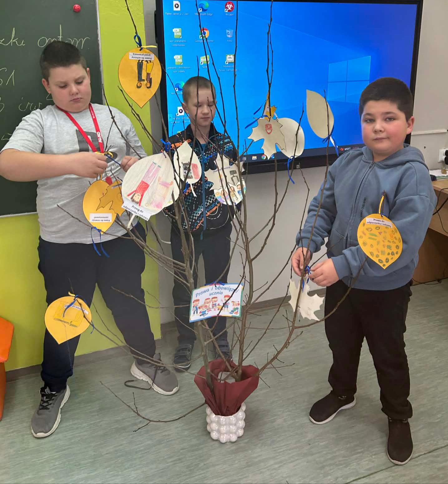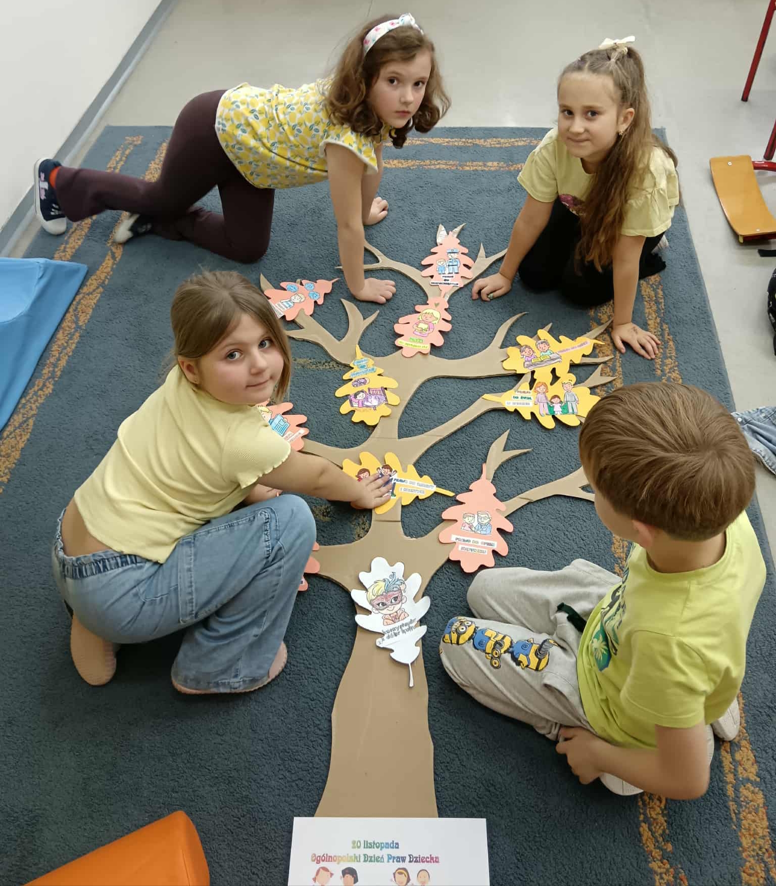 Młodsze dzieci wyruszyły w edukacyjną „Podróż Balonem” po świecie praw dziecka – odkrywały je , rozmawiały o ich znaczeniu oraz wspólnie zastanawiały się jak troszczyć się o nie w naszej szkolnej społeczności. W trakcie zajęć dzieci ilustrowały najważniejsze prawa oraz tworzyły wspólne „Drzewo Praw i Obowiązków Ucznia”.