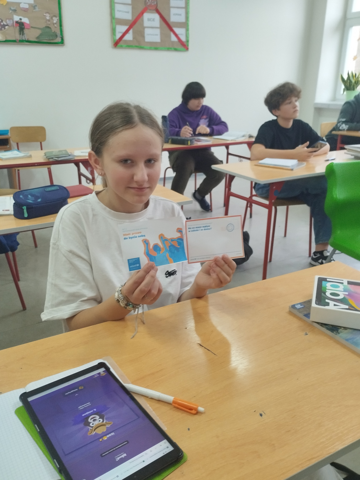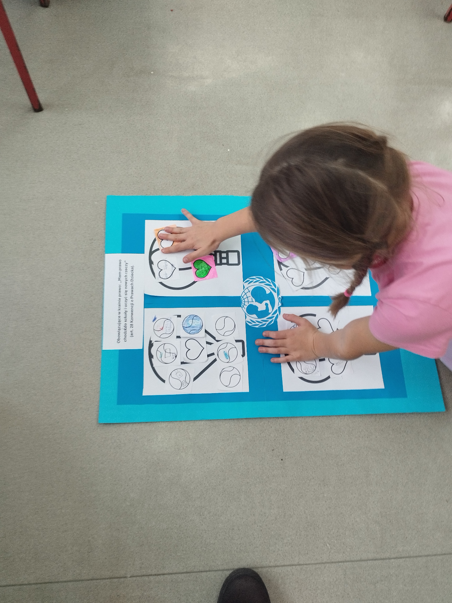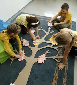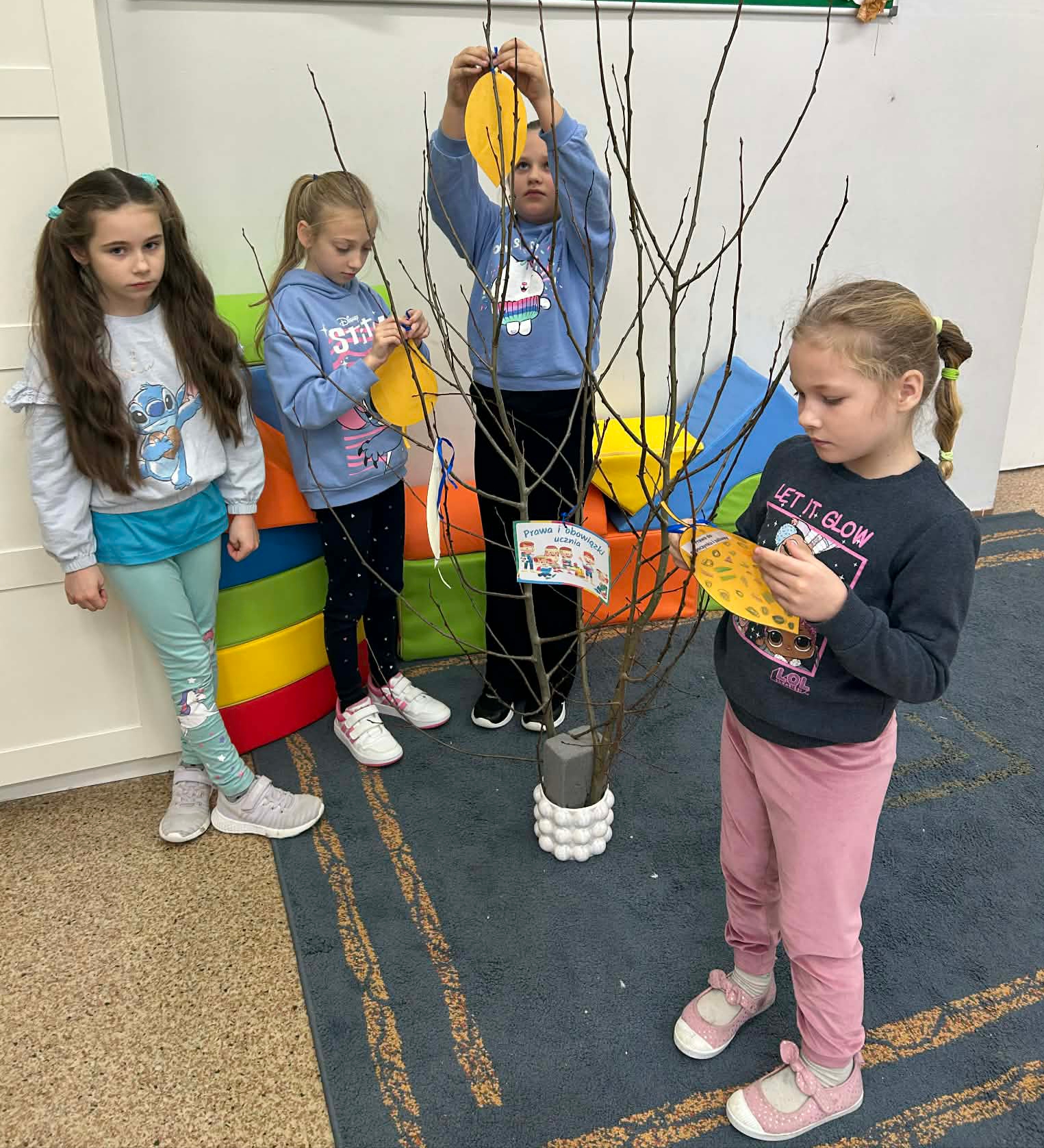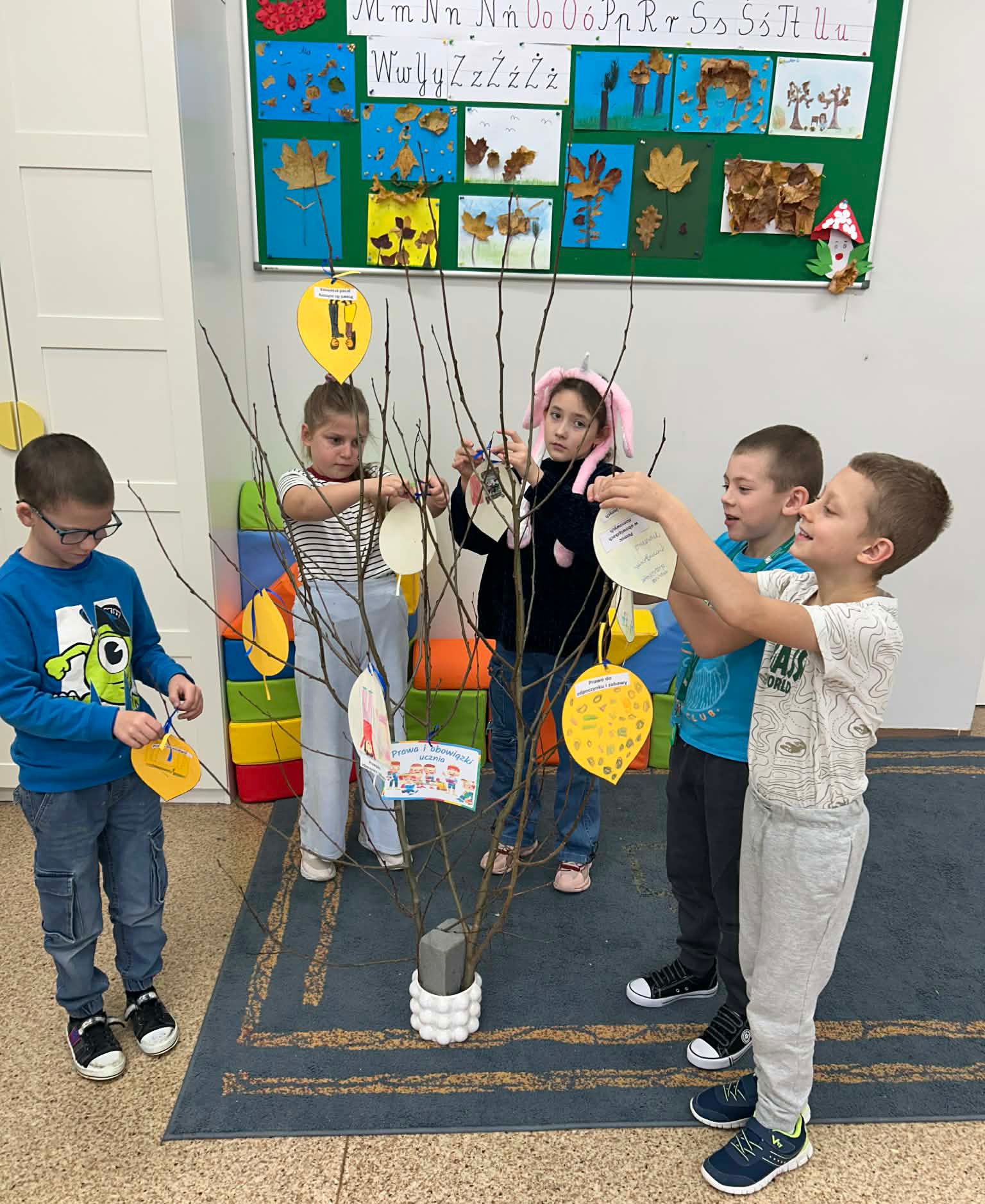 Młodsze dzieci wyruszyły w edukacyjną „Podróż Balonem” po świecie praw dziecka – odkrywały je , rozmawiały o ich znaczeniu oraz wspólnie zastanawiały się jak troszczyć się o nie w naszej szkolnej społeczności. W trakcie zajęć dzieci ilustrowały najważniejsze prawa oraz tworzyły wspólne „Drzewo Praw i Obowiązków Ucznia”.