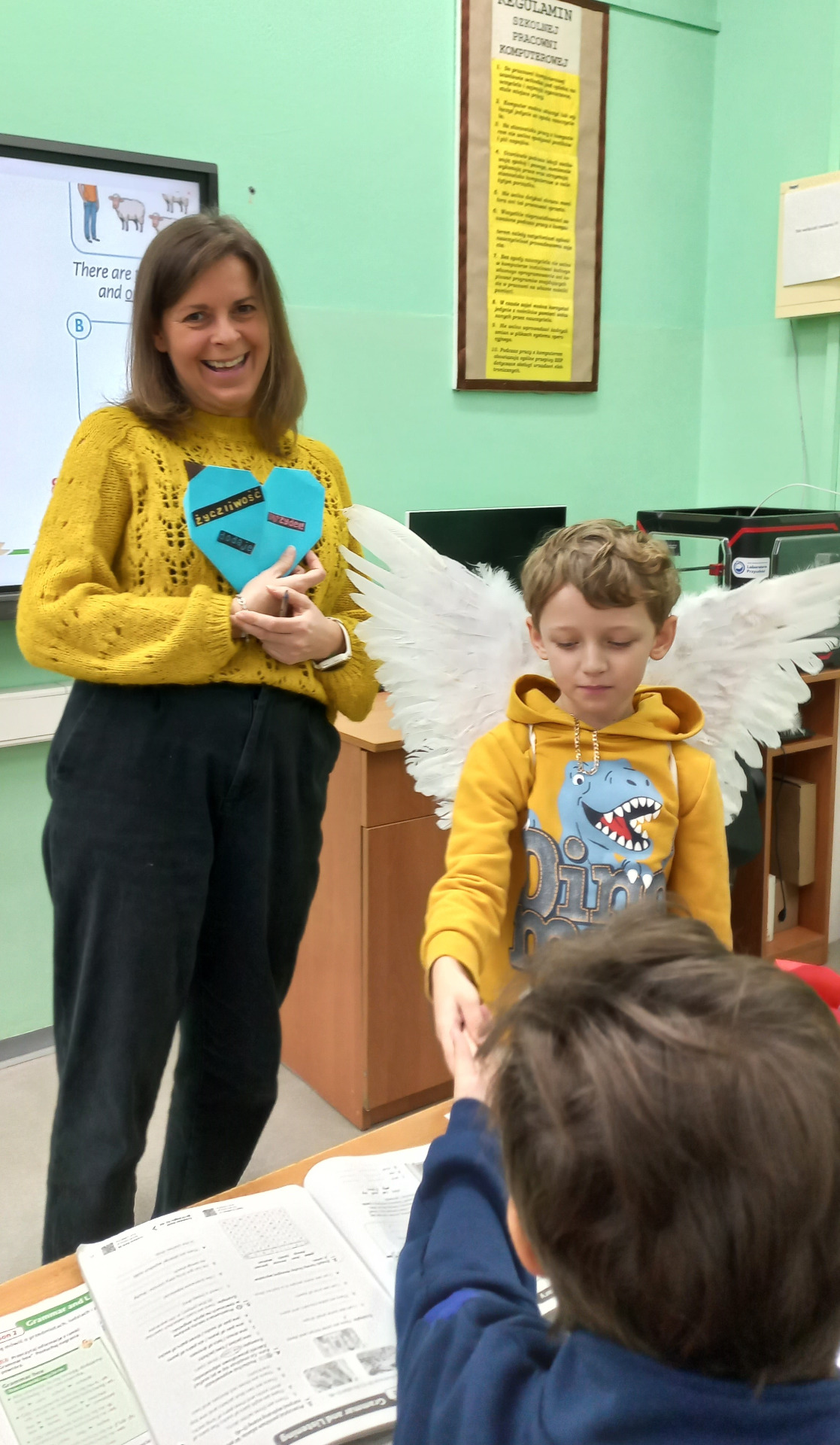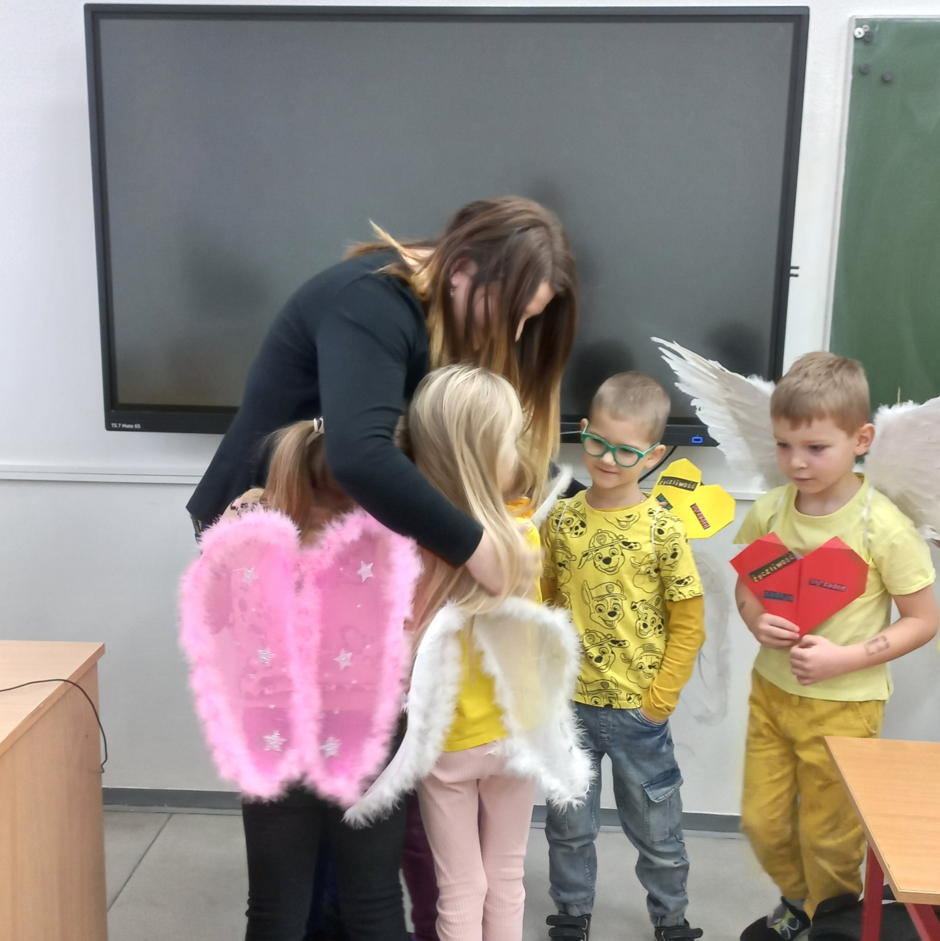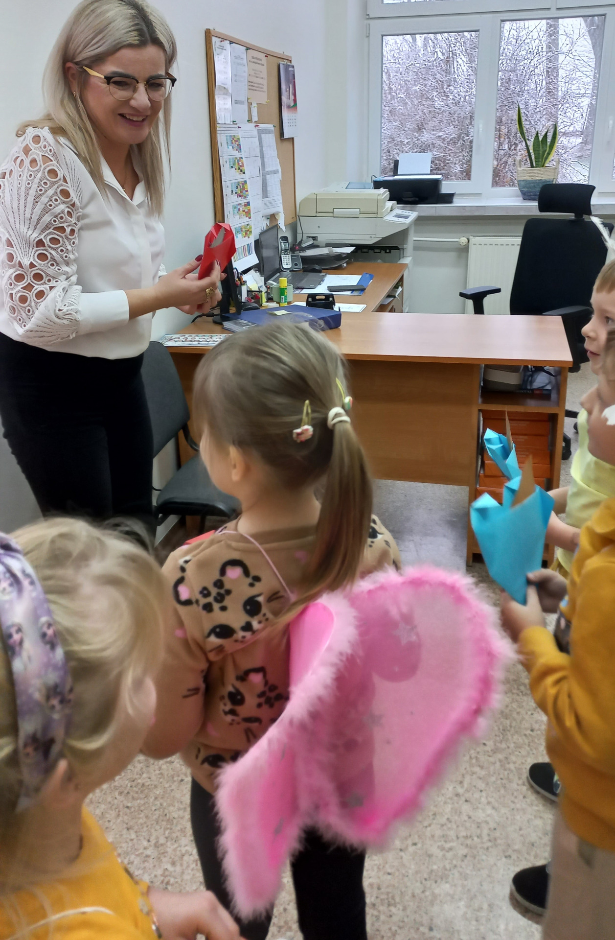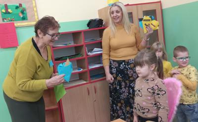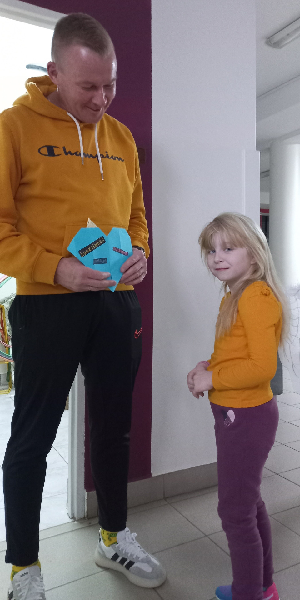 Dzieci wykonały serca techniką origami i wręczyły pracownikom szkoły w ramach podziękowania za ich codzienną, życzliwą obecność. Warto nadmienić, iż z pięknych skrzydeł, które im „wyrosły,” piórka trafiały do przygotowanych serc z nadzieją, że ich docelowym miejscem będzie to prawdziwe.