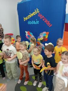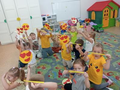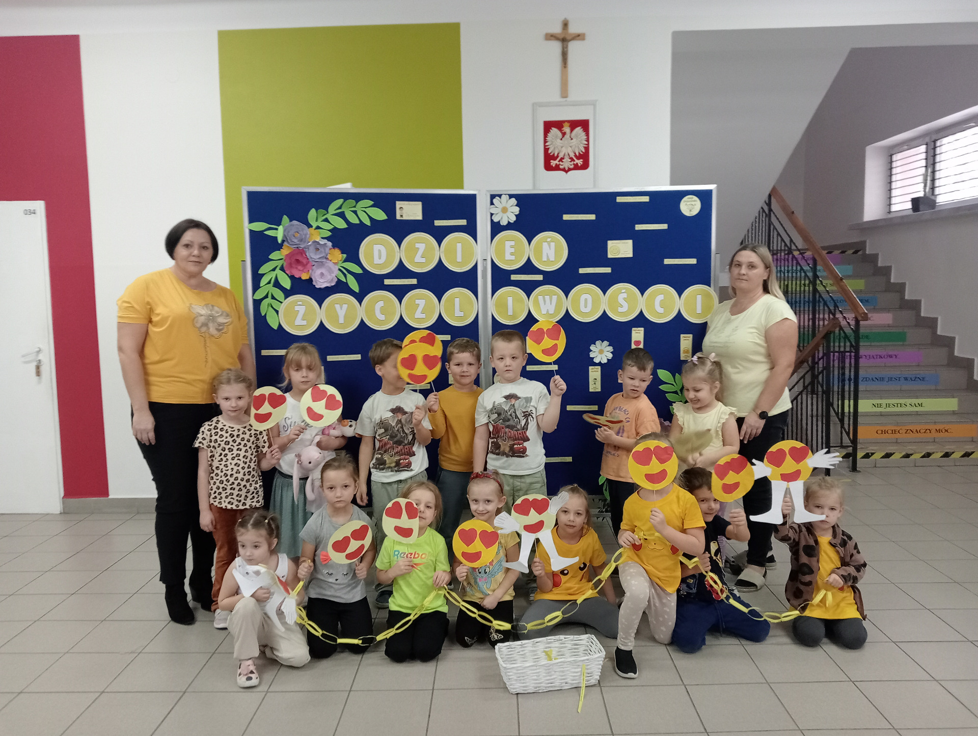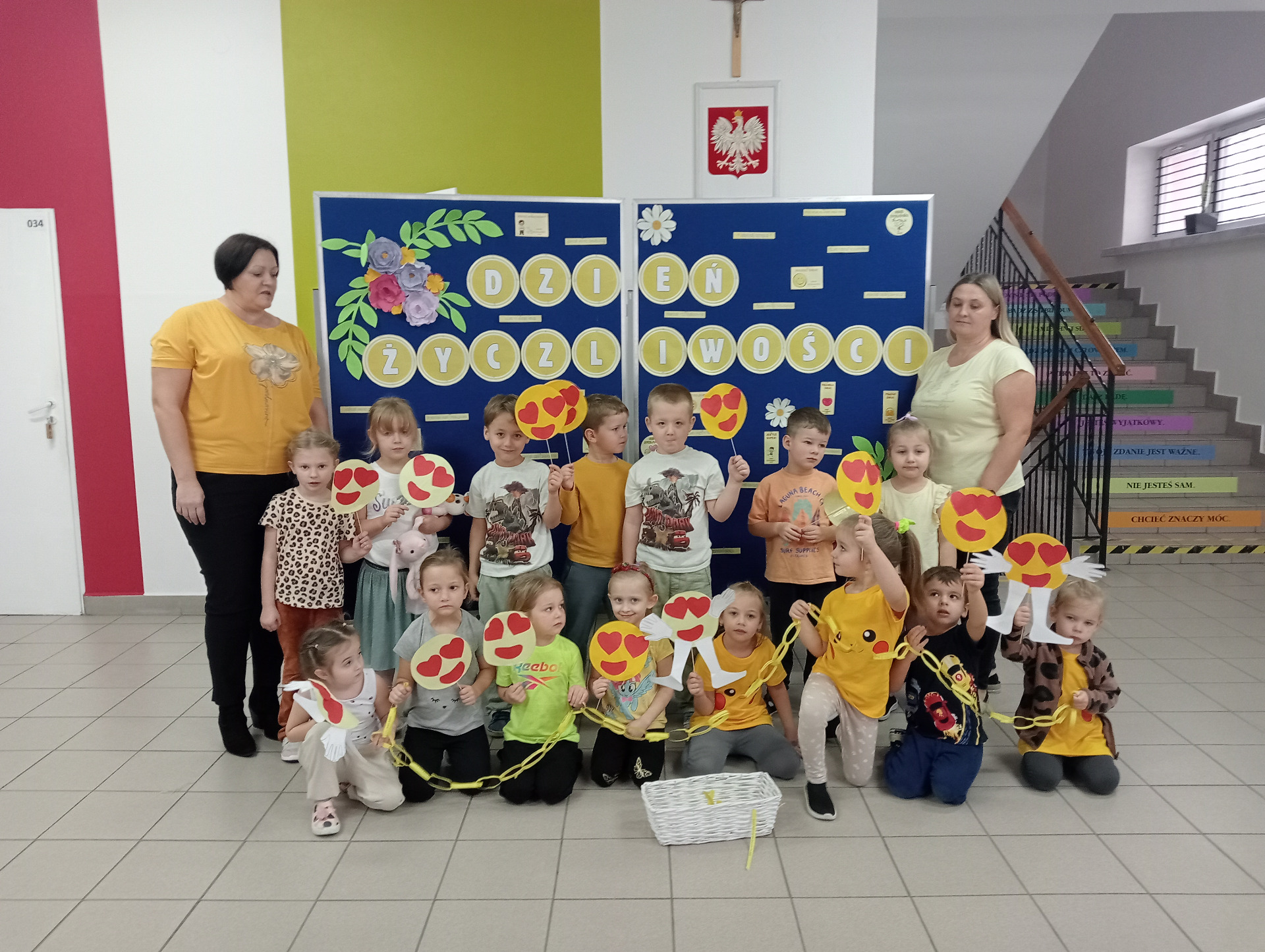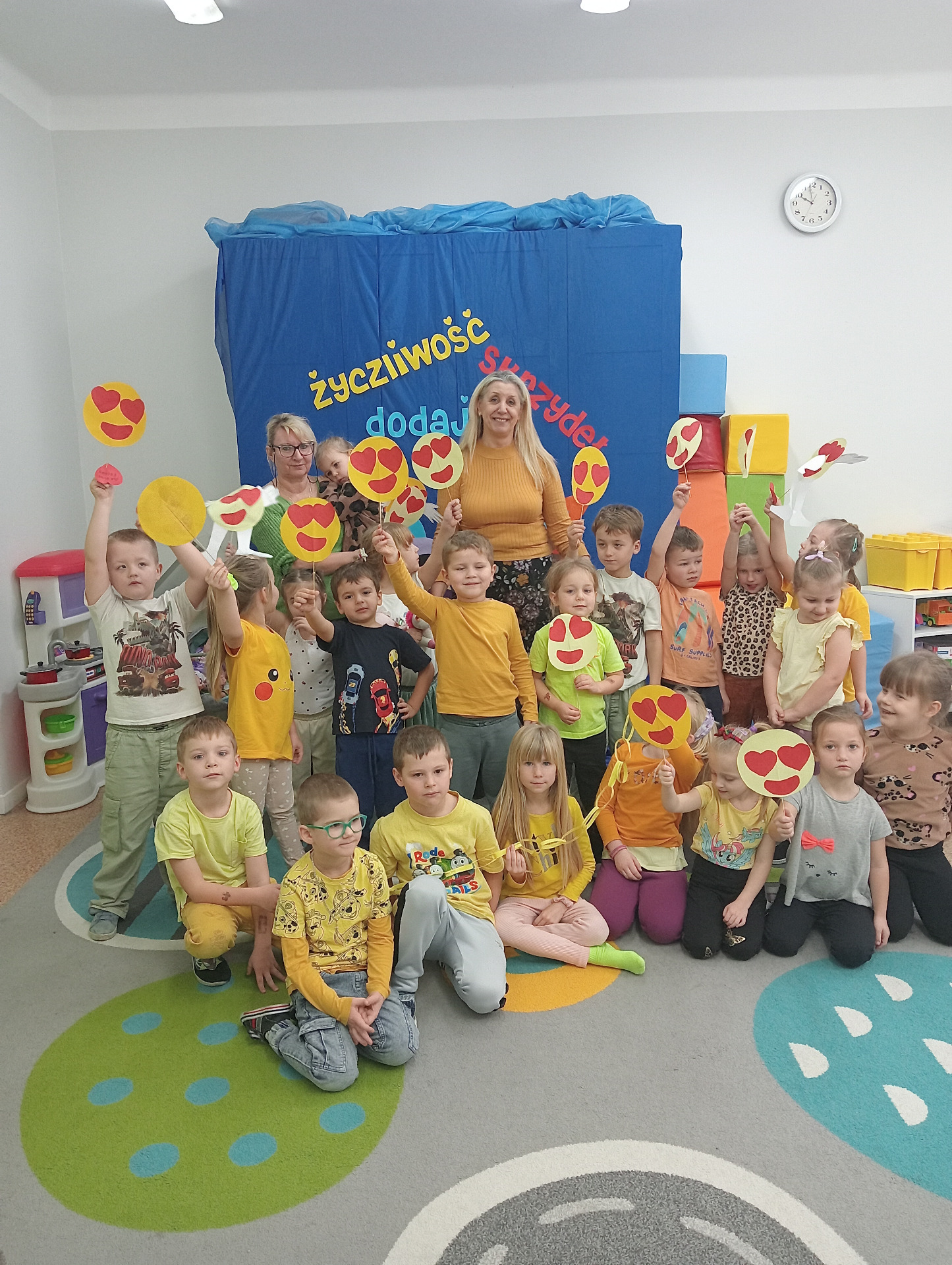 21 listopada w naszej najmłodszej grupie przedszkolnej obchodziliśmy Dzień Życzliwości, który wypełnił przedszkole radosną atmosferą i dobrymi uczynkami. Dzieci wysłuchały krótkiej rozmowy o tym, czym jest życzliwość i jak możemy okazywać ją każdego dnia😀♥️🫶. Następnie wykonały własne emotikony życzliwości – uśmiechnięte buźki ozdobione serduszkami😍. Przedszkolaki stworzyły Łańcuch Życzliwości, do którego dołączyła się cała społeczność szkolna. Każde dziecko dołączyło swoje żółte ogniwo z zapisanym miłym słowem. Wspólny łańcuch stał się symbolem jedności i wzajemnego wsparcia, pokazując, jak wiele dobrego możemy zrobić, gdy działamy razem.