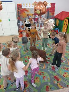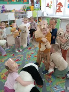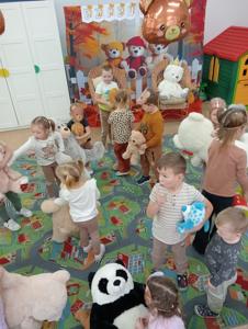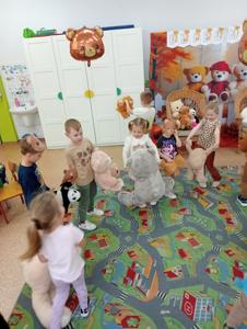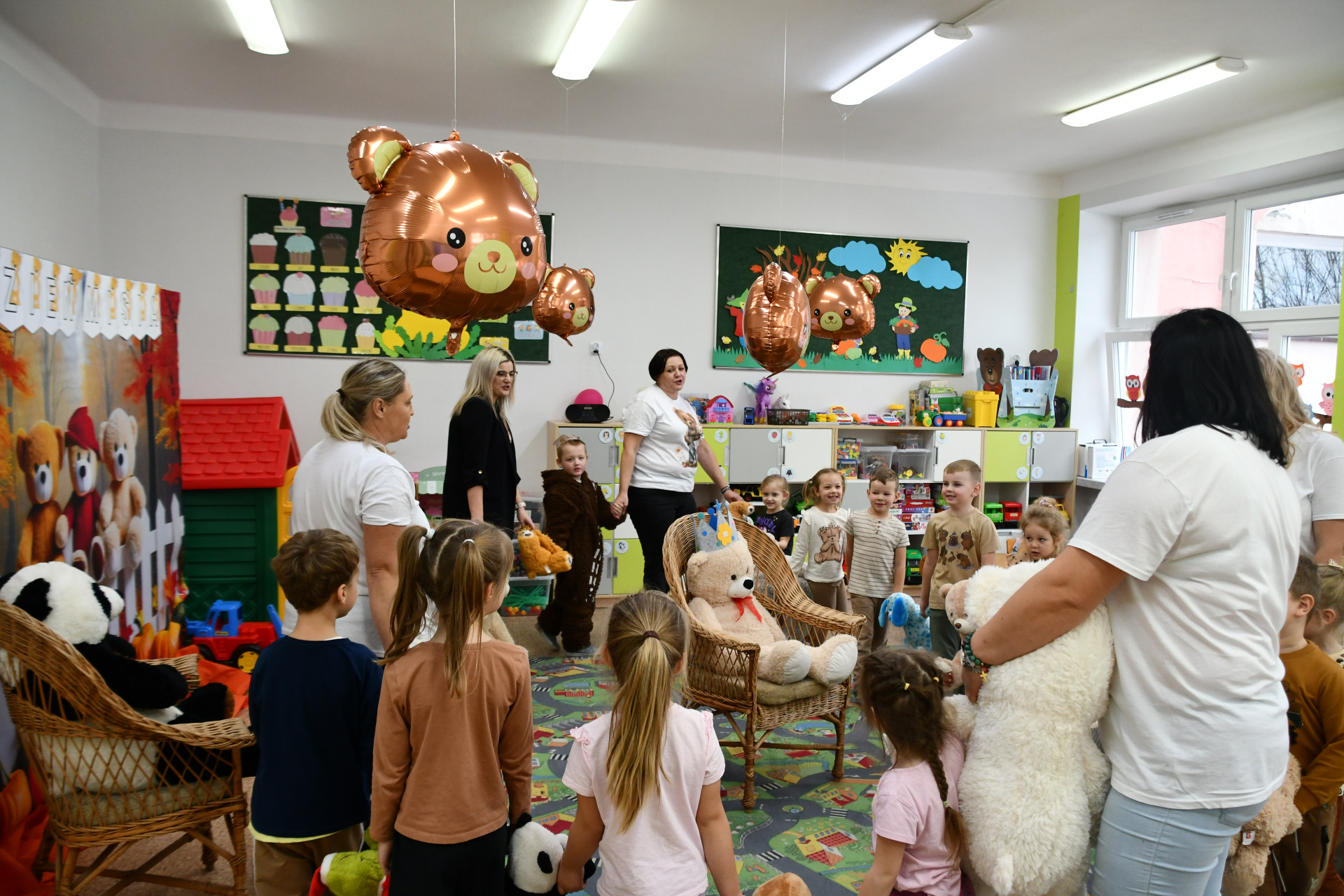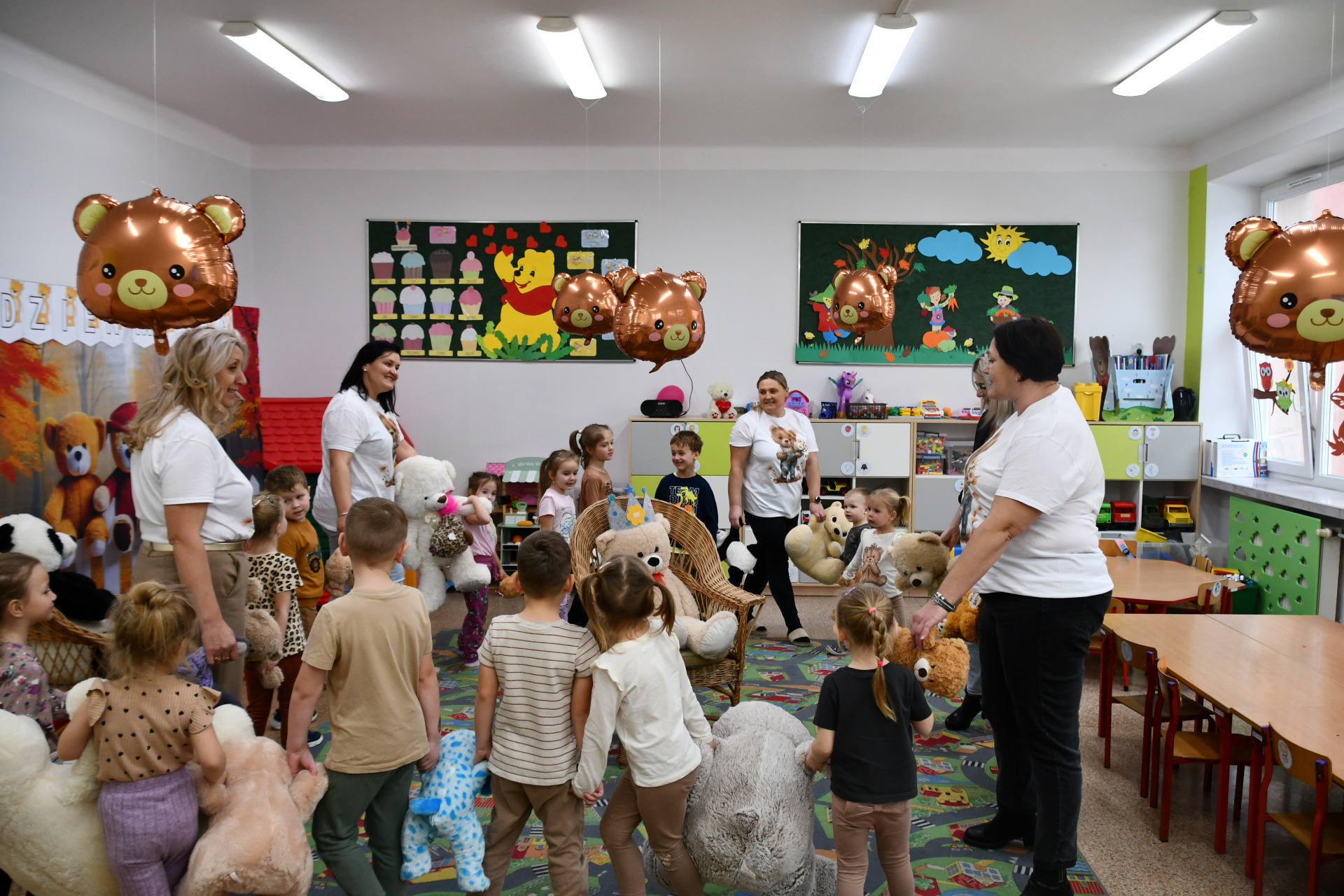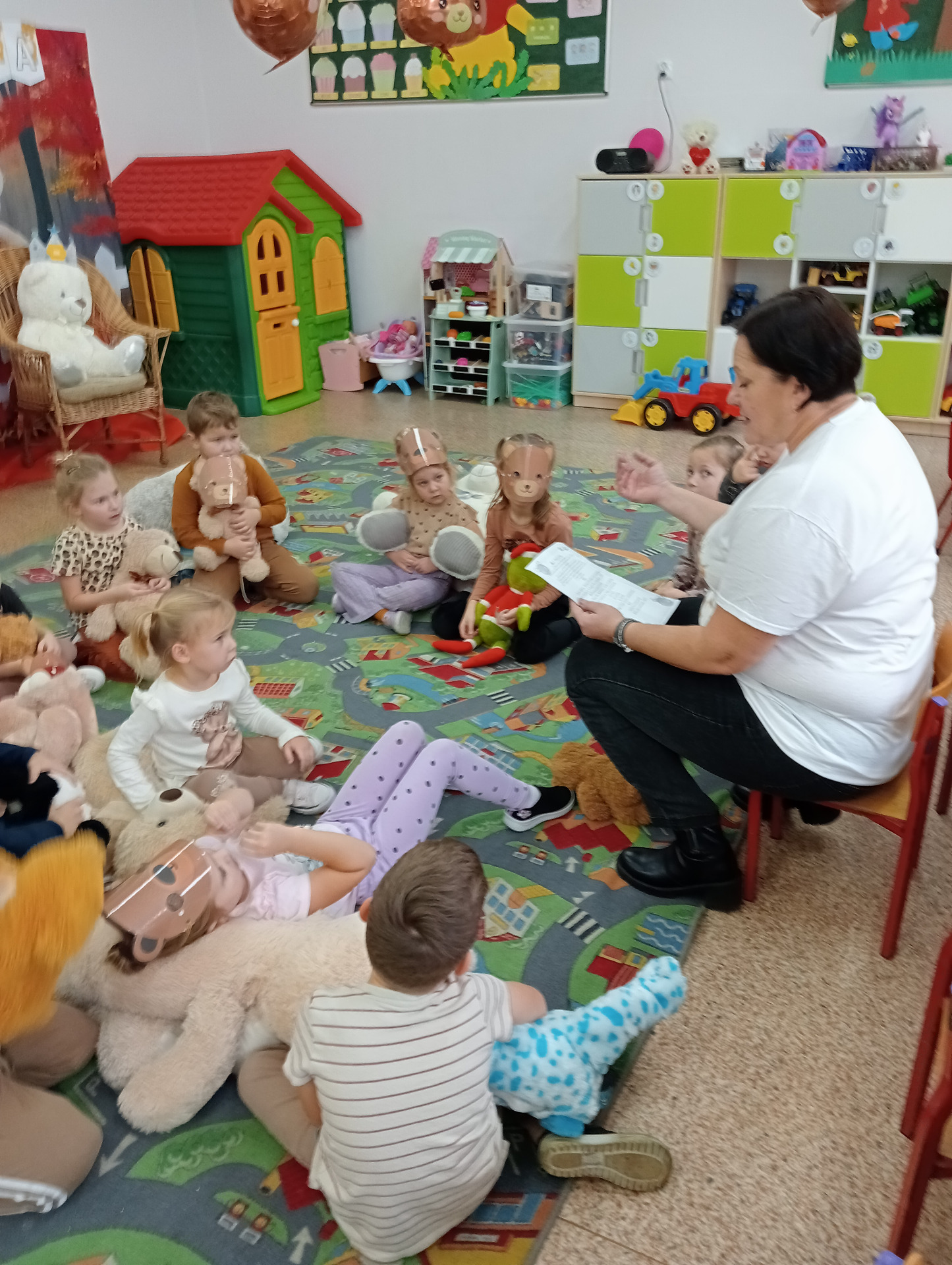 W czasie obchodów wszyscy pluszowi „goście honorowi” zostali uroczyście uczczeni — dzieci, wraz z Panią Dyrektor, odśpiewały im gromkie „Sto lat!” 🎤🥳🐻.