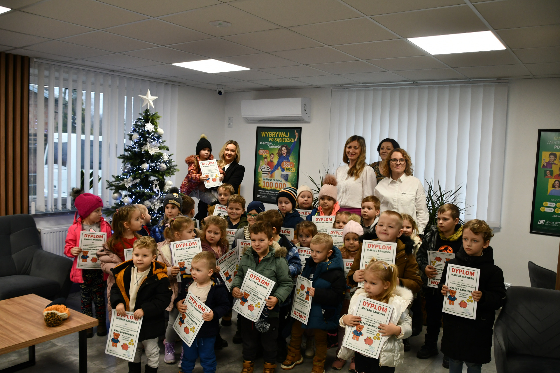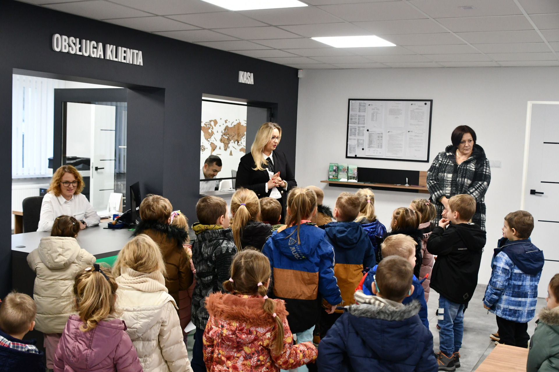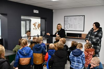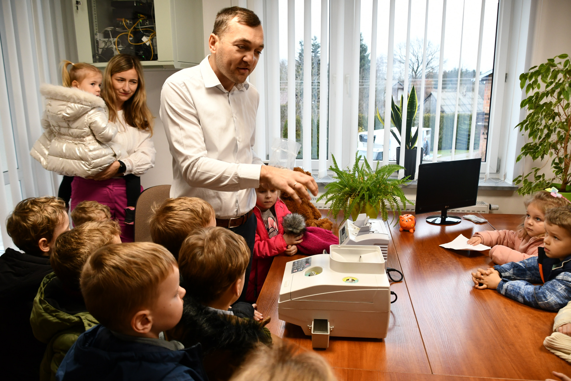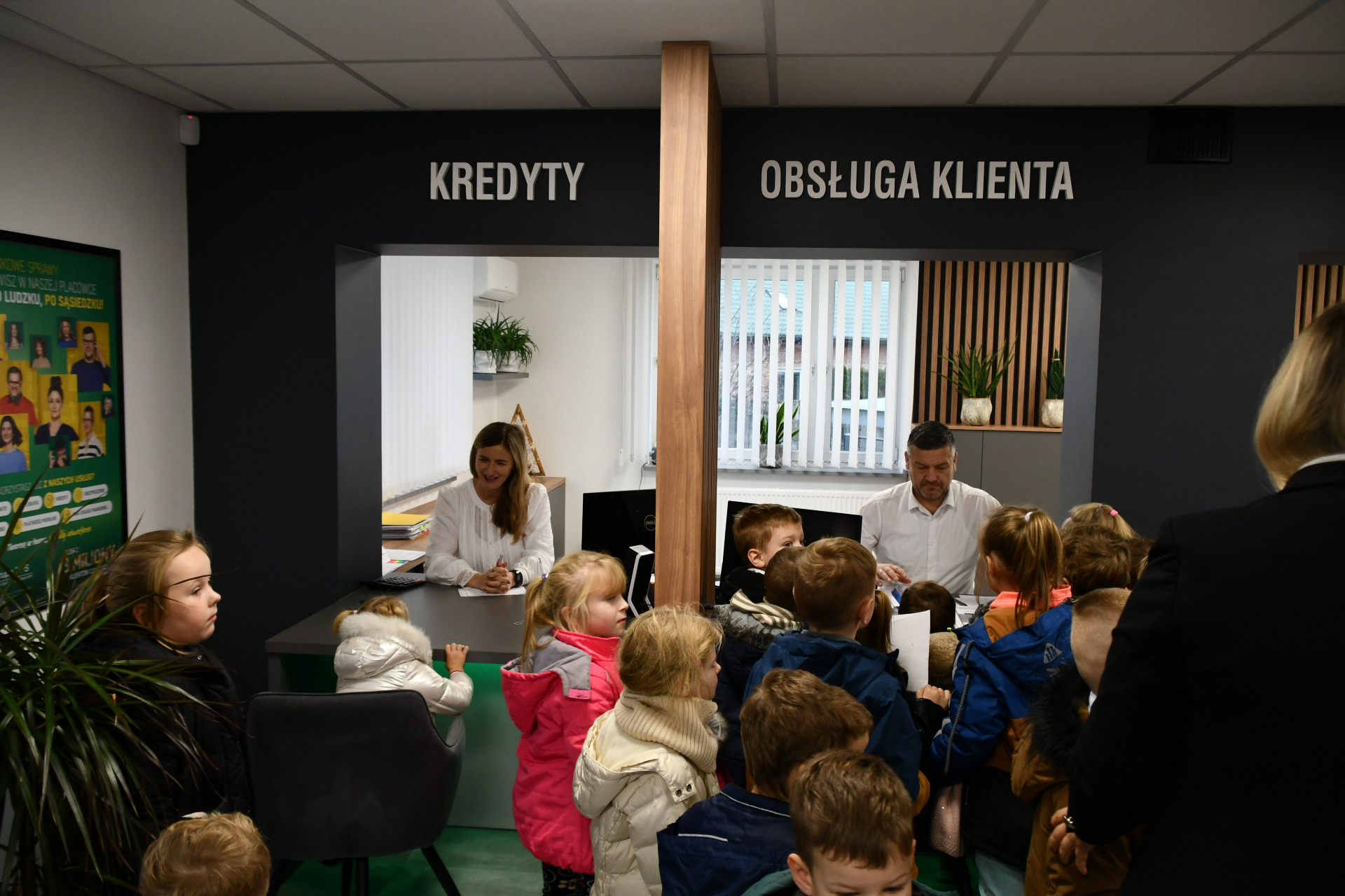 Ostatnim punktem była wizyta w Banku Spółdzielczym, gdzie czekało na nich niezwykle ciekawe i edukacyjne spotkanie. Przedszkolaki dowiedziały się, czym jest konto, jak działa bankomat, do czego służy karta płatnicza i dlaczego warto oszczędzać. Dzieci mogły także zobaczyć z bliska, jak wygląda codzienna praca w banku, co wzbudziło ich ogromną ciekawość.