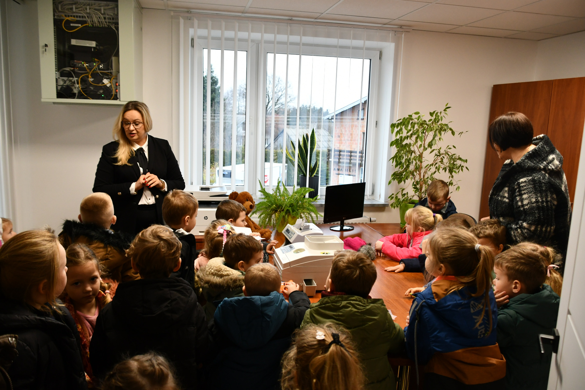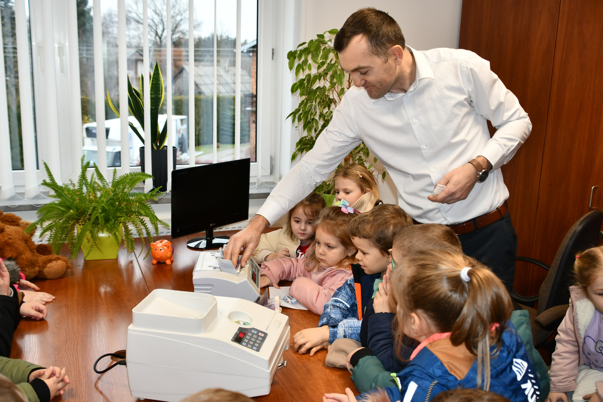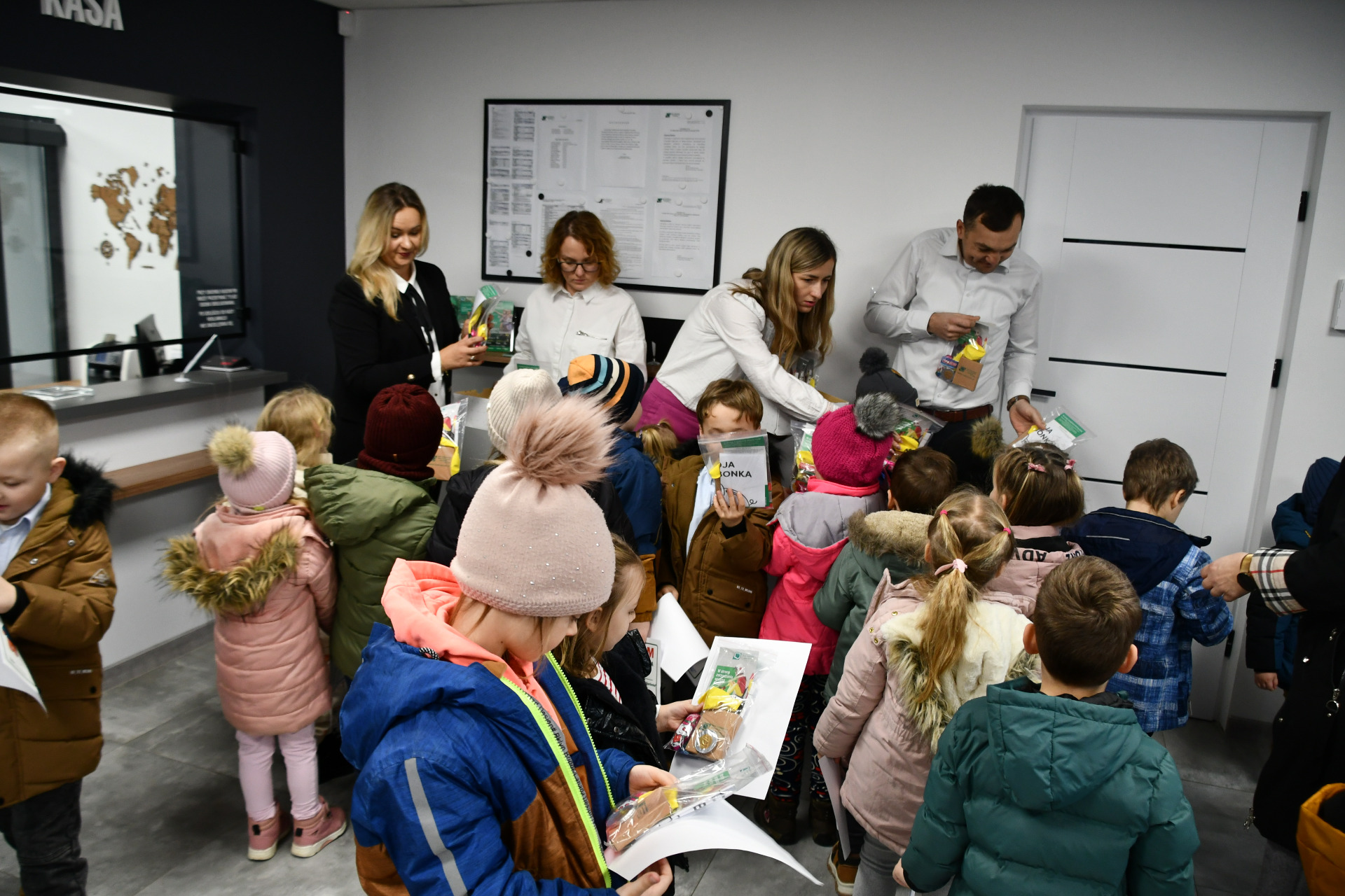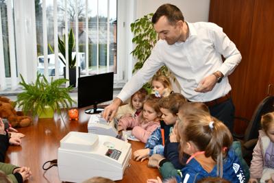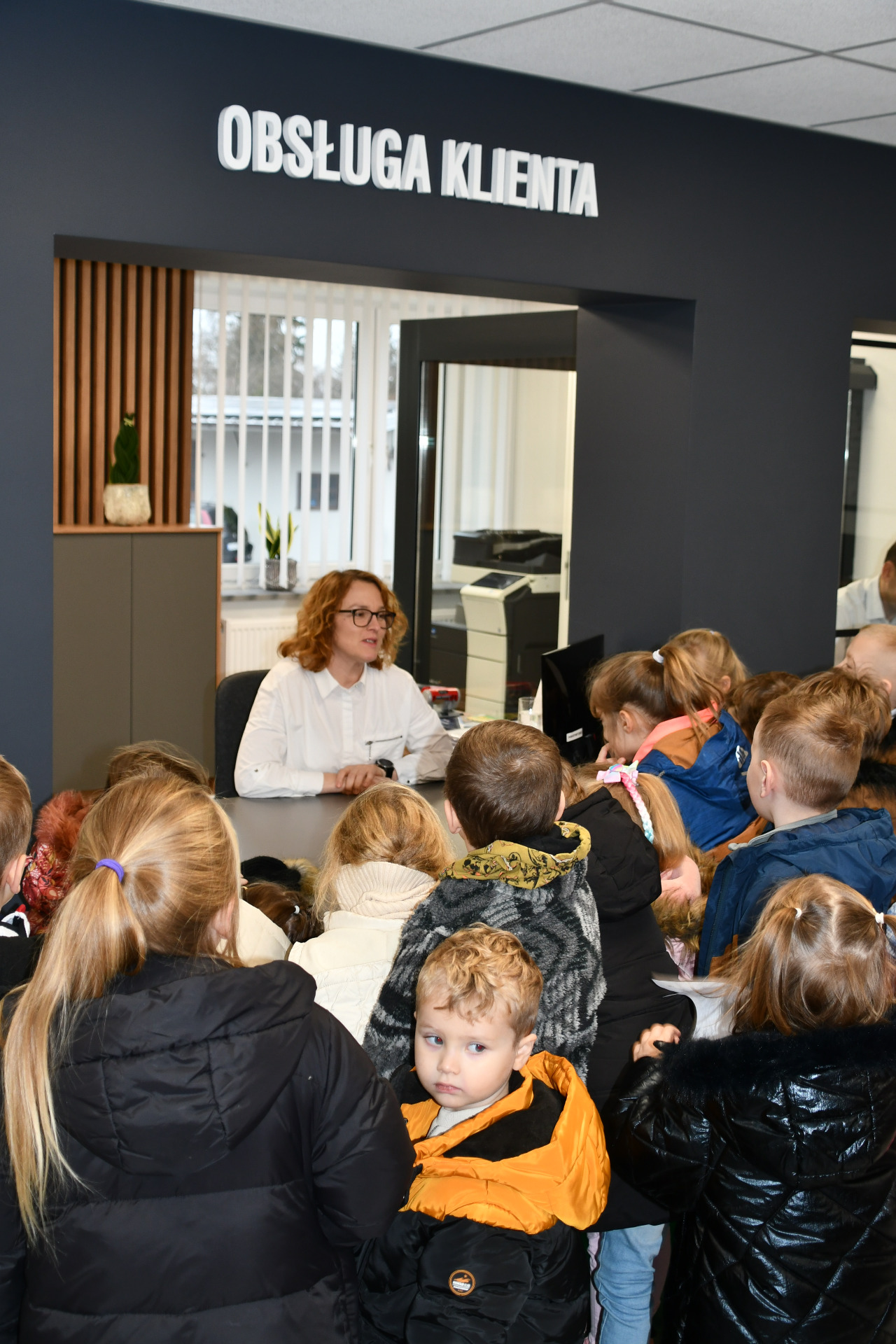 Ostatnim punktem była wizyta w Banku Spółdzielczym, gdzie czekało na nich niezwykle ciekawe i edukacyjne spotkanie. Przedszkolaki dowiedziały się, czym jest konto, jak działa bankomat, do czego służy karta płatnicza i dlaczego warto oszczędzać. Dzieci mogły także zobaczyć z bliska, jak wygląda codzienna praca w banku, co wzbudziło ich ogromną ciekawość.
