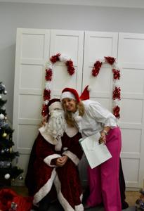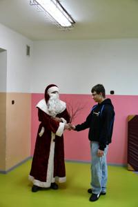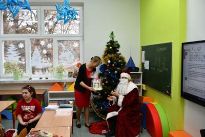 Święty Mikołaj nie zapomniał także o pracownikach szkoły. W tym roku, obok klasowych upominków wręczanych nauczycielom, Mikołaj wraz z Panią Dyrektor zadbali o to, aby nikt nie pozostał bez drobnego podarunku. Dlatego wszystkie dzieci i pracowników szkoły obdarowali słodkimi cukierkami i mandarynkami.