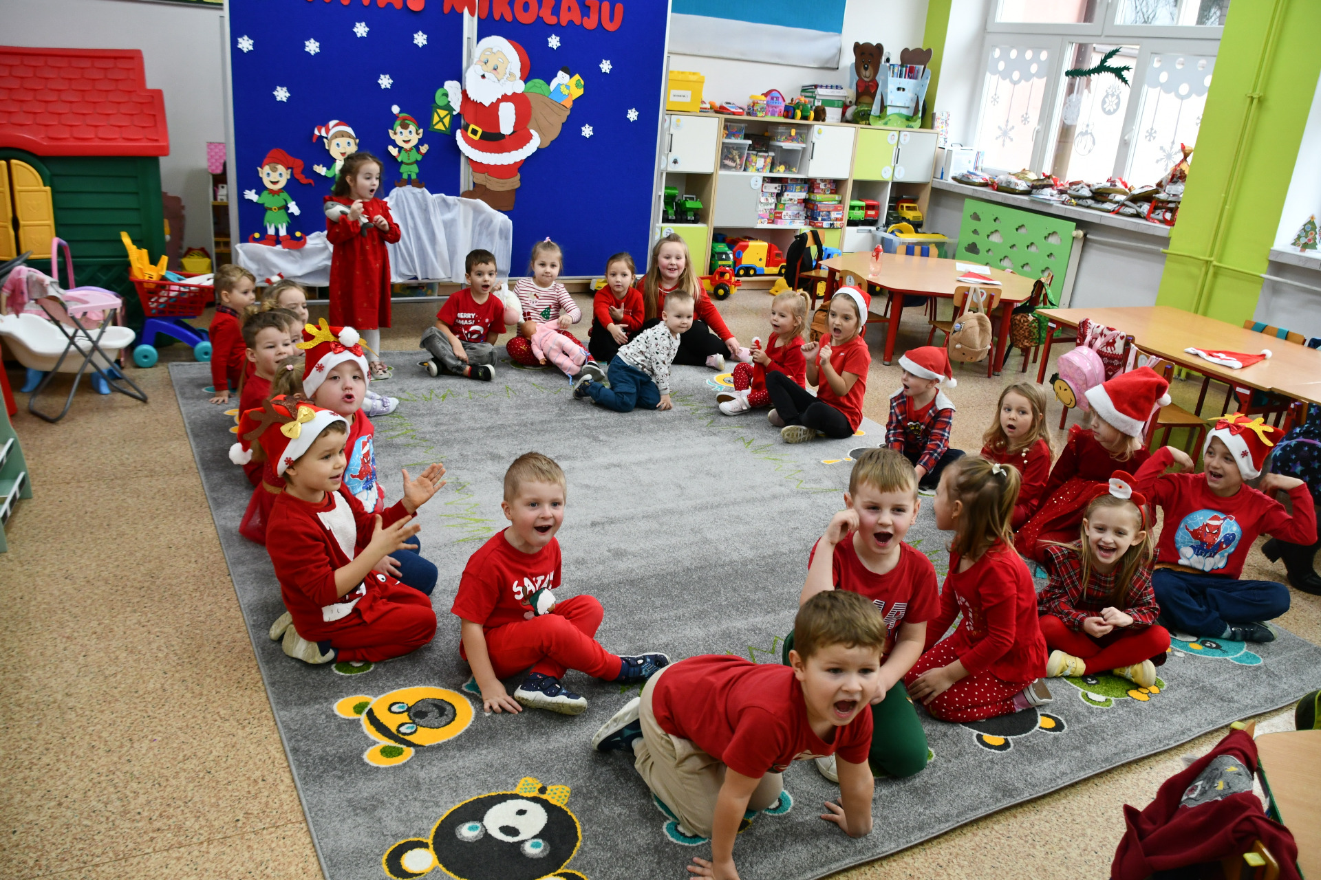 Tego dnia prawdziwa niespodzianka czekała również na młodszą grupę przedszkolną. Gdy dzieci jadły obiad, Mikołaj cichutko wszedł do sali i zostawił im nowy, mięciutki dywan. Kiedy przedszkolaki wróciły do sali i zobaczyły prezent, radości było co niemiara!