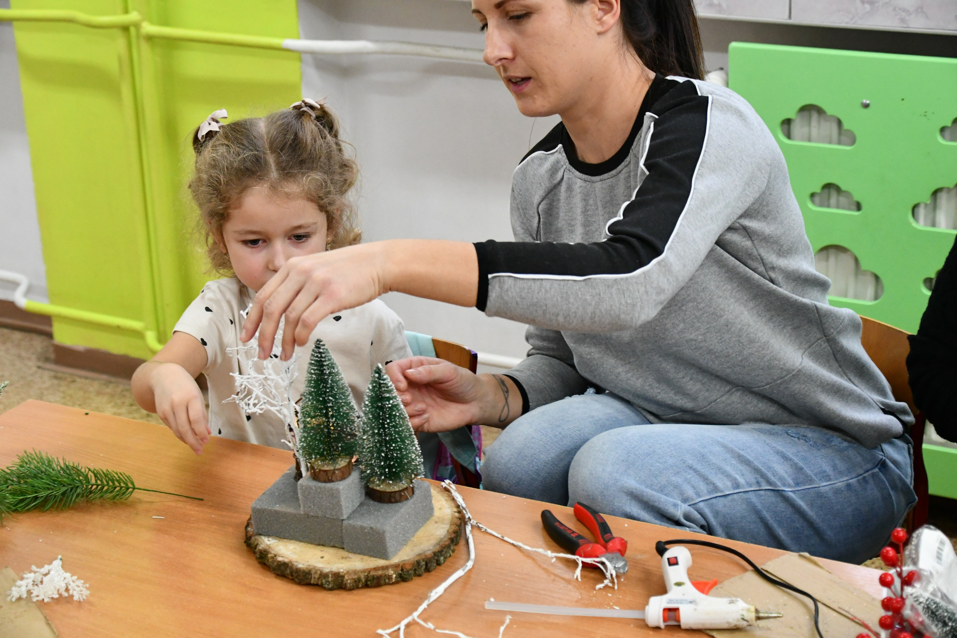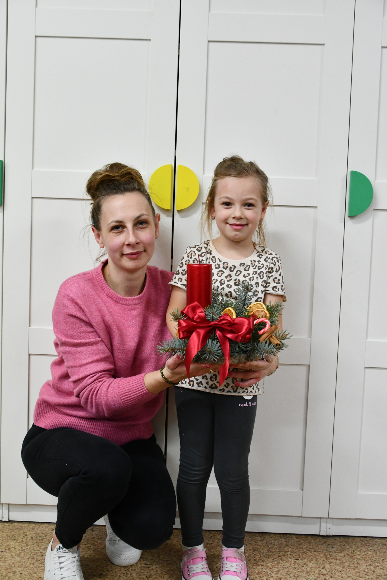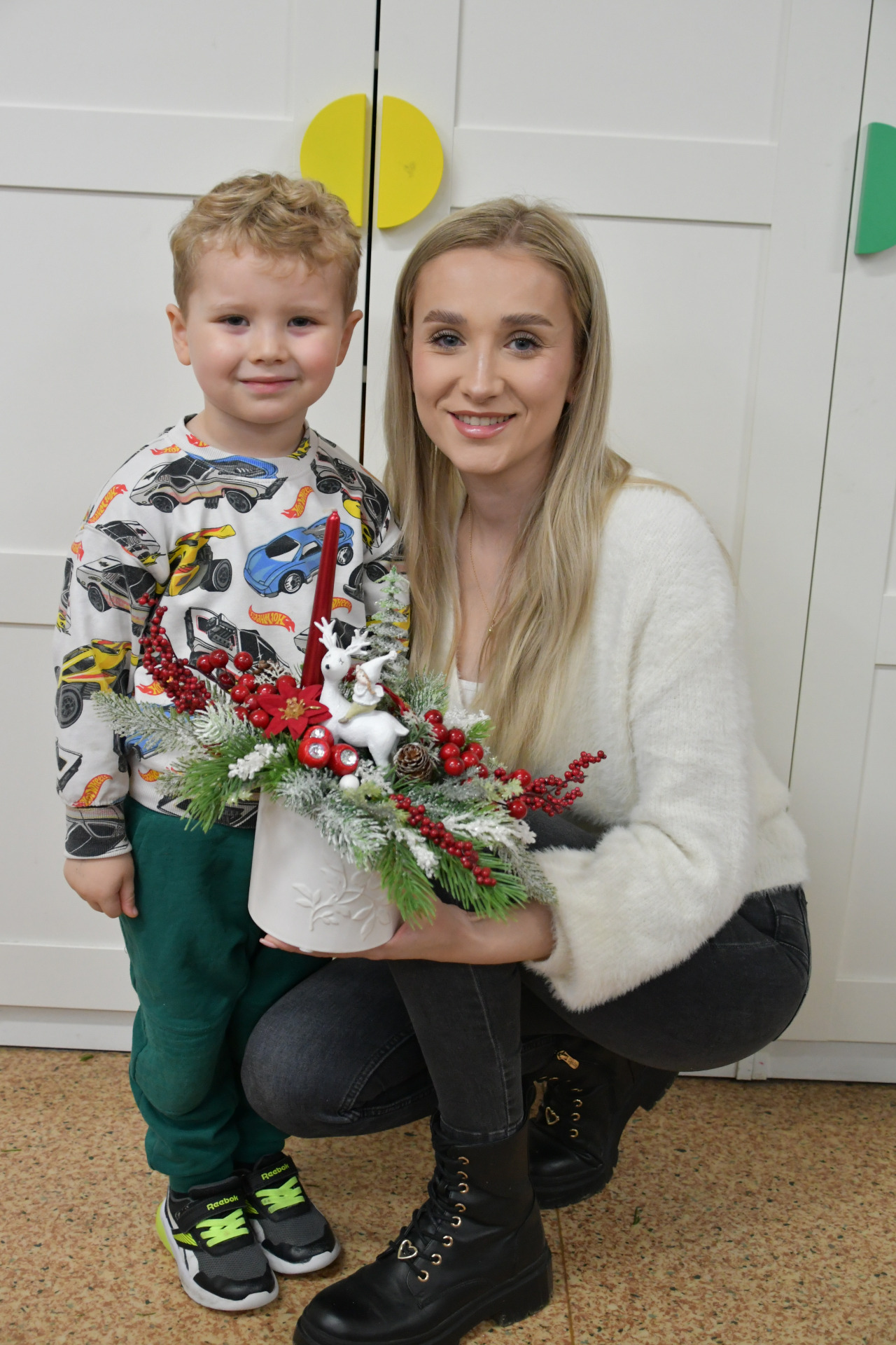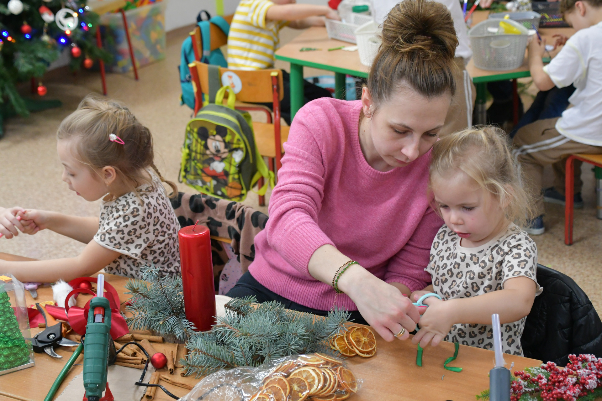 Wspólnie z mamami naszych przedszkolaków tworzyliśmy bożonarodzeniowe stroiki, pielęgnując tradycję wspólnego przygotowywania ozdób, która od pokoleń łączy rodziny. Dzieci z ogromnym zaangażowaniem układały gałązki, dobierały ozdoby i tworzyły kompozycje, które zachwycały pomysłowością. Mamy – jak zawsze – okazały ogromne wsparcie, pomagając w tworzeniu tych małych dzieł sztuki.