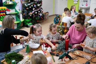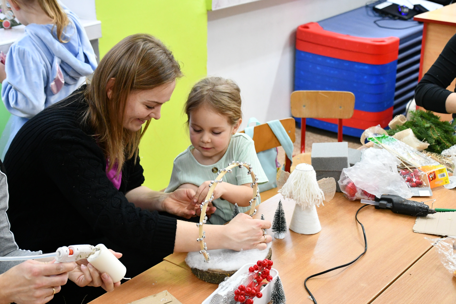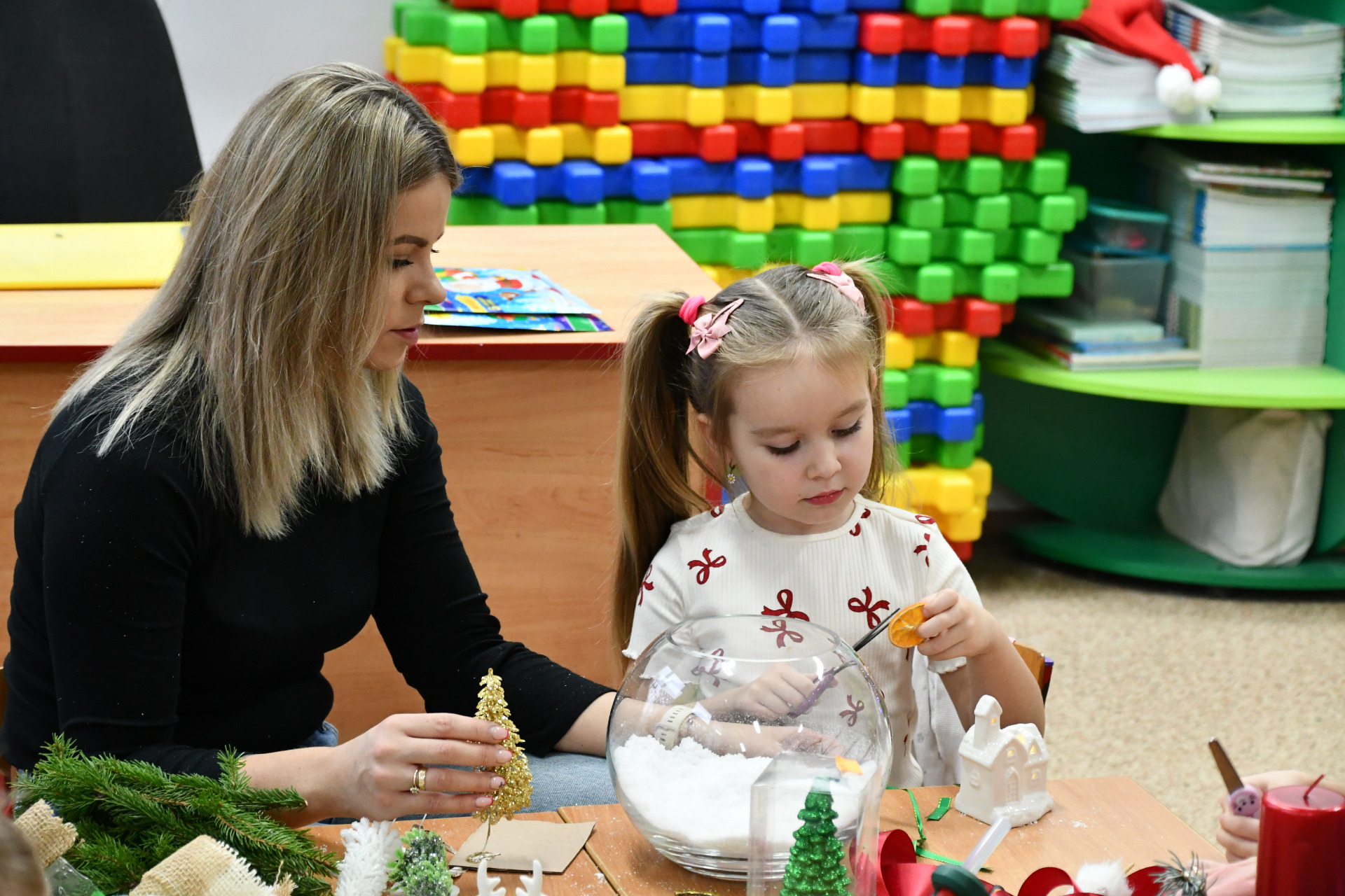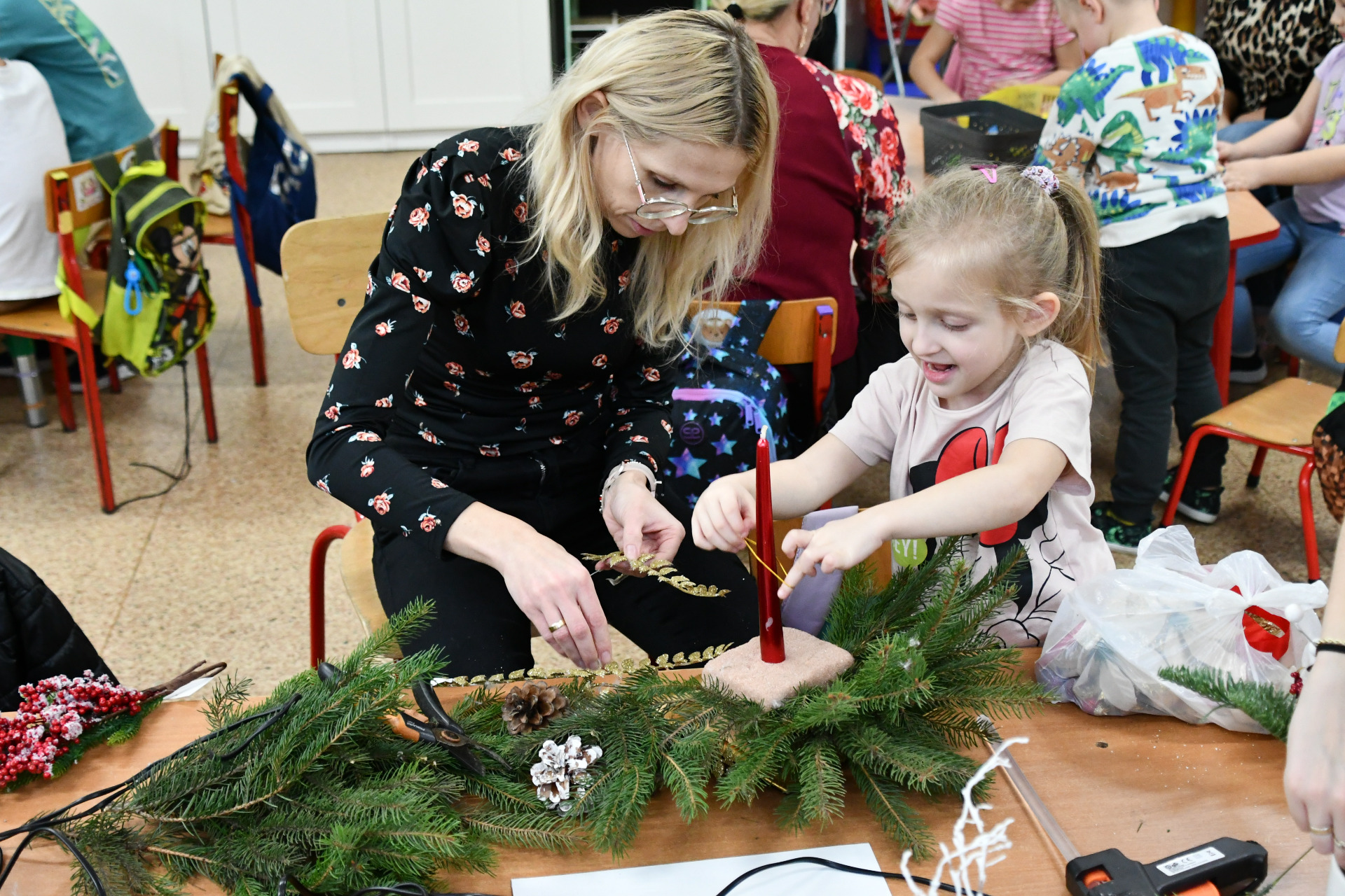 Wspólnie z mamami naszych przedszkolaków tworzyliśmy bożonarodzeniowe stroiki, pielęgnując tradycję wspólnego przygotowywania ozdób, która od pokoleń łączy rodziny. Dzieci z ogromnym zaangażowaniem układały gałązki, dobierały ozdoby i tworzyły kompozycje, które zachwycały pomysłowością. Mamy – jak zawsze – okazały ogromne wsparcie, pomagając w tworzeniu tych małych dzieł sztuki.