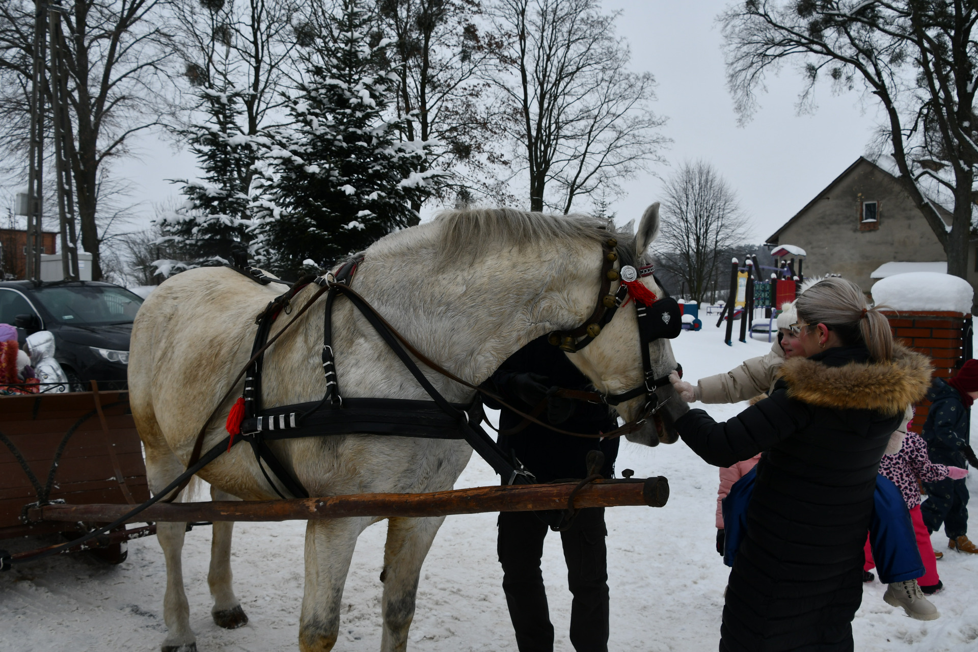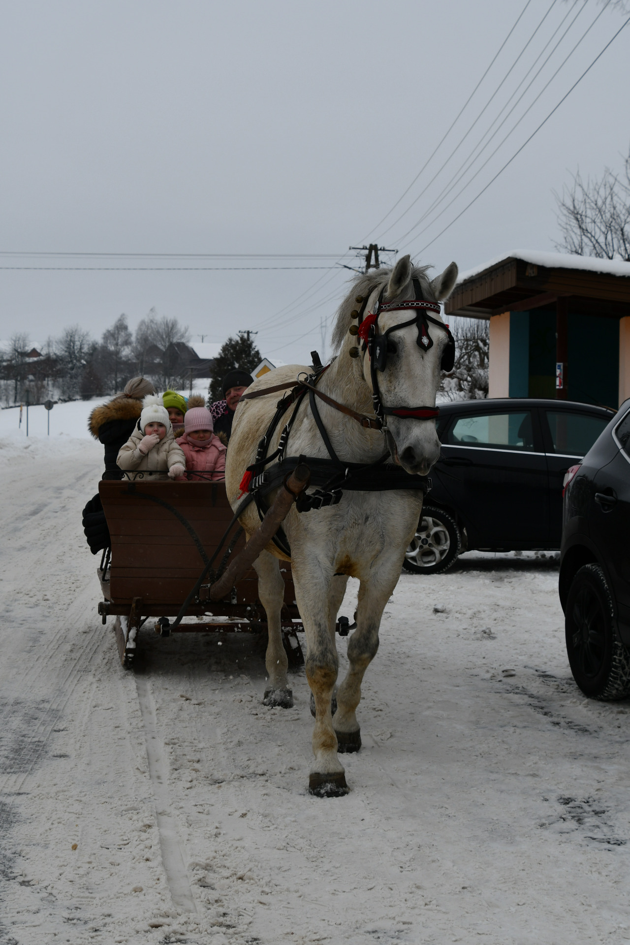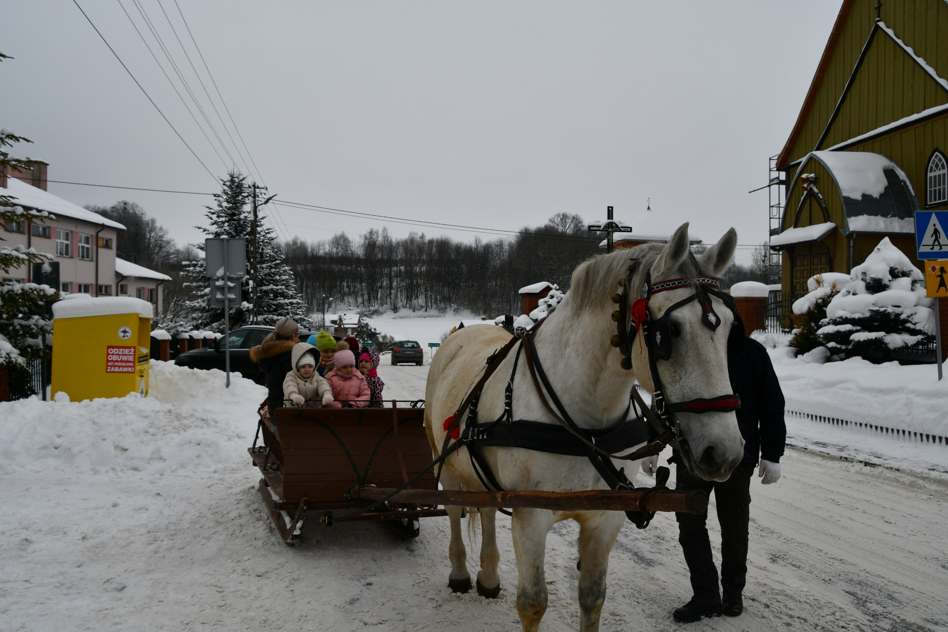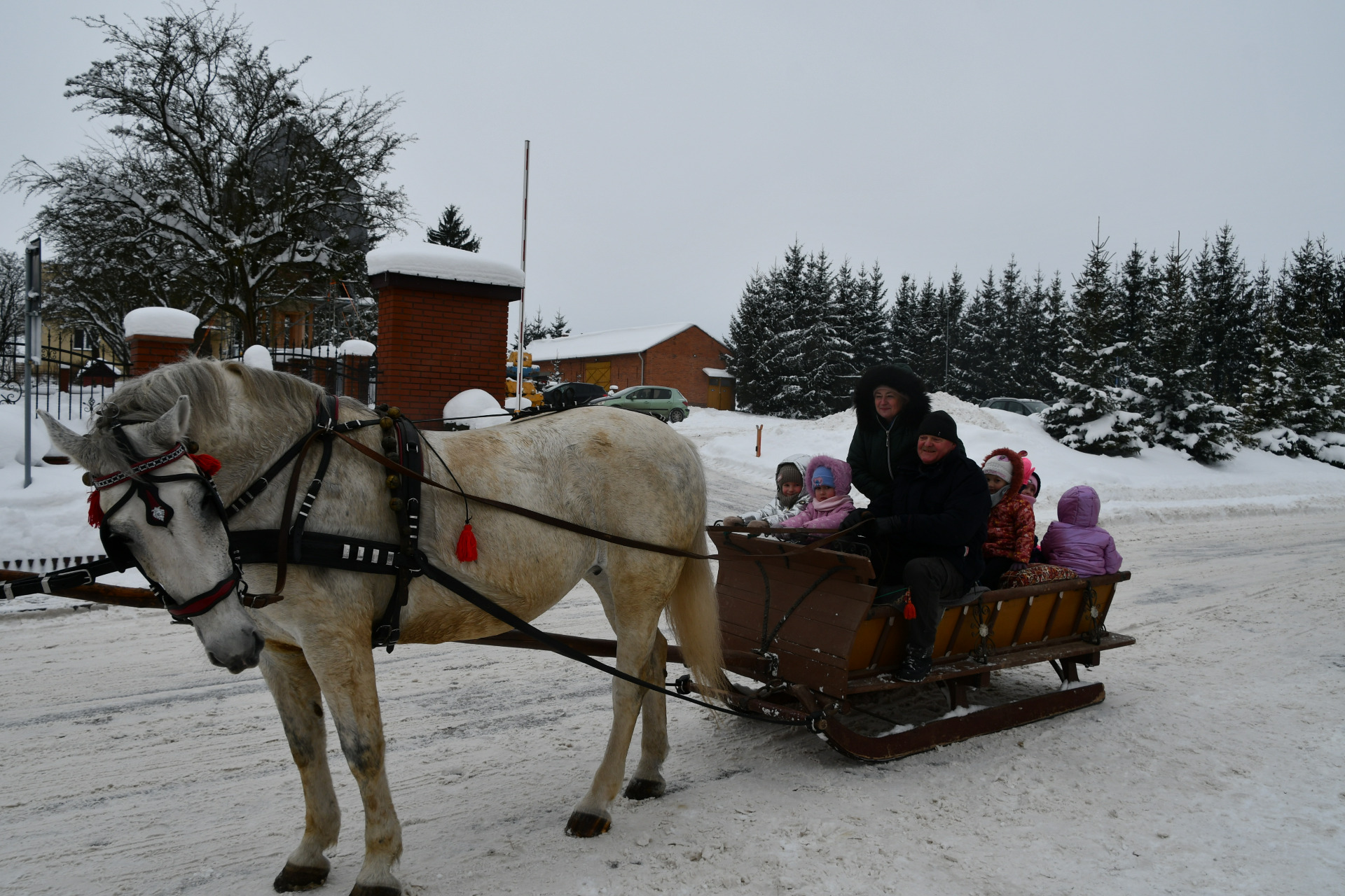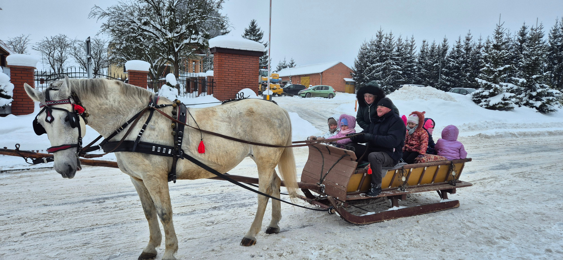 O niezapomnianą atmosferę zadbał woźnica – pan Andrzej Kurczak, dziadek naszych uczniów: Antosia, Luizy, Marcela i Wiktora, a dzielnie sanie ciągnął niezawodny koń Riwiera.